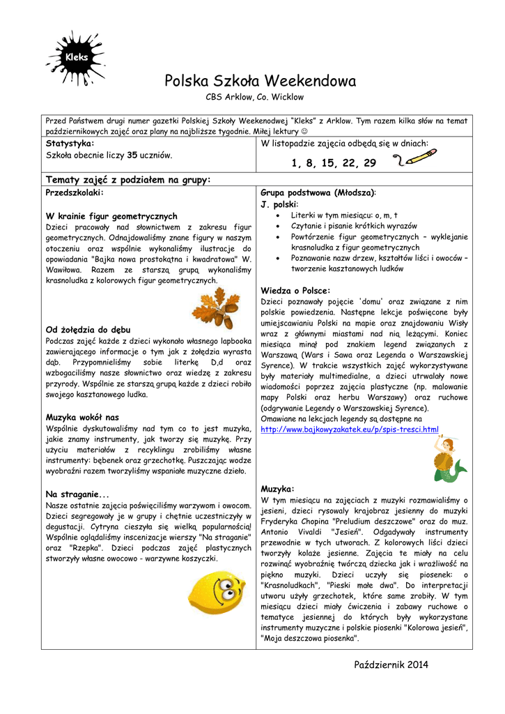 Polska Szkoła Weekendowa CBS Arklow, Co. Wicklow Przed Państwem drugi numer gazetki Polskiej Szkoły Weekenodwej “Kleks” z Arklow. Tym razem kilka słów na temat październikowych zajęć oraz plany na najbliższe tygodnie. Miłej lektury Statystyka: Szkoła obecnie liczy 35 uczniów. W listopadzie zajęcia odbędą się w dniach: 1, 8, 15, 22, 29 Tematy zajęć z podziałem na grupy: Przedszkolaki: W krainie figur geometrycznych Dzieci pracowały nad słownictwem z zakresu figur geometrycznych. Odnajdowaliśmy znane figury w naszym otoczeniu oraz wspólnie wykonaliśmy ilustracje do opowiadania "Bajka nowa prostokątna i kwadratowa" W. Wawiłowa. Razem ze starszą grupą wykonaliśmy krasnoludka z kolorowych figur geometrycznych. Od żołędzia do dębu Podczas zajęć każde z dzieci wykonało własnego lapbooka zawierającego informacje o tym jak z żołędzia wyrasta dąb. Przypomnieliśmy sobie literkę D,d oraz wzbogaciliśmy nasze słownictwo oraz wiedzę z zakresu przyrody. Wspólnie ze starszą grupą każde z dzieci robiło swojego kasztanowego ludka. Muzyka wokół nas Wspólnie dyskutowaliśmy nad tym co to jest muzyka, jakie znamy instrumenty, jak tworzy się muzykę. Przy użyciu materiałów z recyklingu zrobiliśmy własne instrumenty: bębenek oraz grzechotkę. Puszczając wodze wyobraźni razem tworzyliśmy wspaniałe muzyczne dzieło. Na straganie... Nasze ostatnie zajęcia poświęciliśmy warzywom i owocom. Dzieci segregowały je w grupy i chętnie uczestniczyły w degustacji. Cytryna cieszyła się wielką popularnością! Wspólnie oglądaliśmy inscenizacje wierszy "Na straganie" oraz "Rzepka". Dzieci podczas zajęć plastycznych stworzyły własne owocowo - warzywne koszyczki. Grupa podstwowa (Młodsza): J. polski: Literki w tym miesiącu: o, m, t Czytanie i pisanie krótkich wyrazów Powtórzenie figur geometrycznych – wyklejanie krasnoludka z figur geometrycznych Poznawanie nazw drzew, kształtów liści i owoców – tworzenie kasztanowych ludków Wiedza o Polsce: Dzieci poznawały pojęcie 'domu' oraz związane z nim polskie powiedzenia. Następne lekcje poświęcone były umiejscawianiu Polski na mapie oraz znajdowaniu Wisły wraz z głównymi miastami nad nią leżącymi. Koniec miesiąca minął pod znakiem legend związanych z Warszawą (Wars i Sawa oraz Legenda o Warszawskiej Syrence). W trakcie wszystkich zajęć wykorzystywane były materiały multimedialne, a dzieci utrwalały nowe wiadomości poprzez zajęcia plastyczne (np. malowanie mapy Polski oraz herbu Warszawy) oraz ruchowe (odgrywanie Legendy o Warszawskiej Syrence). Omawiane na lekcjach legendy są dostępne na http://www.bajkowyzakatek.eu/p/spis-tresci.html Muzyka: W tym miesiącu na zajęciach z muzyki rozmawialiśmy o jesieni, dzieci rysowaly krajobraz jesienny do muzyki Fryderyka Chopina "Preludium deszczowe" oraz do muz. Antonio Vivaldi "Jesień". Odgadywały instrumenty przewodnie w tych utworach. Z kolorowych liści dzieci tworzyły kolaże jesienne. Zajęcia te miały na celu rozwinąć wyobraźnię twórczą dziecka jak i wrażliwość na piękno muzyki. Dzieci uczyły się piosenek: o "Krasnoludkach", "Pieski małe dwa". Do interpretacji utworu użyły grzechotek, które same zrobiły. W tym miesiącu dzieci miały ćwiczenia i zabawy ruchowe o tematyce jesiennej do których były wykorzystane instrumenty muzyczne i polskie piosenki "Kolorowa jesień", "Moja deszczowa piosenka". Październik 2014 Polska Szkoła Weekendowa CBS Arklow, Co. Wicklow Grupa średnio – zaawansowna (Starsza) J. polski: Profil na portalu społecznościowym: dane osobowe zasady korzystania z internetu (bezpieczenstwo i etykieta) emotikony Znaki: gesty, symbole rysunkowe, dźwiękowe i słowa. Nadawca - odbiorca, redagowanie ogłoszenia. Narrator. Pojęcie szyfru, tworzenie własnego szyfru. Poznawanie nazw drzew, kształtów liści i owoców – tworzenie kasztanowych ludków. W październiku urodziny obchodziły: Adrianna i Amelia Plany, plany... Andrzejki 29 listopada od 17 – 19 w sali gimnastycznej CBS. Jest to impreza Rodzinna dla naszych uczniów i ich Rodziców oraz zaproszonych przez Szkołę gości. Będziemy wróżyć z wosku i nie tylko ... PROSIMY NIE ZOSTAWIAĆ DZIECI SAMYCH, PONIEWAŻ W CZASIE ZABAWY NIE BĘDZIEMY W STANIE ZAPEWNIĆ IM NALEŻYTEJ OPIEKI. Wiedza o Polsce: Na początku miesiąca uczniowie poznali znaczenie słowa 'imigrant' oraz omawiali możliwe przyczyny wyjazdów emigracyjnych. Omawiano również strukturę imigracji do Polski oraz Irlandii. Kolejne lekcje minęły pod znakiem poznawania legend o najdawniejszych dziejach Polski (O Lechu, Czechu i Rusie, O Piaście Kołodzieju, O Popielu oraz o Warsie i Sawie). Koniec miesiąca poświęcony był wprowadzaniu do pojęcia historii, jako nauki zajmującej się badaniem przeszłości. W trakcie zajęć wykorzystywane były materiały multimedialne oraz zachęcano uczniów do otwartej dyskusji (praca w kole zamiast tradycyjnych ławek). Uczniowie zachęcani byli również do samodzielnej prezentacji zdobytej wiedzy swoim kolegom we współpracy z nauczycielem. Muzyka: W tym miesiącu na zajęciach rozmawialiśmy o kontrastach w muzyce, dzieci słuchały: "Burzliwy wieczór na wybrzeżu" Edvarda Grieg, Fryderyka Chopina "Preludium e-moll" (odgadywały przewodni instrument w tym utworze), polskich piosenek "Już październik", "To już jesień", wykonywały ćwiczenia związane z tymi utworami. Celem zajęć jest rozwijanie wyobraźni twórczej oraz kształtowanie wrażliwości na piękno muzyki. Powtarzały wartości nut i uczyły się rysować klucz wiolinowy. Wykonywały na flecie piosenkę "Pieski małe dwa", wykorzystały swoje instrumenty (grzechotki). Mikołajki. Każde z dzieci wylosuje imię swojego szkolnego kolegi/koleżanki aby na dzień 6 grudnia przynieść dla niego/niej drobny prezent. Limit cenowy do 2e. Prezenty zbierzemy rano przed rozpoczęciem zajęć, aby rozdać je w czasie przerwy śniadaniowej. Konc