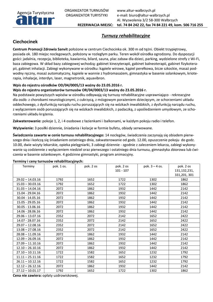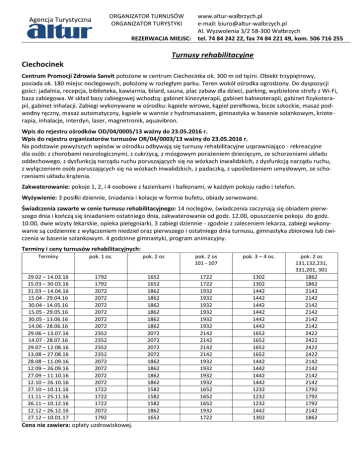 ORGANIZATOR TURNUSÓW ORGANIZATOR TURYSTYKI www.altur-walbrzych.pl e-mail: [email protected] Al. Wyzwolenia 3/2 58-300 Wałbrzych REZERWACJA MIEJSC: tel. 74 84 242 22, fax 74 84 221 49, kom. 506 716 255 Agencja Turystyczna Turnusy rehabilitacyjne Ciechocinek Centrum Promocji Zdrowia Sanvit położone w centrum Ciechocinka ok. 300 m od tężni. Obiekt trzypiętrowy, posiada ok. 180 miejsc noclegowych, położony w rozległym parku. Teren wokół ośrodka ogrodzony. Do dyspozycji gości: jadalnia, recepcja, biblioteka, kawiarnia, bilard, sauna, plac zabaw dla dzieci, parking, wydzielone strefy z Wi-Fi, baza zabiegowa. W skład bazy zabiegowej wchodzą: gabinet kinezyterapii, gabinet balneoterapii, gabinet fizykoterapii, gabinet inhalacji. Zabiegi wykonywane w ośrodku: kąpiele wirowe, kąpiel perełkowa, bicze szkockie, masaż podwodny ręczny, masaż automatyczny, kąpiele w wannie z hydromasażem, gimnastyka w basenie solankowym, krioterapia, inhalacje, interdyn, laser, magnetronik, aquavibron. Wpis do rejestru ośrodków OD/04/0005/13 ważny do 23.05.2016 r. Wpis do rejestru organizatorów turnusów OR/04/0003/13 ważny do 23.05.2016 r. Na podstawie powyższych wpisów w ośrodku odbywają się turnusy rehabilitacyjne usprawniająco - rekreacyjne dla osób: z chorobami neurologicznymi, z cukrzycą, z mózgowym porażeniem dziecięcym, ze schorzeniami układu oddechowego, z dysfunkcją narządu ruchu poruszających się na wózkach inwalidzkich, z dysfunkcją narządu ruchu, z wyłączeniem osób poruszających się na wózkach inwalidzkich, z padaczką, z upośledzeniem umysłowym, ze schorzeniami układu krążenia. Zakwaterowanie: pokoje 1, 2, i 4 osobowe z łazienkami i balkonami, w każdym pokoju radio i telefon. Wyżywienie: 3 posiłki dziennie, śniadania i kolacje w formie bufetu, obiady serwowane. Świadczenia zawarte w cenie turnusu rehabilitacyjnego: 14 noclegów, świadczenia zaczynają się obiadem pierwszego dnia i kończą się śniadaniem ostatniego dnia, zakwaterowanie od godz. 12.00, opuszczenie pokoju do godz. 10.00, dwie wizyty lekarskie, opieka pielęgniarki, 3 zabiegi dziennie - zgodnie z zaleceniem lekarza, zabiegi wykonywanie są codziennie z wyłączeniem niedziel oraz pierwszego i ostatniego dnia turnusu, gimnastyka zbiorowa lub ćwiczenia w basenie solankowym. 4 godzinne gimnastyki, program animacyjny. Terminy i ceny turnusów rehabilitacyjnych: Terminy pok. 1 os. pok. 2 os pok. 2 os 101 - 107 pok. 3 – 4 os. 29.02 – 14.03.16 15.03 – 30.03.16 31.03 – 14.04.16 15.04 - 29.04.16 30.04 - 14.05.16 15.05 - 29.05.16 30.05 - 13.06.16 14.06 - 28.06.16 29.06 – 13.07.16 14.07 - 28.07.16 29.07 – 12.08.16 13.08 – 27.08.16 28.08 – 11.09.16 12.09 – 26.09.16 27.09 – 11.10.16 12.10 – 26.10.16 27.10 – 10.11.16 11.11 – 25.11.16 26.11 – 10.12.16 12.12 – 26.12.16 27.12 – 10.01.17 1792 1792 2072 2072 2072 2072 2072 2072 2352 2352 2352 2352 2072 2072 2072 2072 1722 1722 1722 2072 1792 1652 1652 1862 1862 1862 1862 1862 1862 2072 2072 2072 2072 1862 1862 1862 1862 1582 1582 1582 1862 1652 1722 1722 1932 1932 1932 1932 1932 1932 2142 2142 2142 2142 1932 1932 1932 1932 1652 1652 1652 1932 1722 1302 1302 1442 1442 1442 1442 1442 1442 1652 1652 1652 1652 1442 1442 1442 1442 1232 1232 1232 1442 1302 Cena nie zawiera: opłaty uzdrowiskowej. pok. 2 os 131,132,231, 331,201, 301 1862 1862 2142 2142 2142 2142 2142 2142 2422 2422 2422 2422 2142 2142 2142 2142 1792 1792 1792 2142 1862