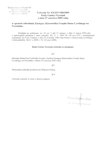 Rada Gminy Fryaztak 38-130 Frysztak ul. Księdza Blajera 20 woj. podkarpackie Uchwała Nr XXXIV/l80/2005 Rady Gminy Frysztak z dnia 27 czerwca 2005 roku w sprawie odwołania Zastępcy Kierownika Urzędu Stanu Cywilnego we Frysztaku. Działając na podstawie art. 18 ust. 2 pkt 15, ustawy z dnia 8 marca 1990 roku o samorządzie gminnym ( tekst jednolity: Dz. U. z 2001 Nr 142 poz. 1591 z późniejszymi zmianami), art.6 ust.3 ustawy z dnia 29 września 1986 roku Prawo o aktach stanu cywilnego ( tekst jednolity: Dz.U. z 2004 r. Nr 161 poz. 1688), Rada Gminy Frysztak uchwala co następuje: §1 Odwołać Panią Ewę Lichwała-Armata z funkcji Zastępcy Kierownika Urzędu Stanu Cywilnego we Frysztaku z dniem 30 czerwca 2005 roku. §2 Wykonanie uchwały powierza się Wójtowi Gminy. §3 Uchwała wchodzi w życie z dniem podjęcia.
