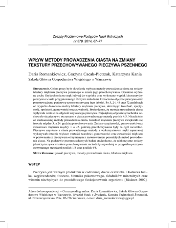 Zeszyty Problemowe Postępów Nauk Rolniczych nr 579, 2014, 67–77 WPŁYW METODY PROWADZENIA CIASTA NA ZMIANY TEKSTURY PRZECHOWYWANEGO PIECZYWA PSZENNEGO Daria Romankiewicz, Grażyna Cacak-Pietrzak, Katarzyna Kania Szkoła Główna Gospodarstwa Wiejskiego w Warszawie Streszczenie. Celem pracy było określenie wpływu metody prowadzenia ciasta na zmiany tekstury miękiszu pieczywa pszennego w czasie jego przechowywania. Oceniono wybrane cechy fizykochemiczne mąki użytej do wypieku oraz wykonano wypiek laboratoryjny pieczywa z ciasta przygotowanego różnymi metodami. Oznaczono objętość pieczywa oraz przeprowadzono punktową ocenę sensoryczną jego jakości. Po 3, 24, 48 oraz 72 godzinach od wypieku dokonano analizy tekstury miękiszu pieczywa, określając: twardość, sprężystość, spoistość, gumowatość oraz żuwalność. Stwierdzono, że metoda prowadzenia ciasta wpływała istotnie na objętość uzyskanego pieczywa. Największą objętością bochenka cechowało się pieczywo otrzymane z ciasta prowadzonego metodą poolish 4/5. Niezależnie od zastosowanej metody prowadzenia ciasta, twardość miękiszu pieczywa zwiększała się istotnie między 3. a 24. godziną przechowywania. Zmiany sprężystości, gumowatości oraz żuwalności miękiszu między 3. a 72. godziną przechowywania były na ogół nieistotne. Pieczywo uzyskane z ciasta prowadzonego metodą z wykorzystaniem mąki zaparzanej wykazywało istotnie większe wartości twardości, gumowatości oraz żuwalności miękiszu w porównaniu z pieczywem otrzymanym z zastosowaniem pozostałych metod prowadzenia ciasta. Na podstawie przeprowadzonych badań stwierdzono, że niekorzystne zmiany jakości pieczywa w trakcie przechowywania zachodziły najwolniej w przypadku pieczywa otrzymanego metodami poolish 1/3 oraz poolish 4/5. Słowa kluczowe: jakość pieczywa, metody prowadzenia ciasta, tekstura miękiszu WSTĘP Pieczywo jest ważnym produktem w codziennej diecie człowieka. Dostarcza białka, węglowodanów, tłuszczu, błonnika pokarmowego, składników mineralnych oraz witamin niezbędnych do prawidłowego funkcjonowania organizmu [Räsänen 2007]. Adres do korespondencji – Corresponding author: Daria Romankiewicz, Szkoła Główna Gospodarstwa Wiejskiego w Warszawie, Wydział Nauk o Żywieniu, Katedra Technologii Żywności, ul. Nowoursynowska 159c, 02-776 Warszawa, e-mail: [email protected] 68 D. Romankiewicz, G. Cacak-Pietrzak, K. Kania W 2012 roku spożycie pieczywa w Polsce wynosiło 52 kg na osobę, w tym pieczywa pszennego – ok. 11 kg na osobę [Rynek Zbóż 2013]. Pieczywo, zwłaszcza pszenne, jest produktem, który podczas przechowywania ulega niekorzystnym zmianom sensorycznym wywołanym przez procesy fizykochemiczne oraz biochemiczne [Katina i in. 2006, Piesiewicz 2011, 2013, Romankiewicz i in. 2013a]. Szybkość tych zmian zależy od użytych surowców, jak również od zastosowanych podczas produkcji procesów technologicznych. Katina i inni [2006] oraz Różyło i Laskowski [2009] wykazali, że zmiany tekstury pieczywa pszennego w trakcie jego przechowywania zależą m.in. od metody prowadzenia ciasta (bezpośrednia, pośrednia). W badaniach Crowleya i innych [2002] na teksturę pieczywa wpływał dodatek zakwasu pszennego. Celem niniejszej pracy było określenie wpływu metody prowadzenia ciasta na zmiany tekstury miękiszu pieczywa pszennego w czasie jego przechowywania. MATERIAŁ I METODY Materiał badawczy stanowiło pieczywo uzyskane z handlowej mąki pszennej typu 550 wyprodukowanej przez Polskie Młyny S.A. Określono cechy fizykochemiczne mąki, takie jak: wodochłonność [PN-ISO 5530-1: 1999] przy użyciu Farinografu (Brabender® GmbH&Co. KG), ilość i jakość glutenu w urządzeniu Glutomatic 2200 (Perten Instruments) [PN-A-74042-3/A1: 1996] oraz liczbę opadania za pomocą urządzenia Falling Number 1400 (Perten Instruments) [PN-EN ISO 3093: 2007]. Wypiek laboratoryjny pieczywa przeprowadzono, przygotowując ciasto sześcioma metodami. Receptury oraz schematy technologiczne stosowanych metod prowadzenia ciasta przedstawiono w tabeli 1. Po 24 godzinach od wypieku określono objętość bochenka w przeliczeniu na 100 g pieczywa [Jakubczyk i Haber 1983]. Pięcioosobowy zespół przeprowadził punktową ocenę sensoryczną jakości pieczywa [PN-A-74108]. Oceniono: wygląd zewnętrzny bochenka, cechy skórki (barwa, grubość, pozostałe cechy), cechy miękiszu (elastyczność, porowatość, pozostałe cechy) oraz smak i zapach. Na podstawie sumy uzyskanych punktów pieczywo klasyfikowano w obrębie czterech poziomów jakości (I poziom – liczba punktów od 32 do 28, II poziom – liczba punktów od 27 do 23, III poziom – liczba punktów od 22 do 18 i IV poziom – liczba punktów od 17 do 8). Pieczywo przechowywano w temperaturze ok. 20°C, przykryte folią spożywczą. Po 3, 24, 48 i 72 godzinach od wypieku przeprowadzono ocenę tekstury miękiszu pieczywa przy użyciu analizatora tekstury TA.xT2i, wykorzystując metodę TPA [ang. Texture Profile Analysis]. Test polegał na dwukrotnym ściskaniu próby miękiszu o grubości 30 mm w środkowej części kromki trzpieniem o średnicy 25 mm z prędkością 1 mm·s–1 na głębokość 15 mm [Instrukcja obsługi 1997]. Z otrzymanych wykresów odczytano twardość miękiszu pieczywa oraz obliczono następujące parametry jego tekstury: sprężystość, spoistość, gumowatość oraz żuwalność [Armero i Collar 1997]. Wszystkie oznaczenia przeprowadzono w czterech powtórzeniach. Uzyskane wyniki opracowano statystycznie w programie Statistica 10. Wykonano jednoczynnikową analizę wariancji przy poziomie istotności α = 0,05. Grupy homogeniczne określono testem Tukeya. Zeszyty Problemowe Postępów Nauk Rolniczych Tabela 1. Receptury i schematy technologiczne stosowanych metod prowadzenia ciasta Table 1. Recipes and technological schemes used in different methods of dough preparation Metoda prowadzenia ciasta – Dough preparation 