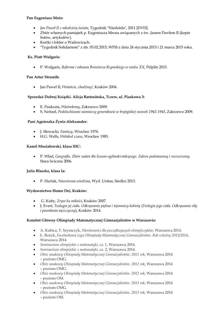 Pan Eugeniusz Mróz: Jan Paweł II z młodzieżą świata, Tygodnik "Niedziela", 2011 [DVD]. Zbiór własnych pamiątek p. Eugeniusza Mroza związanych z św. Janem Pawłem II (kopie listów, artykułów). Kartki i folder o Wadowicach. "Tygodnik Solidarność" z dn. 05.02.2015; WPiS z dnia 24 stycznia 2015 i 21 marca 2015 roku. Ks. Piotr Wulgaris: P. Wulgaris, Reforma i odnowa Brewiarza Rzymskiego w wieku XX, Pelplin 2015. Pan Artur Strumik: Jan Paweł II, Wstańcie, chodźmy!, Kraków 2004. Sprzedaż Dobrej Książki. Alicja Bartosińska, Tczew, ul. Piaskowa 3: E. Paukszta, Wiatrołomy, Zakrzewo 2009. S. Neitzel, Podsłuchiwani niemieccy generałowie w brytyjskiej niewoli 1942-1945, Zakrzewo 2009. Pani Agnieszka Żynis-Aleksander: J. Słowacki, Fantazy, Wrocław 1976. H.G. Wells, Wehikuł czasu, Wrocław 1985. Kamil Musiałowski, klasa IIIC: P. Wład, Geografia. Zbiór zadań dla liceum ogólnokształcącego. Zakres podstawowy i rozszerzony, Stara Iwiczna 2006. Julia Blaszke, klasa Ia: P. Hurlak, Nawrócona wiedźma, Wyd. Unitas, Siedlce 2013. Wydawnictwo Homo Dei, Kraków: G. Kuby, Zryw ku miłości, Kraków 2007. J. Evert, Teologia jej ciała. Odkrywanie piękna i tajemnicy kobiety (Teologia jego ciała. Odkrywanie siły i powołania mężczyzny), Kraków 2014. Komitet Główny Olimpiady Matematycznej Gimnazjalistów w Warszawie: A. Kubica, T. Szymczyk, Nierówności dla początkujących olimpijczyków, Warszawa 2014. Ł. Bożyk, Facebookowa Liga Olimpiady Matematycznej Gimnazjalistów. Rok szkolny 2013/2014, Warszawa 2014. Seminarium olimpijskie z matematyki, cz. 1, Warszawa 2014. Seminarium olimpijskie z matematyki, cz. 2, Warszawa 2014. Obóz naukowy Olimpiady Matematycznej Gimnazjalistów. 2011 rok, Warszawa 2014 – poziom OMG. Obóz naukowy Olimpiady Matematycznej Gimnazjalistów. 2012 rok, Warszawa 2014 – poziom OMG. Obóz naukowy Olimpiady Matematycznej Gimnazjalistów. 2012 rok, Warszawa 2014 – poziom OM. Obóz naukowy Olimpiady Matematycznej Gimnazjalistów. 2013 rok, Warszawa 2014 – poziom OMG. Obóz naukowy Olimpiady Matematycznej Gimnazjalistów. 2013 rok, Warszawa 2014 – poziom OM. Obóz naukowy Olimpiady Matematycznej Gimnazjalistów. 2014 rok, Warszawa 2014 – poziom OMG. Pani Katarzyna Straszkiewicz: A. Pilipiuk, Oko jelenia. Srebrna Łania z Visby, Lublin 2008. A. Pilipiuk, Oko jelenia. Drewniana twierdza, Lublin 2008. Fundacja Ośrodka KARTA, Warszawa: dwa numery kwartalnika "Karta" z 2014 roku (nr 80 i 81). Pan Rafał Narajczyk: K. Sakowicz, Dziennik 1941-1943, Warszawa 2014. J. Fesch, Za pięć godzin zobaczę Jezusa, Poznań 1992. H. Sienkiewicz, Szkice węglem, Warszawa 1982. O. Jurewicz, L. Winniczuk, J. Żuławska, Język łaciński. Podręcznik dla lektorów szkół wyższych, WN PWN, Warszawa 1995. M. Wesołowska-Starnawska, A. Pilipiuk, W. Starnawski, Bliżej świata. Wiedza o społeczeństwie. Podręcznik dla gimnazjum, Wyd. Szkolne PWN, Warszawa 2009. I. Michalewicz, M. Piwowarczuk, Powstanie Warszawskie. Rozpoznani, Warszawa 2014. podręczniki interaktywne do historii w gimnazjum Wydawnictwo "Nowa Era": W. Babiański (i in.), Matematyka. Zbiór zadań i zestawów maturalnych. Poziom rozszerzony, Warszawa 2014. W. Babiański (i in.), Matematyka. Zbiór zadań i zestawów maturalnych. Poziom rozszerzony, Warszawa 2014. E. Muszyńska, M. Wesołowski, Matematyka. Arkusze maturalne. Poziom rozszerzony, Warszawa 2014. E. Muszyńska, M. Wesołowski, Matematyka. Arkusze maturalne. Poziom rozszerzony, Warszawa 2014. G. Barcińska (i in.), Chemia. Zadania i arkusze maturalne, Warszawa 2014. K. Gnerowicz-Siudak (i in.), Chemia. Tuż przed egzaminem, Warszawa 2014. Grażyna Rusiecka, klasa 2 LO: S. Sadow, Spadkobierca Zakonu, Lublin 2010. Wydawnictwo "Sfinks", Częstochowa: F. Topczewski, Którędy do nieba? Drogowskazy świętego Jana Pawła II, Wyd. Sfinks, Częstochowa 2014. Pani Katarzyna Szlachcikowska: S. Collins, The Hunger Games, London 2011. S. Collins, Catching Fire, London 2011. S. Collins, Mockingjay, London 2011. Aleksandra Hundsdorff, klasa IIIAB: E. Reymont (i in.), Dachfenster. Podręcznik do języka niemieckiego dla klasy 1, Warszawa 2009. E. Reymont (i in.), Dachfenster. Podręcznik do języka niemieckiego dla klasy 3, Warszawa 2010. E. Reymont (i in.), Dachfenster. Książka ćwiczeń dla klasy 3, Warszawa 2010. Laura Żarkiewicz, klasa 3B: E. Gurbiel (i in.), Informatyka. Podręcznik dla ucznia gimnazjum, WSiP, Warszawa 2009. Z. Nowakowski, Po prostu informatyka. Podręcznik do szkół ponadgimnazjalnych, WSiP, Warszawa 2012. Pani Zofia Kornecka: Świat roślin, skał i minerałów, Państwowe Wydawnictwo Rolnicze i Leśne, Warszawa 1984. Pani Justyna Damc: Zbiór książek z dziedziny matematyki i literatury młodzieżowej.
