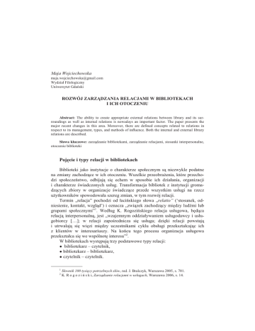 Maja Wojciechowska [email protected] Wydział Filologiczny Uniwersytet GdaĔski ROZWÓJ ZARZĄDZANIA RELACJAMI W BIBLIOTEKACH I ICH OTOCZENIU Abstract: The ability to create appropriate external relations between library and its surroundings as well as internal relations is nowadays an important factor. The paper presents the major recent changes in this area. Moreover, there are defined concepts related to relations in respect to its management, types, and methods of influence. Both the internal and external library relations are described. Słowa kluczowe: zarządzanie bibliotekami, zarządzanie relacjami, stosunki interpersonalne, otoczenie biblioteki PojĊcie i typy relacji w bibliotekach Biblioteki jako instytucje o charakterze społecznym są niezwykle podatne na zmiany zachodzące w ich otoczeniu. Wszelkie przeobraĪenia, które przechodzi społeczeĔstwo, odbijają siĊ echem w sposobie ich działania, organizacji i charakterze Ğwiadczonych usług. Transformacja bibliotek z instytucji gromadzących zbiory w organizacje Ğwiadczące przede wszystkim usługi na rzecz uĪytkowników spowodowała szereg zmian, w tym rozwój relacji. Termin „relacja” pochodzi od łaciĔskiego słowa „relatio” (‘stosunek, odniesienie, kontakt, wzgląd’) i oznacza „związek zachodzący miĊdzy ludĨmi lub grupami społecznymi”1. Według K. RogoziĔskiego relacja usługowa, bĊdąca relacją interpersonalną, jest „wzajemnym oddziaływaniem usługodawcy i usługobiorcy […]; w relacji zapoĞrednicza siĊ usługa; dziĊki relacji powstają i utrwalają siĊ wiĊzi miĊdzy uczestnikami cyklu obsługi przekształcając ich z klientów w interesariuszy. Na koĔcu tego procesu organizacja usługowa przekształca siĊ we wspólnotĊ interesu”2. W bibliotekach wystĊpują trzy podstawowe typy relacji: Ɣ bibliotekarz – czytelnik, Ɣ bibliotekarz – bibliotekarz, Ɣ czytelnik – czytelnik. 1 2 Słownik 100 tysiĊcy potrzebnych słów, red. J. Bralczyk, Warszawa 2005, s. 701. K. R o g o z i Ĕ s k i, Zarządzanie relacjami w usługach, Warszawa 2006, s. 14. 38 KaĪda z nich w mniejszym lub wiĊkszym stopniu ewoluowała na przestrzeni lat, co powodowało koniecznoĞü implementowania nowych mechanizmów ułatwiających kierowanie tego typu zaleĪnoĞciami. NajwiĊcej uwagi poĞwiĊcano zwykle relacjom ogniskowym typu bibliotekarz–czytelnik, poniewaĪ są to związki najistotniejsze w procesie Ğwiadczenia usług bibliotecznych. Stąd teĪ liczne koncepcje zarządzania jakoĞcią, podnoszenia standardów obsługi i współpracy z uĪytkownikami. WspółczeĞnie wzrasta jednak teĪ zainteresowanie relacjami wewnĊtrznymi o charakterze bibliotekarz–bibliotekarz, co słuĪy popularyzacji w bibliotekach idei marketingu wewnĊtrznego. ZaĞ w ostatnim czasie zaczynają analizowane byü związki zachodzące pomiĊdzy czytelnikami oraz ich wpływ na satysfakcjĊ z usług biblioteki. I tak przykładowo w instytucjach komercyjnych 5% badanych jako problem związany z obsługą zgłasza nieprawidłowoĞci w relacjach klient–klient3, zaĞ badania przeprowadzone w bibliotekach pokazują, iĪ drugim co do liczby wskazaĔ zakłóceniem w odbiorze usług są zdarzenia spowodowane zachowaniem i postawami innych czytelników, czyli równieĪ relacje typu czytelnik–czytelnik4. Biblioteki naleĪą do grupy tzw. instytucji profesjonalnych (czyli Ğwiadczących wyspecjalizowane usługi), w których moĪna zaobserwowaü duĪą czĊstotliwoĞü wystĊpowania relacji typu klient– klient, co ilustruje tab. 1. Tabela 1 Przykłady usług profesjonalnych i konsumpcyjnych posiadających cechy zwiĊkszające czĊstotliwoĞü wystĊpowania relacji typu klient–klient Cecha charakterystyczna usługi Klienci pozostają w bliskiej odległoĞci od siebie WystĊpują interakcje werbalne miĊdzy klientami Usługi profesjonalne Usługi konsumpcyjne Wykład KoĞciół Kino Kurs Bar Klienci zaangaĪowani są w liczne i zróĪnicowane działania Biblioteki Hotel Otoczenie Ğwiadczonej usługi przyciąga zróĪnicowany zbiór klientów Nieselektywna edukacja Park rozrywki Kurort narciarski Istotą usługi jest współpraca Kurs MBA Grupa zbicia wagi Klienci muszą niekiedy czekaü zanim zostaną obsłuĪeni Klinika Urząd pocztowy Klienci spĊdzają wspólnie czas, przebywają w tym samym pomieszczeniu, wspólnie uĪywają sprzĊtów, za pomocą których Ğwiadczona jest usługa Biblioteki Pociągi Kluby fitness ħ r ó d ł o: K. R o g o z i Ĕ s k i, Zarządzanie relacjami w usługach, Warszawa 2006, s. 146. 3 Ibidem. Badania przeprowadzone na próbie 300 czytelników z róĪnych typów bibliotek w czerwcu 2009 r. 4 39 Poza wymienionymi wczeĞniej trzema podstawowymi typami relacji wystĊpują równieĪ inne ich klasyfikacje, tworzone ze wzglĊdu na róĪne kryteria podziału, takie jak np.: Ɣ miejsce zachodzenia relacji (relacje zachodzące w bibliotece, poza biblioteką oraz relacje mieszane); Ɣ forma uzewnĊtrzniania relacji (relacje werbalne, niewerbalne, mieszane); Ɣ celowoĞü zachodzenia relacji (relacje zamierzone lub relacje niezamierzone – przypadkowe); Ɣ ocena interakcji (relacje pozytywne lub relacje negatywne); Ɣ zbiorowoĞü uczestnicząca w procesie (relacje indywidualne – np. bibliotekarz–czytelnik oraz relacje grupowe, np. bibliotekarz–grupa szkoleniowa). Kształtowanie relacji z otoczeniem biblioteki Rozwój relacji pomiĊdzy biblioteką a jej otoczeniem spowodował koniecznoĞü wypracowania metod monitorowania oraz wywierania wpływu na te relacje. WiĊkszoĞü narzĊdzi została zapoĪyczona z nauk ekonomicznych oraz praktyki komercyjnych instytucji usługowych. Do najpopularniejszych metod analizowania otoczenia biblioteki naleĪą obecnie: Ɣ analiza PEST, Ɣ metoda ekstrapolacji trendów, Ɣ metoda scenariuszowa, Ɣ metoda Delficka, Ɣ analiza grup strategicznych (mapa grup strategicznych). Poza wymienionymi metodami w kształtowaniu relacji z uĪytkownikami pomagają metody, dziĊk