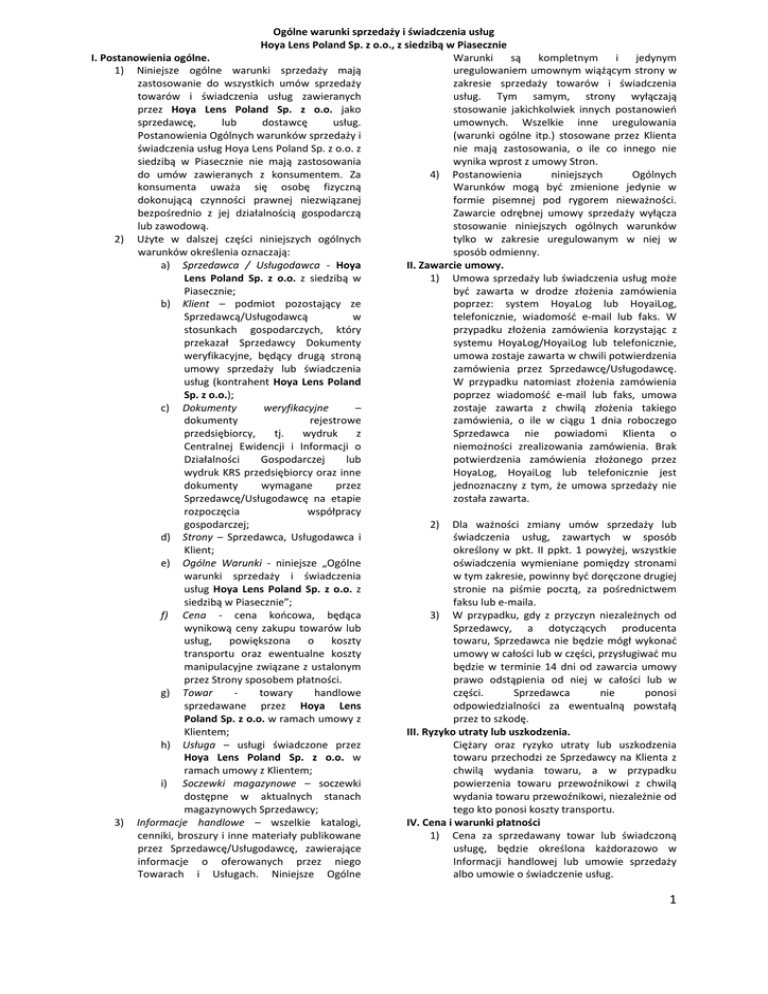 Ogólne warunki sprzedaży i świadczenia usług Hoya Lens Poland Sp. z o.o., z siedzibą w Piasecznie Warunki są kompletnym i jedynym I. Postanowienia ogólne. uregulowaniem umownym wiążącym strony w 1) Niniejsze ogólne warunki sprzedaży mają zakresie sprzedaży towarów i świadczenia zastosowanie do wszystkich umów sprzedaży usług. Tym samym, strony wyłączają towarów i świadczenia usług zawieranych stosowanie jakichkolwiek innych postanowień przez Hoya Lens Poland Sp. z o.o. jako umownych. Wszelkie inne uregulowania sprzedawcę, lub dostawcę usług. (warunki ogólne itp.) stosowane przez Klienta Postanowienia Ogólnych warunków sprzedaży i nie mają zastosowania, o ile co innego nie świadczenia usług Hoya Lens Poland Sp. z o.o. z wynika wprost z umowy Stron. siedzibą w Piasecznie nie mają zastosowania 4) Postanowienia niniejszych Ogólnych do umów zawieranych z konsumentem. Za Warunków mogą być zmienione jedynie w konsumenta uważa się osobę fizyczną formie pisemnej pod rygorem nieważności. dokonującą czynności prawnej niezwiązanej Zawarcie odrębnej umowy sprzedaży wyłącza bezpośrednio z jej działalnością gospodarczą stosowanie niniejszych ogólnych warunków lub zawodową. tylko w zakresie uregulowanym w niej w 2) Użyte w dalszej części niniejszych ogólnych sposób odmienny. warunków określenia oznaczają: II. Zawarcie umowy. a) Sprzedawca / Usługodawca - Hoya 1) Umowa sprzedaży lub świadczenia usług może Lens Poland Sp. z o.o. z siedzibą w być zawarta w drodze złożenia zamówienia Piasecznie; poprzez: system HoyaLog lub HoyaiLog, b) Klient – podmiot pozostający ze telefonicznie, wiadomość e-mail lub faks. W Sprzedawcą/Usługodawcą w przypadku złożenia zamówienia korzystając z stosunkach gospodarczych, który systemu HoyaLog/HoyaiLog lub telefonicznie, przekazał Sprzedawcy Dokumenty umowa zostaje zawarta w chwili potwierdzenia weryfikacyjne, będący drugą stroną zamówienia przez Sprzedawcę/Usługodawcę. umowy sprzedaży lub świadczenia W przypadku natomiast złożenia zamówienia usług (kontrahent Hoya Lens Poland poprzez wiadomość e-mail lub faks, umowa Sp. z o.o.); zostaje zawarta z chwilą złożenia takiego c) Dokumenty weryfikacyjne – zamówienia, o ile w ciągu 1 dnia roboczego dokumenty rejestrowe Sprzedawca nie powiadomi Klienta o przedsiębiorcy, tj. wydruk z niemożności zrealizowania zamówienia. Brak Centralnej Ewidencji i Informacji o potwierdzenia zamówienia złożonego przez Działalności Gospodarczej lub HoyaLog, HoyaiLog lub telefonicznie jest wydruk KRS przedsiębiorcy oraz inne jednoznaczny z tym, że umowa sprzedaży nie dokumenty wymagane przez została zawarta. Sprzedawcę/Usługodawcę na etapie rozpoczęcia współpracy 2) Dla ważności zmiany umów sprzedaży lub gospodarczej; świadczenia usług, zawartych w sposób d) Strony – Sprzedawca, Usługodawca i określony w pkt. II ppkt. 1 powyżej, wszystkie Klient; oświadczenia wymieniane pomiędzy stronami e) Ogólne Warunki - niniejsze „Ogólne w tym zakresie, powinny być doręczone drugiej warunki sprzedaży i świadczenia stronie na piśmie pocztą, za pośrednictwem usług Hoya Lens Poland Sp. z o.o. z faksu lub e-maila. siedzibą w Piasecznie”; 3) W przypadku, gdy z przyczyn niezależnych od f) Cena - cena końcowa, będąca Sprzedawcy, a dotyczących producenta wynikową ceny zakupu towarów lub towaru, Sprzedawca nie będzie mógł wykonać usług, powiększona o koszty umowy w całości lub w części, przysługiwać mu transportu oraz ewentualne koszty będzie w terminie 14 dni od zawarcia umowy manipulacyjne związane z ustalonym prawo odstąpienia od niej w całości lub w przez Strony sposobem płatności. części. Sprzedawca nie ponosi g) Towar towary handlowe odpowiedzialności za ewentualną powstałą sprzedawane przez Hoya Lens przez to szkodę. Poland Sp. z o.o. w ramach umowy z III. Ryzyko utraty lub uszkodzenia. Klientem; Ciężary oraz ryzyko utraty lub uszkodzenia h) Usługa – usługi świadczone przez towaru przechodzi ze Sprzedawcy na Klienta z Hoya Lens Poland Sp. z o.o. w chwilą wydania towaru, a w przypadku ramach umowy z Klientem; powierzenia towaru przewoźnikowi z chwilą i) Soczewki magazynowe – soczewki wydania towaru przewoźnikowi, niezależnie od dostępne w aktualnych stanach tego kto ponosi koszty transportu. magazynowych Sprzedawcy; IV. Cena i warunki płatności 3) Informacje handlowe – wszelkie katalogi, 1) Cena za sprzedawany towar lub świadczoną cenniki, broszury i inne materiały publikowane usługę, będzie określona każdorazowo w przez Sprzedawcę/Usługodawcę, zawierające Informacji handlowej lub umowie sprzedaży informacje o oferowanych przez niego albo umowie o świadczenie usług. Towarach i Usługach. Niniejsze Ogólne 1 Ogólne warunki sprzedaży i świadczenia usług Hoya Lens Poland Sp. z o.o., z siedzibą w Piasecznie 13) Ceny podawane przez Sprzedawcę / 2) Cenę towaru oraz świadczonej usługi ustala się Usługodawcę są Cenami netto i powiększone w oparciu o cenniki/uzgodnienia Stron zostaną o podatek od towarów i usług wg obowiązujące w dniu pisemnego obowiązujących stawek. potwierdzenia zamówienia. 14) W przypadku opóźnienia się Klienta z zapłatą 3) Informacje handlowe przekazywane Ceny z jakiejkolwiek umowy sprzedaży, bądź telefonicznie, listownie, faksem bądź za świadczenia usług łączącej strony, Sprzedawca pomocą poczty elektronicznej, nie stanowią / Usługodawca ma prawo do powstrzymania samodzielnej podstawy zawarcia umowy. się z realizacją wszystkich zawartych umów (w Umowa zostaje zawarta zgodnie z trybem tym z wydaniem towaru) do czasu zapłaty wskazanym w punkcie II. ust. 1). przez Klienta wszelkich wymagalnych 4) Jeżeli Cena będzie wskazana w walucie innej należności wraz z odsetkami. Jeżeli opóźnienie niż złote polskie, to przyjmuje się, że strony jakiejkolwiek płatności względem Sprzeda