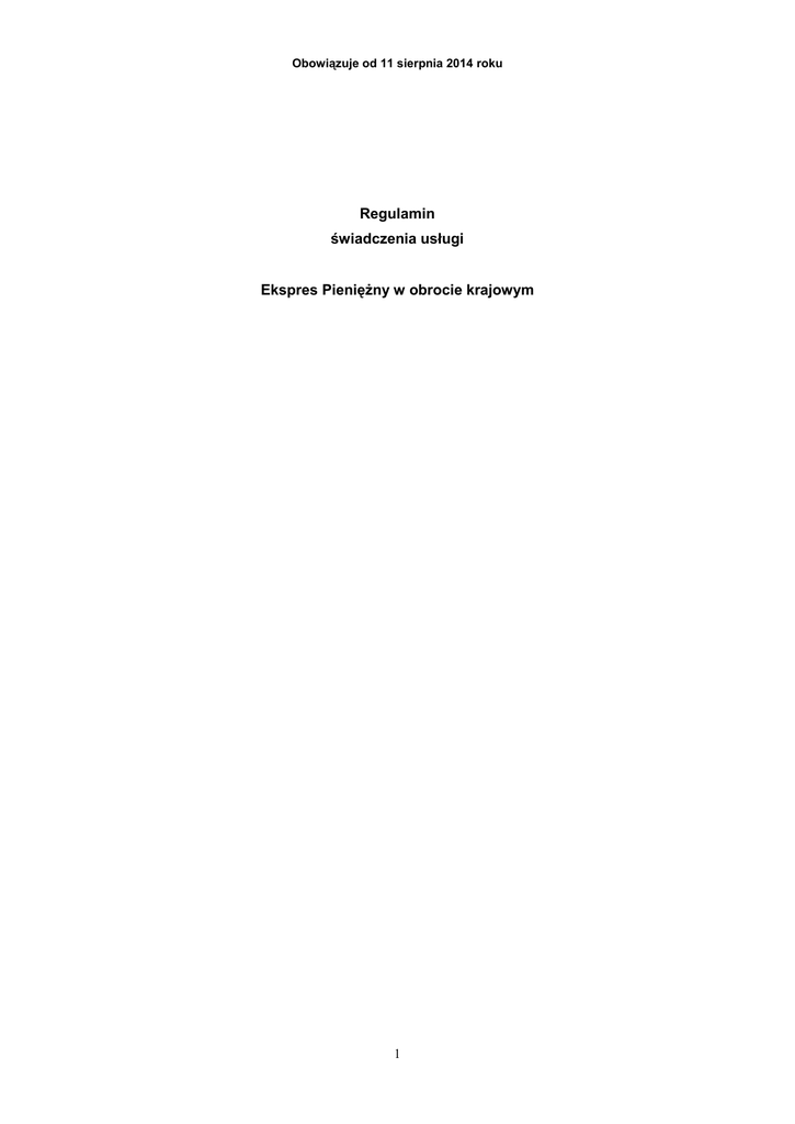 Obowiązuje od 11 sierpnia 2014 roku Regulamin świadczenia usługi Ekspres Pieniężny w obrocie krajowym 1 I. Postanowienia ogólne §1 Regulamin świadczenia usługi Ekspres Pieniężny w obrocie krajowym określa warunki i zasady świadczenia usługi Ekspres Pieniężny w obrocie krajowym przez Pocztę Polską S.A., a także zasady odpowiedzialności za niewykonanie lub nienależyte wykonanie zleconej usługi. §2 Użyte określenia i skróty oznaczają: 1) adresat – jedną osobę fizyczną, osobę prawną lub jednostkę organizacyjną nieposiadająca osobowości prawnej, dla której przeznaczony jest Ekspres Pieniężny, z zastrzeżeniem § 5 ust.6 Regulaminu, 2) Cennik – Cennik opłat za przekazy pocztowe i usługi finansowe płatnicze w Poczcie Polskiej S.A. w obrocie krajowym i zagranicznym, 3) dokument tożsamości – dowód osobisty, paszport, dokument prawa jazdy, inny niż wymienione dokument z fotografią, odciskiem pieczęci urzędowej z wizerunkiem orła oraz podpisem jego posiadacza; w przypadku cudzoziemców nieposiadających żadnego z wymienionych dokumentów inny dokument stwierdzający tożsamość cudzoziemca, 4) Ekspres Pieniężny lub EP – usługę polegającą na wypłacie określonej kwoty pieniężnej, przekazywanej przy wykorzystaniu sieci teleinformatycznych lub innych środków łączności, wypłacane w placówce oddawczej lub pod wskazanym przez nadawcę adresem, w gwarantowanych terminach, 5) kod pocztowy – Pocztowy Numer Adresowy (PNA), składający się z pięciu cyfr, przedzielonych po dwóch pierwszych cyfrach myślnikiem (np. 00-940; 10-900); będący integralnym składnikiem adresu nadawcy i adresata EP; zbiór kodów pocztowych publikowany jest w „Oficjalnym Spisie Pocztowych Numerów Adresowych”, dostępnym w każdej placówce pocztowej oraz na stronie internetowej www.poczta-polska.pl; 6) kwota graniczna – równowartość kwoty stanowiącej 120 % przeciętnego wynagrodzenia miesięcznego w gospodarce narodowej za rok poprzedzający rok, w którym dokonano wpłaty, ogłoszonego w drodze obwieszczenia przez Prezesa GUS, 7) nadanie – zawarcie umowy na realizację usługi EP, 8) nadanie przez Internet – nadanie EP za pomocą witryny na stronie http://www.poczta-polska.pl, 9) nadawca – jedną osobę fizyczną, osobę prawną lub jednostkę organizacyjną nieposiadająca osobowości prawnej, która zawarła z Pocztą Polską S.A. umowę świadczenia usługi EP, 10) odbiorca – adresata lub uprawnioną osobę, której EP został doręczony lub wypłacony, 11) pakiet – zbiór EP nadanych przez nadawcę przez Internet , 12) placówka nadawcza – placówkę pocztową, która przyjęła zlecenie na wykonanie usługi, 2 13) placówka oddawcza – placówkę pocztową realizującą czynności związane z wypłatą lub doręczeniem EP, 14) placówka pocztowa – placówkę Poczty Polskiej S.A. tj. urząd pocztowy (UP), filia UP (FUP) lub agenta Poczty Polskiej S.A., w której nadawca może zawrzeć umowę o świadczenie usługi EP lub w której realizowane są czynności związane z wypłatą lub doręczeniem EP, 15) Potwierdzenie nadania – w przypadku nadania przez Internet wydruk EP – Potwierdzenia nadania ze strony http://www.poczta-polska.pl., a w przypadku nadania w placówce nadawczej dowód przyjęcia EP w placówce nadawczej, którego oryginał otrzymuje nadawca, 16) Potwierdzenie wypłaty/odbioru – potwierdzenie wypłaty/odbioru EP podpisane przez odbiorcę na dowód otrzymania kwoty EP, 17) Regulamin – Regulamin świadczenia usługi Ekspres Pieniężny w obrocie krajowym, 18) reklamacja – zgłoszenie w każdej placówce pocztowej roszczenia w zakresie niewykonania lub nienależytego wykonania usługi EP, 19) UIP - Unikalny Identyfikator Ekspresu Pieniężnego – unikalny numer nadawany dla każdego EP przez system informatyczny, 20) Uniwersalny formularz reklamacyjny – formularz reklamacyjny, wniosek o wydanie odpisu, wniosek o udzielenie informacji (załącznik nr 1A do Regulaminu), 21) Zastrzeżenie – złożone na piśmie żądanie adresata, dotyczące niedoręczania przesyłek rejestrowanych osobie pełnoletniej zamieszkałej wraz z adresatem. §3 1. Usługa EP jest realizowana na terenie kraju w placówkach pocztowych spełniających odpowiednie warunki techniczne i przez stronę internetową www.poczta-polska.pl. 2. Usługa EP świadczona jest we wszystkie dni robocze w godzinach pracy placówek pocztowych oraz całodobowo we wszystkie dni tygodnia w przypadku nadania przez Internet. 3. Informacja o usłudze jest dostępna na stronie internetowej http://www.poczta-polska.pl lub telefonicznie w godzinach 8:00 – 20:00 od poniedziałku do piątku pod numerem telefonu 801 333 444 oraz (+48) 43 842 06 00. 4. Podczas nadawania EP, w tym także przez Internet, nadawca nie może używać treści o charakterze bezprawnym tj. naruszających dobra osobiste, ogólnie przyjęte normy społeczne lub niezgodnych z powszechnie obowiązującymi przepisami prawa. 5. Kwota pieniężna określona w EP powinna być wyrażona w PLN. §4 1. Poczta Polska S.A. realizuje trzy rodzaje usługi EP z zachowaniem gwarantowanych terminów realizacji: 1) „na teraz” – wypłata w dowolnej placówce pocztowej po upływie 10 minut od czasu nadania, 2) „na dziś” – wypłata pod adresem wskazanym przez nadawcę w ciągu 6 godzin od czasu nadania, 3 3) „na jutro” – wypłata pod adresem wskazanym przez nadawcę w następnym dniu roboczym po dniu nadania. 2. Dla EP nadanego przez Internet terminy realizacji usługi określone w ust. 1 liczone są od momentu potwierdzenia zgodności wpływu środków pieniężnych na wskazany rachunek bankowy Poczty Polskiej S.A. 3. Do terminów ustalonych w ust. 1 pkt. 2 i 3 nie wlicza się: 1) czasu poza godzinami pracy placówki oddawczej, a jeśli placówka pocztowa czynna jest całodobowo, czasu między godziną 22:00 a 6:00, 2) czasu pracy placówki oddawczej w dni wolne od pracy, 3) prze