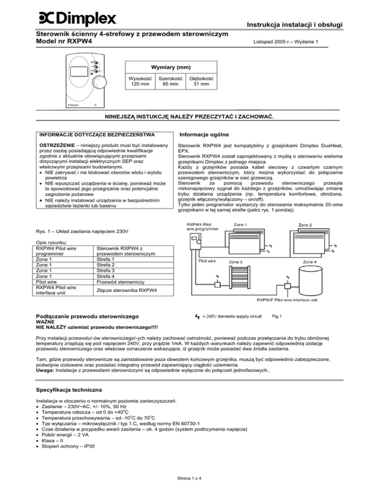 Instrukcja instalacji i obsługi Sterownik ścienny 4-strefowy z przewodem sterowniczym Model nr RXPW4 Listopad 2005 r.– Wydanie 1 Wymiary (mm) Wysokość 120 mm Szerokość 85 mm Głębokość 31 mm NINIEJSZĄ INSTUKCJĘ NALEŻY PRZECZYTAĆ I ZACHOWAĆ. INFORMACJE DOTYCZĄCE BEZPIECZEŃSTWA OSTRZEŻENIE – niniejszy produkt musi być instalowany przez osobę posiadającą odpowiednie kwalifikacje zgodnie z aktualnie obowiązującymi przepisami dotyczącymi instalacji elektrycznych SEP oraz właściwymi przepisami budowlanymi. NIE zakrywać i nie blokować otworów wlotu i wylotu powietrza NIE wpuszczać urządzenia w ścianę, ponieważ może to spowodować jego przegrzanie oraz potencjalne zagrożenie pożarowe NIE należy instalować urządzenia w bezpośrednim sąsiedztwie łazienki lub basenu Informacje ogólne Sterownik RXPW4 jest kompatybilny z grzejnikami Dimplex DuoHeat, EPX. Sterownik RXPW4 został zaprojektowany z myślą o sterowaniu wieloma grzejnikami Dimplex z jednego miejsca. Każdy z grzejników posiada kabel sieciowy z czwartym czarnym przewodem sterowniczym, który można wykorzystać do połączenia szeregowego grzejników w sieć grzewczą. Sterownik za pomocą przewodu sterowniczego przesyła niskonapięciowy sygnał do każdego z grzejników, umożliwiając zmianę trybu działania urządzenia (np. temperatura komfortowa, obniżona, grzejnik włączony/wyłączony – on/off). Tylko jeden programator wystarczy do sterowania maksymalnie 20-oma grzejnikami w tej samej strefie (patrz rys. 1 poniżej). Rys. 1 – Układ zasilania napięciem 230V Opis rysunku: RXPW4 Pilot wire programmer Zone 1 Zone 1 Zone 1 Zone 1 Pilot wire RXPW4 Pilot wire interface unit Sterownik RXPW4 z przewodem sterowniczym Strefa 1 Strefa 2 Strefa 3 Strefa 4 Przewód sterowniczy Złącze sterownika RXPW4 Podłączanie przewodu sterowniczego WAŻNE NIE NALEŻY uziemiać przewodu sterowniczego!!!! Przy instalacji przewodu/-ów sterowniczego/-ych należy zachować ostrożność, ponieważ podczas przełączania do trybu obniżonej temperatury znajdują się pod napięciem 240V, przy prądzie 1mA. W każdych warunkach należy zapewnić odpowiednią izolację przewodu sterowniczego oraz właściwe oznaczenie wskazujące, iż grzejnik może posiadać dwa źródła zasilania. Tam, gdzie przewody sterownicze są zainstalowane poza obwodem końcowym grzejnika, muszą być odpowiednio zabezpieczone, podwójnie izolowane oraz posiadać integralny przewód zapewniający ciągłość uziemienia. Uwaga: Instalacje z przewodami sterowniczymi są odpowiednie wyłącznie do połączeń jednofazowych.. Specyfikacja techniczna Instalacja w otoczeniu o normalnym poziomie zanieczyszczeń. Zasilanie – 230V~AC, +/- 10%, 50 Hz o Temperatura robocza – od 0 do +40 C o o Temperatura przechowywania – od -10 C do 70 C Typ wyłączania – mikrowyłącznik / typ 1.C, według normy EN 60730-1 Czas działania w przypadku awarii zasilania – ok. 4 godzin (system podtrzymania napięcia) Pobór energii – 2 VA Klasa – II Stopień ochrony – IP30 Strona 1 z 4 Instalacja i przyłączenie OSTRZEŻENIE – Niniejszy produkt musi być instalowany przez wykwalifikowaną osobę Sposób montażu sterownika RXPW4 na ścianie: Odkręcić śrubę znajdującą się na dole urządzenia – patrz rys. 2(1) Oddzielić podstawę, odkręcić dolną środkową śrubę umieszczoną w podstawie i zdjąć pokrywę, odsłaniając złącza elektryczne – patrz rys. 3(1) i rys. 4 Zamontować podstawę na ścianie za pomocą odpowiednich śrub i elementów złącznych dostosowanych do montażu ściennego (nie w komplecie) – rys. 2(2) Podłączyć dwa przewody zasilające do odpowiednich zacisków – zerowego (6) i napięcia (8) w podstawie i załączyć przewód/-y sterowniczy/-e (1-4) – patrz rys. 4 Umieścić urządzenie na podstawie, zaczepiając dwa wgłębienia znajdujące się w górnej części urządzania o haki, a następnie lekko wsunąć urządzenie w dół w taki sposób, aby zablokować złączkę – patrz rys. 2(3) Na koniec zamocować pojedynczą śrubę w dolnej części – rys. 2(1) Sterowanie 1 – Czas (24 h) 2 – Dzień tygodnia 3 – Aktualny tryb pracy urządzenia* włączone/wyłączone (on/off) temp. komfortowa/obniżona temp. komfortowa/ochrona przeciw mrozem 4 – Wyświetlanie trybu dla każdej strefy 5 – Przyciski wprowadzania zmian / sterowania ręcznego kasującego nastawienie automatyczne 6 – Przycisk potwierdzenia 7 – Tryb nieobecności (np. urlop) – z nastawą czasową 8 – Wskaźnik stały pokrętła wyboru 9 – Pokrętło wyboru trybu (patrz rys. 6 i Tabela 2 poniżej) Tabela nr 1 *W zależności od konfiguracji (patrz punkt „Programowanie – Tryby grzejników” w dalszej części Instrukcji) Symbol Funkcja Stała komfortowa temperatura pomieszczenia (wszystkie strefy) Tryb automatyczny (ogrzewanie zgodnie z zadanym programem dla każdej strefy) Stała temperatura obniżona (wszystkie strefy) Stała ochrona przeciwmrozowa (wszystkie strefy) Ustawienie zegara Ustawianie programu Wyłączenie ( brak ogrzewania) Konfiguracja trybów grzejników Strona 2 z 4 Programowanie Ustawianie godziny i daty Cyfra 1. 2. 3. 4. 5. Przekręcić pokrętło do ustawienia [symbol] – patrz rys. 7. Przy pomocy przycisków „+” i „-” ustawić dzień tygodnia Wcisnąć i przytrzymać przycisk „+” lub „-” w celu szybszego ustawienia właściwej liczby. Ustawić liczbę, która odpowiada bieżącemu dniu tygodnia (patrz Tabela nr 3) – np. jeżeli aktualnie jest wtorek, należy ustawić cyfrę „3”, która zaczyna migać u góry ekranu) Po ustawieniu bieżącego dnia, należy ustawić godzinę za pomocą przycisków „+” lub „-” Dzień tygodnia 1 Niedziela 2 Poniedziałek 3 Wtorek 4 Środa 5 Czwartek 6 Piątek 7 Sobota Tabela nr 3 Ustawianie programu Przekręcić pokrętło wyboru trybu do ustawienia „PROG”. Na wyświetlaczu pojawi się symbol „P=1” do programowania strefy 1