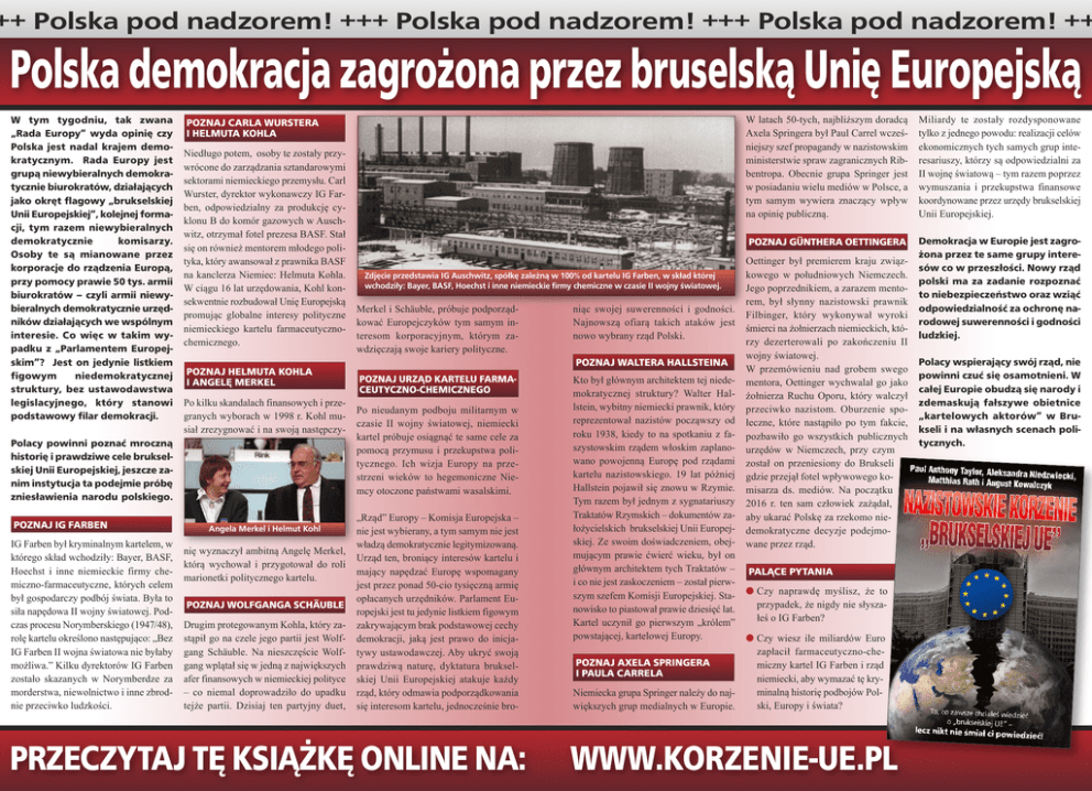 ++ Polska pod nadzorem! +++ Polska pod nadzorem! +++ Polska pod nadzorem! ++ Polska demokracja zagrożona przez bruselską Unię Europejską W tym tygodniu, tak zwana „Rada Europy” wyda opinię czy Polska jest nadal krajem demokratycznym. Rada Europy jest grupą niewybieralnych demokratycznie biurokratów, działających jako okręt flagowy „brukselskiej Unii Europejskiej”, kolejnej formacji, tym razem niewybieralnych demokratycznie komisarzy. Osoby te są mianowane przez korporacje do rządzenia Europą, przy pomocy prawie 50 tys. armii biurokratów – czyli armii niewybieralnych demokratycznie urzędników działających we wspólnym interesie. Co więc w takim wypadku z „Parlamentem Europejskim”? Jest on jedynie listkiem figowym niedemokratycznej struktury, bez ustawodawstwa legislacyjnego, który stanowi podstawowy filar demokracji. POZNAJ CARLA WURSTERA I HELMUTA KOHLA Niedługo potem, osoby te zostały przywrócone do zarządzania sztandarowymi sektorami niemieckiego przemysłu. Carl Wurster, dyrektor wykonawczy IG Farben, odpowiedzialny za produkcję cyklonu B do komór gazowych w Auschwitz, otrzymał fotel prezesa BASF. Stał się on również mentorem młodego polityka, który awansował z prawnika BASF na kanclerza Niemiec: Helmuta Kohla. W ciągu 16 lat urzędowania, Kohl konsekwentnie rozbudował Unię Europejską promując globalne interesy polityczne niemieckiego kartelu farmaceutycznochemicznego. IG Farben był kryminalnym kartelem, w którego skład wchodziły: Bayer, BASF, Hoechst i inne niemieckie firmy chemiczno-farmaceutyczne, których celem był gospodarczy podbój świata. Była to siła napędowa II wojny światowej. Podczas procesu Norymberskiego (1947/48), rolę kartelu określono następująco: „Bez IG Farben II wojna światowa nie byłaby możliwa.” Kilku dyrektorów IG Farben zostało skazanych w Norymberdze za morderstwa, niewolnictwo i inne zbrodnie przeciwko ludzkości. Merkel i Schäuble, próbuje podporządkować Europejczyków tym samym interesom korporacyjnym, którym zawdzięczają swoje kariery polityczne. niąc swojej suwerenności i godności. Najnowszą ofiarą takich ataków jest nowo wybrany rząd Polski. POZNAJ WALTERA HALLSTEINA POZNAJ HELMUTA KOHLA I ANGELĘ MERKEL Po kilku skandalach finansowych i przegranych wyborach w 1998 r. Kohl musiał zrezygnować i na swoją następczy- Polacy powinni poznać mroczną historię i prawdziwe cele brukselskiej Unii Europejskiej, jeszcze zanim instytucja ta podejmie próbę zniesławienia narodu polskiego. POZNAJ IG FARBEN Zdjęcie przedstawia IG Auschwitz, spółkę zależną w 100% od kartelu IG Farben, w skład której wchodziły: Bayer, BASF, Hoechst i inne niemieckie firmy chemiczne w czasie II wojny światowej. Angela Merkel i Helmut Kohl nię wyznaczył ambitną Angelę Merkel, którą wychował i przygotował do roli marionetki politycznego kartelu. POZNAJ WOLFGANGA SCHÄUBLE Drugim protegowanym Kohla, który zastąpił go na czele jego partii jest Wolfgang Schäuble. Na nieszczęście Wolfgang wplątał się w jedną z największych afer finansowych w niemieckiej polityce – co niemal doprowadziło do upadku tejże partii. Dzisiaj ten partyjny duet, POZNAJ URZĄD KARTELU FARMACEUTYCZNO-CHEMICZNEGO Po nieudanym podboju militarnym w czasie II wojny światowej, niemiecki kartel próbuje osiągnąć te same cele za pomocą przymusu i przekupstwa politycznego. Ich wizja Europy na przestrzeni wieków to hegemoniczne Niemcy otoczone państwami wasalskimi. „Rząd” Europy – Komisja Europejska – nie jest wybierany, a tym samym nie jest władzą demokratycznie legitymizowaną. Urząd ten, broniący interesów kartelu i mający napędzać Europę wspomagany jest przez ponad 50-cio tysięczną armię opłacanych urzędników. Parlament Europejski jest tu jedynie listkiem figowym zakrywającym brak podstawowej cechy demokracji, jaką jest prawo do inicjatywy ustawodawczej. Aby ukryć swoją prawdziwą naturę, dyktatura brukselskiej Unii Europejskiej atakuje każdy rząd, który odmawia podporządkowania się interesom kartelu, jednocześnie bro- PRZECZYTAJ TĘ KSIĄŻKĘ ONLINE NA: Kto był głównym architektem tej niedemokratycznej struktury? Walter Hallstein, wybitny niemiecki prawnik, który reprezentował nazistów począwszy od roku 1938, kiedy to na spotkaniu z faszystowskim rządem włoskim zaplanowano powojenną Europę pod rządami kartelu nazistowskiego. 19 lat później Hallstein pojawił się znowu w Rzymie. Tym razem był jednym z sygnatariuszy Traktatów Rzymskich – dokumentów założycielskich brukselskiej Unii Europejskiej. Ze swoim doświadczeniem, obejmującym prawie ćwierć wieku, był on głównym architektem tych Traktatów – i co nie jest zaskoczeniem – został pierwszym szefem Komisji Europejskiej. Stanowisko to piastował prawie dziesięć lat. Kartel uczynił go pierwszym „królem” powstającej, kartelowej Europy. POZNAJ AXELA SPRINGERA I PAULA CARRELA Niemiecka grupa Springer należy do największych grup medialnych w Europie. W latach 50-tych, najbliższym doradcą Axela Springera był Paul Carrel wcześniejszy szef propagandy w nazistowskim ministerstwie spraw zagranicznych Ribbentropa. Obecnie grupa Springer jest w posiadaniu wielu mediów w Polsce, a tym samym wywiera znaczący wpływ na opinię publiczną. Miliardy te zostały rozdysponowane tylko z jednego powodu: realizacji celów ekonomicznych tych samych grup interesariuszy, którzy są odpowiedzialni za II wojnę światową – tym razem poprzez wymuszania i przekupstwa finansowe koordynowane przez urzędy brukselskiej Unii Europejskiej. POZNAJ GÜNTHERA OETTINGERA Demokracja w Europie jest zagrożona przez te same grupy interesów co w przeszłości. Nowy rząd polski ma za zadanie rozpoznać to niebezpieczeństwo oraz wziąć odpowiedzialność za ochronę narodowej suwerenności i godności ludzkiej. Oettinger był premierem kraju związkowego w południowych Niemczech. Jego poprzedn