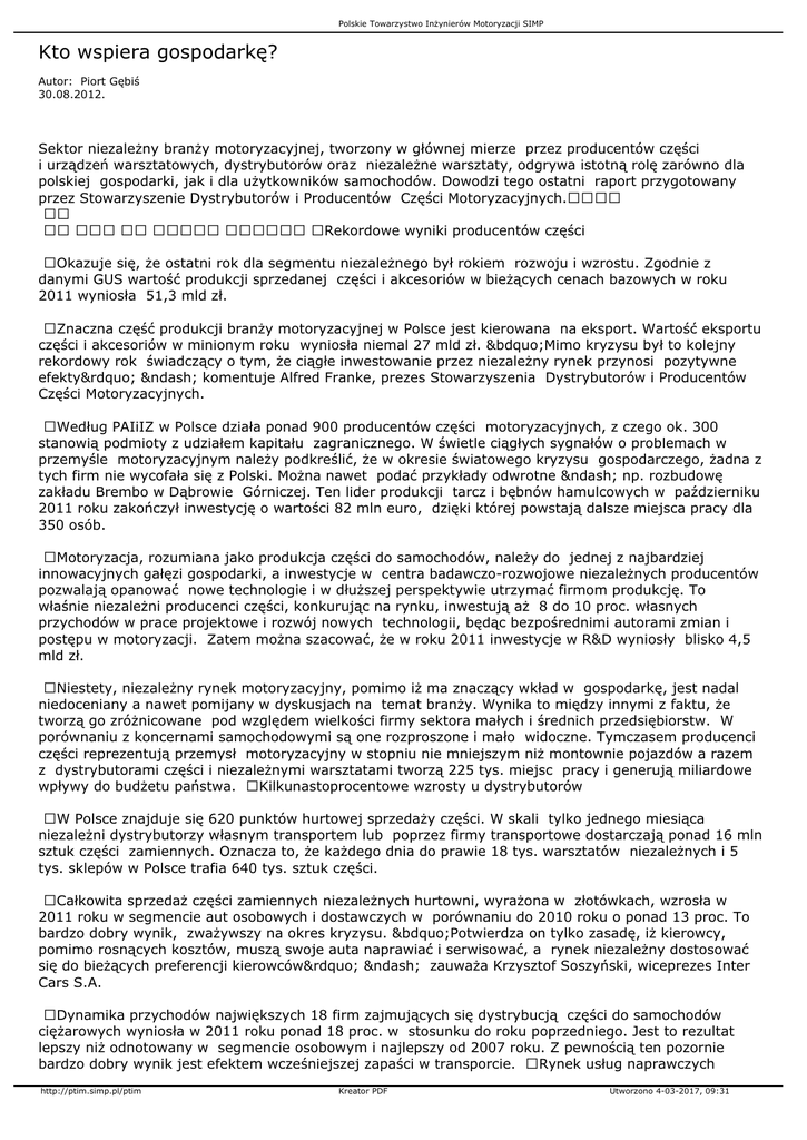 Polskie Towarzystwo Inżynierów Motoryzacji SIMP Kto wspiera gospodarkę? Autor: Piort Gębiś 30.08.2012. Sektor niezależny branży motoryzacyjnej, tworzony w głównej mierze przez producentów części i urządzeń warsztatowych, dystrybutorów oraz niezależne warsztaty, odgrywa istotną rolę zarówno dla polskiej gospodarki, jak i dla użytkowników samochodów. Dowodzi tego ostatni raport przygotowany przez Stowarzyszenie Dystrybutorów i Producentów Części Motoryzacyjnych. Rekordowe wyniki producentów części Okazuje się, że ostatni rok dla segmentu niezależnego był rokiem rozwoju i wzrostu. Zgodnie z danymi GUS wartość produkcji sprzedanej części i akcesoriów w bieżących cenach bazowych w roku 2011 wyniosła 51,3 mld zł. Znaczna część produkcji branży motoryzacyjnej w Polsce jest kierowana na eksport. Wartość eksportu części i akcesoriów w minionym roku wyniosła niemal 27 mld zł. „Mimo kryzysu był to kolejny rekordowy rok świadczący o tym, że ciągłe inwestowanie przez niezależny rynek przynosi pozytywne efekty” – komentuje Alfred Franke, prezes Stowarzyszenia Dystrybutorów i Producentów Części Motoryzacyjnych. Według PAIiIZ w Polsce działa ponad 900 producentów części motoryzacyjnych, z czego ok. 300 stanowią podmioty z udziałem kapitału zagranicznego. W świetle ciągłych sygnałów o problemach w przemyśle motoryzacyjnym należy podkreślić, że w okresie światowego kryzysu gospodarczego, żadna z tych firm nie wycofała się z Polski. Można nawet podać przykłady odwrotne – np. rozbudowę zakładu Brembo w Dąbrowie Górniczej. Ten lider produkcji tarcz i bębnów hamulcowych w październiku 2011 roku zakończył inwestycję o wartości 82 mln euro, dzięki której powstają dalsze miejsca pracy dla 350 osób. Motoryzacja, rozumiana jako produkcja części do samochodów, należy do jednej z najbardziej innowacyjnych gałęzi gospodarki, a inwestycje w centra badawczo-rozwojowe niezależnych producentów pozwalają opanować nowe technologie i w dłuższej perspektywie utrzymać firmom produkcję. To właśnie niezależni producenci części, konkurując na rynku, inwestują aż 8 do 10 proc. własnych przychodów w prace projektowe i rozwój nowych technologii, będąc bezpośrednimi autorami zmian i postępu w motoryzacji. Zatem można szacować, że w roku 2011 inwestycje w R&D wyniosły blisko 4,5 mld zł. Niestety, niezależny rynek motoryzacyjny, pomimo iż ma znaczący wkład w gospodarkę, jest nadal niedoceniany a nawet pomijany w dyskusjach na temat branży. Wynika to między innymi z faktu, że tworzą go zróżnicowane pod względem wielkości firmy sektora małych i średnich przedsiębiorstw. W porównaniu z koncernami samochodowymi są one rozproszone i mało widoczne. Tymczasem producenci części reprezentują przemysł motoryzacyjny w stopniu nie mniejszym niż montownie pojazdów a razem z dystrybutorami części i niezależnymi warsztatami tworzą 225 tys. miejsc pracy i generują miliardowe wpływy do budżetu państwa. Kilkunastoprocentowe wzrosty u dystrybutorów W Polsce znajduje się 620 punktów hurtowej sprzedaży części. W skali tylko jednego miesiąca niezależni dystrybutorzy własnym transportem lub poprzez firmy transportowe dostarczają ponad 16 mln sztuk części zamiennych. Oznacza to, że każdego dnia do prawie 18 tys. warsztatów niezależnych i 5 tys. sklepów w Polsce trafia 640 tys. sztuk części. Całkowita sprzedaż części zamiennych niezależnych hurtowni, wyrażona w złotówkach, wzrosła w 2011 roku w segmencie aut osobowych i dostawczych w porównaniu do 2010 roku o ponad 13 proc. To bardzo dobry wynik, zważywszy na okres kryzysu. „Potwierdza on tylko zasadę, iż kierowcy, pomimo rosnących kosztów, muszą swoje auta naprawiać i serwisować, a rynek niezależny dostosować się do bieżących preferencji kierowców” – zauważa Krzysztof Soszyński, wiceprezes Inter Cars S.A. Dynamika przychodów największych 18 firm zajmujących się dystrybucją części do samochodów ciężarowych wyniosła w 2011 roku ponad 18 proc. w stosunku do roku poprzedniego. Jest to rezultat lepszy niż odnotowany w segmencie osobowym i najlepszy od 2007 roku. Z pewnością ten pozornie bardzo dobry wynik jest efektem wcześniejszej zapaści w transporcie. Rynek usług naprawczych http://ptim.simp.pl/ptim Kreator PDF Utworzono 4-03-2017, 09:31 Polskie Towarzystwo Inżynierów Motoryzacji SIMP większy o 3,3 mld zł Wartość przychodów na rynku części i napraw samochodów osobowych i dostawczych w Polsce to rocznie ok. 31,3 mld zł, z czego 15,3 mld to wartość rynku usług naprawczych. W Polsce zarejestrowanych jest ok. 17,8 tys. warsztatów niezależnych, które tworzą około 91 tys. miejsc pracy. Zatem na jedno województwo przypada ich średnio 1115 i w większości prowadzą one naprawy wszystkich marek samochodów. W ciągu roku niezależne warsztaty odnotowują ponad 31 mln wizyt kierowców, co stanowi ponad 73 proc. wszystkich wizyt w warsztatach. Konsument, chcąc skorzystać z usługi serwisu autoryzowanego, średnio w województwie ma do wyboru od 2 do 3 punktów, gdzie można serwisować i naprawić samochód wybranej marki. Zgodny głos ekspertów – średni wiek samochodów to 11 lat Liczba samochodów osobowych i dostawczych rośnie kilka procent rocznie – w 2011 roku wyniosła ona 17,3 mln szt. (po usunięciu ze statystyk tzw. „samochodów widm”, które już dawno nie jeżdżą po polskich drogach, ale nie zostały wyrejestrowane). Wielkość parku samochodowego w Polsce stale rośnie co oznacza, że powoli ale systematycznie doganiamy czołówkę europejską pod względem nasycenia rynku samochodami. Mimo to w dalszym ciągu wiele brakuje nam do większości krajów europejskich, biorąc pod uwagę wskaźnik liczby samochodów przypadających na 1000 mieszkańców. Według błędnych choć oficjalnych źródeł w 2010 roku na 1000 mieszkańców 
