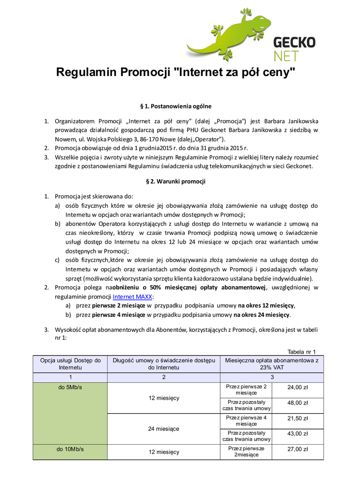 Regulamin Promocji "Internet za pół ceny" § 1. Postanowienia ogólne 1. Organizatorem Promocji „Internet za pół ceny” (dalej „Promocja”) jest Barbara Janikowska prowadząca działalnośd gospodarczą pod firmą PHU Geckonet Barbara Janikowska z siedzibą w Nowem, ul. Wojska Polskiego 3, 86-170 Nowe (dalej„Operator”). 2. Promocja obowiązuje od dnia 1 grudnia2015 r. do dnia 31 grudnia 2015 r. 3. Wszelkie pojęcia i zwroty użyte w niniejszym Regulaminie Promocji z wielkiej litery należy rozumied zgodnie z postanowieniami Regulaminu świadczenia usług telekomunikacyjnych w sieci Geckonet. § 2. Warunki promocji 1. Promocja jest skierowana do: a) osób fizycznych które w okresie jej obowiązywania złożą zamówienie na usługę dostęp do Internetu w opcjach oraz wariantach umów dostępnych w Promocji; b) abonentów Operatora korzystających z usługi dostęp do Internetu w wariancie z umową na czas nieokreślony, którzy w czasie trwania Promocji podpiszą nową umowę o świadczenie usługi dostęp do Internetu na okres 12 lub 24 miesiące w opcjach oraz wariantach umów dostępnych w Promocji; c) osób fizycznych,które w okresie jej obowiązywania złożą zamówienie na usługę dostęp do Internetu w opcjach oraz wariantach umów dostępnych w Promocji i posiadających własny sprzęt (możliwośd wykorzystania sprzętu klienta każdorazowo ustalana będzie indywidualnie). 2. Promocja polega naobniżeniu o 50% miesięcznej opłaty abonamentowej, uwzględnionej w regulaminie promocji Internet MAXX: a) przez pierwsze 2 miesiące w przypadku podpisania umowy na okres 12 miesięcy, b) przez pierwsze 4 miesiące w przypadku podpisania umowy na okres 24 miesięcy. 3. Wysokośd opłat abonamentowych dla Abonentów, korzystających z Promocji, określona jest w tabeli nr 1: Opcja usługi Dostęp do Internetu Długość umowy o świadczenie dostępu do Internetu 1 2 do 5Mb/s 12 miesięcy 24 miesiące do 10Mb/s 12 miesięcy Tabela nr 1 Miesięczna opłata abonamentowa z 23% VAT 3 Prze z pierwsze 2 miesiące 24,00 zł Prze z pozostały czas trwania umowy 48,00 zł Prze z pierwsze 4 miesiące 21,50 zł Prze z pozostały czas trwania umowy 43,00 zł Prze z pierwsze 2miesiące 27,00 zł do 10Mb/s 12 miesięcy 24 miesiące do 20Mb/s 12 miesięcy 24 miesiące do 30Mb/s 12 miesięcy 24 miesiące Prze z pozostały czas trwania umowy 54,00 zł Prze z pierwsze 4 miesiące 24,50 zł Prze z pozostały czas trwania umowy 49,00 zł Prze z pierwsze 2 miesiące 32,00 zł Prze z pozostały czas trwania umowy 64,00 zł Prze z pierwsze 4 miesiące 29,50 zł Prze z pozostały czas trwania umowy 59,00 zł Prze z pierwsze 2 miesiące 39,50 zł Prze z pozostały czas trwania umowy 79,00 zł Prze z pierwsze 4 miesiące 37,00 zł Prze z pozostały czas trwania umowy 74,00 zł 4. Promocja wiąże się z przyznaniem następujących ulg w zakresie miesięcznej opłaty abonamentowej (w stosunku do oferty standardowej) w wysokości określonej w tabeli nr 2: Tabela nr 2 Ulgi na opłaty abonamentowe dla usługi dostęp do Internetu w Promocji Opcja usługi Dostępu do Internetu w Promocji Okres obowiązywania umowy zawartej w Promocji Kwota całkowitej ulgi z tytułu opłaty abonamentowej przyznanej w promocji z 23% VAT 1 2 3 do 5Mb/s 12 miesięcy 612,00 zł 24 miesiące 1 334, 00 zł 12 miesięcy 834,00 zł 24 miesiące 1 778, 00 zł 12 miesięcy 844,00 zł 24 miesiące 1 798, 00 zł 12 miesięcy 1 039, 00 zł 24 miesiące 2 188, 00 zł do 10Mb/s do 20Mb/s do 30Mb/s 1. Ceny i ulgi w opłacie aktywacyjnej usługi dostępu do Internetu oraz w opłacie aktywacyjnej WIFIBOX określone zostały w regulaminie promocji Internet MAXX. 2. Abonenci aktualnie korzystający z usług Operatora mogą skorzystad z Promocji wyłącznie jeżeli nie zalegają z opłatami na rzecz Operatora. § 3. Postanowienia koocowe 1. Upust w miesięcznej opłacie abonamentowej, udzielony na mocy niniejszej Promocji, sumuje się z upustem udzielonym w opłacie aktywacyjnej usługi dostępu do Internetu oraz w opłacie aktywacyjnej WIFIBOX na mocy promocji Internet MAXX. 2. Promocja nie może byd łączona z innymi promocjami, za wyjątkiem promocji "Internet MAXX" oraz "Polecasz? Oszczędzasz!". 3. Do warunków Promocji, w zakresie nieuregulowanym w niniejszym Regulaminie Promocji, zastosowanie mają postanowienia zawarte wRegulaminie promocji Internet MAXX orazRegulaminie świadczenia usług telekomunikacyjnych w sieci Geckonet.