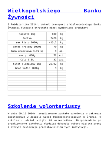 Wielkopolskiego Żywności Banku 8 Października 2014r. dotarł transport z Wielkopolskiego Banku Żywności Fundacja otrzymała niżej wymienione produkty: Kapusta 1kg Jabłka ser Piato 1000g Chleb krojony 1000g Zupa groszkowa 3,75 kg 600 kg 2420 kg 415,2 kg 70 kg 9 op. sos p. 600g 72 szt. Cola 1,5L 32 szt. Filet śledziowy 1kg Good Wafle 1000g 25,92 kg 9 kg Szkolenie wolontariuszy W dniu 09.10.2014r. zrealizowane zostało szkolenie w zakresie podstawowym w Zespole Szkół Ogólnokształcących w Śremie. W szkoleniu udział wzięło 46 uczestników. Bezpośrednio po zrealizowanym szkoleniu młodzież dokonała wyboru miejsca pracy i złożyła deklaracje przedstawicielom tych instytucji. Wolontariusze się szkolą Wolontariusze się szkolą Każdego roku m-c wrzesień to nie tylko początek roku szkolnego, ale również nowy nabór wolontariuszy chętnych do pracy w środowisku. Młodym wolontariuszom oferujemy zwiększenie kompetencji, umiejętności oraz zdobycie wiedzy podczas szkoleń w zakresie Jak zostać wolontariuszem – pierwsze warsztaty już za nami w ZSP- udział w szkoleniu wzięło 34 wolontariuszy Pierwsza pomoc przedmedyczna – w dniu 07.10.2014 w Gimnazjum nr 1im. Polskich Noblistów w Śremie Jak pomagać osobom z niepełnosprawnością – I część w dniu 10.10.2014. Zrealizowane zostały warsztaty „ Asystent wychowawcy w placówce opiekuńczo- wychowawczej” w miesiącu maju. O kolejnych szkoleniach informować będziemy na bieżąco. SZKOLENIE PIERWSZA PRZEDMEDYCZNA POMOC 07.10.2014 zakończone zostało szkolenie w zakresie „pierwszej pomocy przedmedycznej” W szkoleniu udział wzięło 20 wolontariuszy – 19 dziewczyn i 1 chłopak. Byli to uczniowie Gimnazjum nr 1 im. Polskich Noblistów w Śremie. Centrum Fizjoterapii „Balans” Centrum Fizjoterapii „Balans” przy ul. Dutkiewicza 8a w Śremie zaprasza na : – ćwiczenia Pilates, we wtorki o godz. 17.00 prowadząca Magdalena Sus- Zagórska – ćwiczenia Zdrowy Kręgosłup w środy o godz. 17.00 prowadząca Agnieszka Piasecka Zapisy pod nr telefonu 509 371 775. Czas wolny problemu spędzam bez „ Jesienne piknikowanie” Niezwykle wesoło i gwarnie było w świetlicy w Psarskiem w dniu 29.09.2014. Dla podopiecznych świetlicy, członków Koła „ SMOKI” i rodziców zorganizowano „ Święto Pyry”. Było wyśmienite ciasto upieczone przez mamy, gzika ze szczypiorkiem, ziemniaki z masłem pieczone w ognisku, smalec i kwaszony ogórek, słodycze i napoje. Dzieci same zawijały ziemniaki w folię aluminiową i wrzucały do ogniska, gdy ziemniaki piekły się w ognisku dzieci śpiewały, tańczyły, bawiły się chustą klanza oraz grały w kalambury. Pogoda była wspaniała także spotkanie było bardzo udane. Na zakończenie spotkania każde dziecko otrzymało upominek w postaci plecaczka z przyborami szkolnymi. Upominki ufundował dzieciom Bank BPH. Sprawiły one dzieciom wielka radość. Serdecznie dziękujemy darczyńcom- Bankowi BPH, Okręgowej Spółdzielni Mleczarskiej. Podziękowania kierujemy także do wolontariuszy, rodziców oraz prowadzącym zajęcia nauczycielom za pomoc w zorganizowaniu pikniku. Noclegownia Od 1.10.2014 została uruchomiona noclegownia przy Hostelu w Nochowie do 31.03.2014 czynna codziennie od 18.00 do 8.00. Z noclegowni mogą korzystać wszystkie osoby bezdomne. RAZEM DAMY RADĘ Masz orzeczenie o niepełnosprawności ? Jesteś po wygranej walce z rakiem ? Chcesz poprawić swój stan zdrowia ? TAK to właśnie do Ciebie skierowany jest ten projekt. Skorzystaj już teraz z zajęć prowadzonych przez doświadczonego psychologa oraz profesjonalną rehabilitantkę. Zadzwoń i zapisz się już dziś . Decyduje kolejność zgłoszeń Tel. 61 28 30 798 Tel. 881 201 435 „Sprawni razem” „Sprawni razem” to kolejny projekt skierowany do osób niepełnosprawnych. W ramach realizacji projektu prowadzone są zajęcia indywidualne jak i grupowe mające na celu poprawę stanu zdrowia uczestników. Uczestnicy projektu nie tylko poprawią swój stan zdrowia, ale także swoje samopoczucie poprzez rehabilitację w rytmie muzyki zespołu ABBA. Projekt realizowany jest od 18.08.14 do 30.11.14, zadanie współfinansowane jest ze środków PERON będących w dyspozycji Samorządu Województwa Wielkopolskiego.