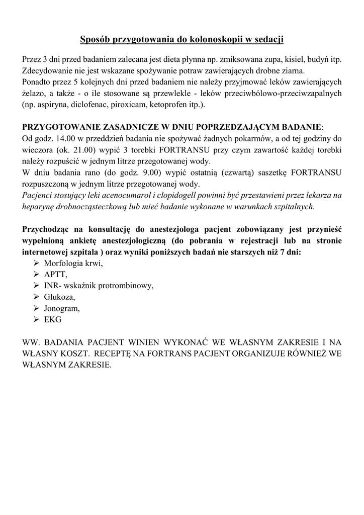 Sposób przygotowania do kolonoskopii w sedacji Przez 3 dni przed badaniem zalecana jest dieta płynna np. zmiksowana zupa, kisiel, budyń itp. Zdecydowanie nie jest wskazane spożywanie potraw zawierających drobne ziarna. Ponadto przez 5 kolejnych dni przed badaniem nie należy przyjmować leków zawierających żelazo, a także - o ile stosowane są przewlekle - leków przeciwbólowo-przeciwzapalnych (np. aspiryna, diclofenac, piroxicam, ketoprofen itp.). PRZYGOTOWANIE ZASADNICZE W DNIU POPRZEDZAJĄCYM BADANIE: Od godz. 14.00 w przeddzień badania nie spożywać żadnych pokarmów, a od tej godziny do wieczora (ok. 21.00) wypić 3 torebki FORTRANSU przy czym zawartość każdej torebki należy rozpuścić w jednym litrze przegotowanej wody. W dniu badania rano (do godz. 9.00) wypić ostatnią (czwartą) saszetkę FORTRANSU rozpuszczoną w jednym litrze przegotowanej wody. Pacjenci stosujący leki acenocumarol i clopidogell powinni być przestawieni przez lekarza na heparynę drobnocząsteczkową lub mieć badanie wykonane w warunkach szpitalnych. Przychodząc na konsultację do anestezjologa pacjent zobowiązany jest przynieść wypełnioną ankietę anestezjologiczną (do pobrania w rejestracji lub na stronie internetowej szpitala ) oraz wyniki poniższych badań nie starszych niż 7 dni: Morfologia krwi, APTT, INR- wskaźnik protrombinowy, Glukoza, Jonogram, EKG WW. BADANIA PACJENT WINIEN WYKONAĆ WE WŁASNYM ZAKRESIE I NA WŁASNY KOSZT. RECEPTĘ NA FORTRANS PACJENT ORGANIZUJE RÓWNIEŻ WE WŁASNYM ZAKRESIE.