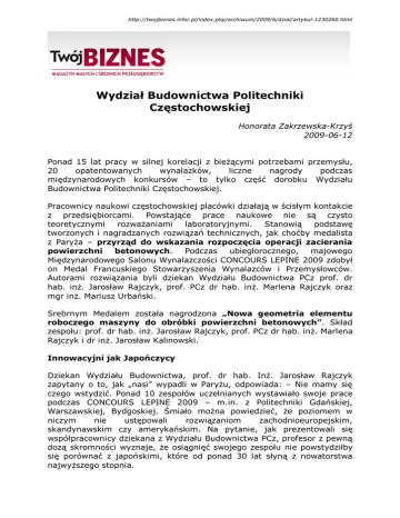 http://twojbiznes.infor.pl/index.php/archiwum/2009/6/dzial/artykul-1230260.html Wydział Budownictwa Politechniki Częstochowskiej Honorata Zakrzewska-Krzyś 2009-06-12 Ponad 15 lat pracy w silnej korelacji z bieżącymi potrzebami przemysłu, 20 opatentowanych wynalazków, liczne nagrody podczas międzynarodowych konkursów – to tylko część dorobku Wydziału Budownictwa Politechniki Częstochowskiej. Pracownicy naukowi częstochowskiej placówki działają w ścisłym kontakcie z przedsiębiorcami. Powstające prace naukowe nie są czysto teoretycznymi rozważaniami laboratoryjnymi. Stanowią podstawę tworzonych i nagradzanych rozwiązań technicznych, jak choćby medalista z Paryża – przyrząd do wskazania rozpoczęcia operacji zacierania powierzchni betonowych. Podczas ubiegłorocznego, majowego Międzynarodowego Salonu Wynalazczości CONCOURS LEPINE 2009 zdobył on Medal Francuskiego Stowarzyszenia Wynalazców i Przemysłowców. Autorami rozwiązania byli dziekan Wydziału Budownictwa PCz prof. dr hab. inż. Jarosław Rajczyk, prof. PCz dr hab. inż. Marlena Rajczyk oraz mgr inż. Mariusz Urbański. Srebrnym Medalem została nagrodzona „Nowa geometria elementu roboczego maszyny do obróbki powierzchni betonowych”. Skład zespołu: prof. dr hab. inż. Jarosław Rajczyk, prof. PCz dr hab. inż. Marlena Rajczyk i dr inż. Jarosław Kalinowski. Innowacyjni jak Japończycy Dziekan Wydziału Budownictwa, prof. dr hab. Inż. Jarosław Rajczyk zapytany o to, jak „nasi” wypadli w Paryżu, odpowiada: – Nie mamy się czego wstydzić. Ponad 10 zespołów uczelnianych wystawiało swoje prace podczas CONCOURS LEPINE 2009 – m.in. z Politechniki Gdańskiej, Warszawskiej, Bydgoskiej. Śmiało można powiedzieć, że poziomem w niczym nie ustępowali rozwiązaniom zachodnioeuropejskim, skandynawskim czy amerykańskim. Na pytanie, jak prezentowali się współpracownicy dziekana z Wydziału Budownictwa PCz, profesor z pewną dozą skromności wyznaje, że osiągnięć swojego zespołu nie powstydziłby się porównać z japońskimi, które od ponad 30 lat słyną z nowatorstwa najwyższego stopnia. Potrzeba matką wynalazku Znane obecnie sposoby określania czasu rozpoczęcia operacji zacierania twardniejącego betonu są bardzo niedokładne – oparte na subiektywnej ocenie osób obrabiających powierzchnie i uzależnione od czynników atmosferycznych (sankcjonuje to obowiązująca w Polsce norma). Jednak metoda nie przystaje do XXI wieku – dotąd rozpoczynano zacieranie, gdy ślad buta pozostawiony na powierzchni betonu odciskał się na głębokość ok. 3 milimetrów. Opracowany na Wydziale Budownictwa PCz przyrząd pozwala na precyzyjne (bez względu na warunki pogodowe) wyznaczenie momentu rozpoczęcia pracy zacieraczek mechanicznych. Ma to niebagatelne znaczenie dla późniejszej jakości powierzchni (ewentualne nierówności, mikropęknięcia, etc.). Wynalazek pracowników WB PCz umożliwia sterowanie przyrządem nawet za pomocą telefonu komórkowego i był już wykorzystywany podczas budowy autostrady na odcinku Krzyki-Wrocław. Przede wszystkim kształcenie Sorbent organiczno-mieneralny do oczyszczania zaoliwionych powierzchni to substancja, którą mają obowiązek posiadać wszystkie stacje benzynowe. Używana jest np. przez strażaków w przypadku kolizji drogowej, gdy na jezdnię wyleje się olej silnikowy. Do produkcji wykorzystywane są łatwo dostępne komponenty. Wymyślony przez pracowników WB PCz preparat z powodzeniem konkuruje z podobnymi, ale znacznie droższymi rozwiązaniami z Danii czy Niemiec. Nie został jednak poddany certyfikacji, ponieważ – jak wyjaśnia dziekan Rajczyk – głównym zadaniem uczelni jest kształcenie studentów i doktorantów. Dlatego część rozwiązań, choć z powodzeniem mogłaby być wdrożona do przemysłu, zostaje zatrzymana na etapie opublikowania informacji. Współpraca z przemysłem – Kooperacja naukowców z przedsiębiorcami jest dość złożona – tłumaczy dziekan Rajczyk. – Z jednej strony badacze liczą na wynagrodzenie za swoją pracę, w tym przypadku za rozwiązania techniczne. Z drugiej, przedsiębiorcy choć chętnie słuchają o pomysłach, zachęcają do dalszych prac, często nie są w stanie sfinansować interesujących ich rozwiązań. Modernizują więc na własną rękę, modyfikują różne konstrukcje na bazie uzyskanych informacji, jednak do transakcji transferu technologii nie dochodzi. Prof. Rajczyk jednak szybko dodaje – są liczne przykłady udanej współpracy. Na przykład ze spółką akcyjną Warta z Częstochowy, która zajmuje się oczyszczaniem ścieków. Wspólnie znajdujemy zadania badawcze w obszarze budownictwa. Nasi partnerzy są otwarci i pomocni w procesie wdrażania, który cały czas trwa. Dziekan Wydziału Budownictwa twierdzi, że jest optymistą. Uważa, że istnieją duże możliwości kooperacji nauki i przemysłu oraz szanse na wdrożenia. Niemniej jednak podkreśla kolejny raz, że podstawowym – statutowym – zadaniem uczelni jest kształcenie. Dyplomanci, doktoranci, a także habilitanci, wzbogacając swoje badania świadectwami patentowymi, potwierdzają przy okazji swoją potencjalną przydatność w praktyce. Obszary pracy Wydział Budownictwa Politechniki Częstochowskiej pracuje w czterech głównych obszarach: 1. doskonalenia konstrukcji elementów roboczych do obróbki powierzchni materiałów mineralnych, 2. budowy narzędzi pomiarowych związanych technologicznych procesów budowlanych, z oceną jakości 3. doskonaleniem konstrukcji wielowarstwowych, 4. doskonaleniem materiałów budowlanych – nowe receptury kompozytów suchych mieszanek betonowych. Przykładem z trzeciego zakresu są prace nad nową konstrukcją elastomerową, która będzie służyć zmniejszaniu obciążeń na podpory mostowe. Choć nad projektem wydziałowy zespół ciągle pracuje, w niedalekim czasie powinien uzyskać świadectwo patentowe. Czołowym osiągnięciem naukowc