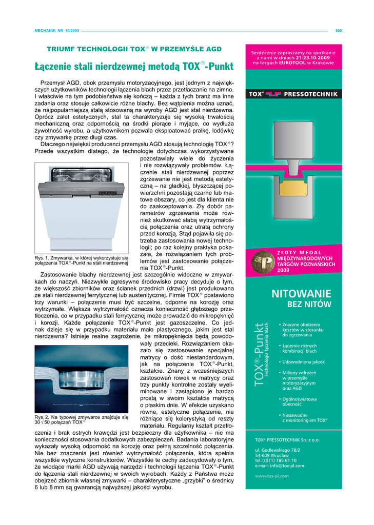 MECHANIK NR 10/2009 835 Przemysł AGD, obok przemysłu motoryzacyjnego, jest jednym z największych użytkowników technologii łączenia blach przez przetłaczanie na zimno. I właściwie na tym podobieństwa się kończą – każda z tych branż ma inne zadania oraz stosuje całkowicie różne blachy. Bez wątpienia można uznać, że najpopularniejszą stalą stosowaną na wyroby AGD jest stal nierdzewna. Oprócz zalet estetycznych, stal ta charakteryzuje się wysoką trwałością mechaniczną oraz odpornością na środki piorące i myjące, co wydłuża żywotność wyrobu, a użytkownikom pozwala eksploatować pralkę, lodówkę czy zmywarkę przez długi czas. Dlaczego najwięksi producenci przemysłu AGD stosują technologię TOX ? Przede wszystkim dlatego, że technologie dotychczas wykorzystywane pozostawiały wiele do życzenia i nie rozwiązywały problemów. Łączenie stali nierdzewnej poprzez zgrzewanie nie jest metodą estetyczną – na gładkiej, błyszczącej powierzchni pozostają czarne lub matowe obszary, co jest dla klienta nie do zaakceptowania. Zły dobór parametrów zgrzewania może również skutkować słabą wytrzymałością połączenia oraz utratą ochrony przed korozją. Stąd pojawiła się potrzeba zastosowania nowej technologii; po raz kolejny praktyka pokazała, że rozwiązaniem tych probRys. 1. Zmywarka, w której wykorzystuje się lemów jest zastosowanie połączepołączenia TOX -Punkt na stali nierdzewnej nia TOX -Punkt. Zastosowanie blachy nierdzewnej jest szczególnie widoczne w zmywarkach do naczyń. Niezwykle agresywne środowisko pracy decyduje o tym, że większość zbiorników oraz ścianek przednich (drzwi) jest produkowana ze stali nierdzewnej ferrytycznej lub austenitycznej. Firmie TOX postawiono trzy warunki – połączenie musi być szczelne, odporne na korozję oraz wytrzymałe. Większa wytrzymałość oznacza konieczność głębszego przetłoczenia, co w przypadku stali ferrytycznej może prowadzić do mikropęknięć i korozji. Każde połączenie TOX -Punkt jest gazoszczelne. Co jednak dzieje się w przypadku materiału mało plastycznego, jakim jest stal nierdzewna? Istnieje realne zagrożenie, że mikropęknięcia będą powodowały przecieki. Rozwiązaniem okazało się zastosowanie specjalnej matrycy o dość niestandardowym, jak na połączenie TOX -Punkt, kształcie. Znany z wcześniejszych zastosowań rowek w matrycy oraz trzy punkty kontrolne zostały wyeliminowane i zastąpiono je bardzo prostą w swoim kształcie matrycą o płaskim dnie. W efekcie uzyskano równe, estetyczne połączenie, nie Rys. 2. Na typowej zmywarce znajduje się różniące się kolorystyką od reszty 30 ÷ 50 połączeń TOX materiału. Regularny kształt przetłoczenia i brak ostrych krawędzi jest bezpieczny dla użytkownika – nie ma konieczności stosowania dodatkowych zabezpieczeń. Badania laboratoryjne wykazały wysoką odporność na korozję oraz pełną szczelność połączenia. Nie bez znaczenia jest również wytrzymałość połączenia, która spełnia wszystkie wytyczne konstruktorów. Wszystkie te cechy zadecydowały o tym, że wiodące marki AGD używają narzędzi i technologii łączenia TOX -Punkt do łączenia stali nierdzewnej w swoich wyrobach. Każdy z Państwa może obejrzeć zbiornik własnej zmywarki – charakterystyczne „grzybki” o średnicy 6 lub 8 mm są gwarancją najwyższej jakości wyrobu. ZŁOTY MEDAL MIĘDZYNARODOWYCH TARGÓW POZNAŃSKICH 2009 NITOWANIE BEZ NITÓW 4ECHNOLOGIACZENIABLACH Łączenie stali nierdzewnej metodą TOX -Punkt 3ERDECZNIEZAPRASZAMYNASPOTKANIE ZNAMIWDNIACH21-23.10.2009 NATARGACHEUROTOOL w Krakowie TOX®-Punkt TRIUMF TECHNOLOGII TOX W PRZEMYŚLE AGD r:NACZNEOBNIENIE kosztów w stosunku do zgrzewania rCZENIERÐNYCH KOMBINACJIBLACH r5DOWODNIONAJAKOyà r-ILIONYWDROEÎ WPRZEMYyLE MOTORYZACYJNYM oraz AGD r/GÐLNOyWIATOWA OBECNOyà r.IEZAWODNE z monitoringiem TOX® TOX® PRESSOTECHNIK Sp. z o.o. ul. Godlewskiego 7B/2 54-609 Wrocław tel.: (071) 785 61 10 e-mail: [email protected] www.tox-pl.com