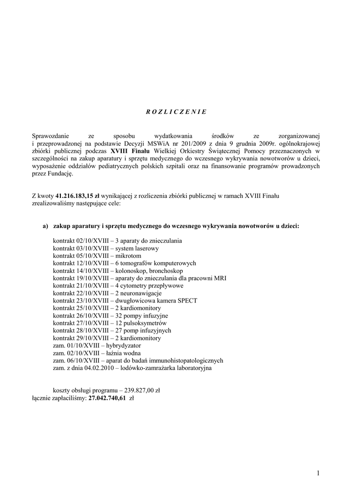 ROZLICZENIE Sprawozdanie ze sposobu wydatkowania środków ze zorganizowanej i przeprowadzonej na podstawie Decyzji MSWiA nr 201/2009 z dnia 9 grudnia 2009r. ogólnokrajowej zbiórki publicznej podczas XVIII Finału Wielkiej Orkiestry Świątecznej Pomocy przeznaczonych w szczególności na zakup aparatury i sprzętu medycznego do wczesnego wykrywania nowotworów u dzieci, wyposażenie oddziałów pediatrycznych polskich szpitali oraz na finansowanie programów prowadzonych przez Fundację. Z kwoty 41.216.183,15 zł wynikającej z rozliczenia zbiórki publicznej w ramach XVIII Finału zrealizowaliśmy następujące cele: a) zakup aparatury i sprzętu medycznego do wczesnego wykrywania nowotworów u dzieci: kontrakt 02/10/XVIII – 3 aparaty do znieczulania kontrakt 03/10/XVIII – system laserowy kontrakt 05/10/XVIII – mikrotom kontrakt 12/10/XVIII – 6 tomografów komputerowych kontrakt 14/10/XVIII – kolonoskop, bronchoskop kontrakt 19/10/XVIII – aparaty do znieczulania dla pracowni MRI kontrakt 21/10/XVIII – 4 cytometry przepływowe kontrakt 22/10/XVIII – 2 neuronawigacje kontrakt 23/10/XVIII – dwugłowicowa kamera SPECT kontrakt 25/10/XVIII – 2 kardiomonitory kontrakt 26/10/XVIII – 32 pompy infuzyjne kontrakt 27/10/XVIII – 12 pulsoksymetrów kontrakt 28/10/XVIII – 27 pomp infuzyjnych kontrakt 29/10/XVIII – 2 kardiomonitory zam. 01/10/XVIII – hybrydyzator zam. 02/10/XVIII – łaźnia wodna zam. 06/10/XVIII – aparat do badań immunohistopatologicznych zam. z dnia 04.02.2010 – lodówko-zamrażarka laboratoryjna koszty obsługi programu – 239.827,00 zł łącznie zapłaciliśmy: 27.042.740,61 zł 1 b) zakup sprzętu rehabilitacyjnego w ramach pomocy indywidualnej: wartość zakupionego sprzętu do rehabilitacji domowej – 1.507.559,58 zł łącznie zapłaciliśmy: 1.507.559,58 zł c) koszty prowadzenia programu Ratujemy i Uczymy Ratować (RUR) tj. prowadzenia szkoleń z zakresu nauki udzielania pierwszej pomocy kontrakt 29/09/XVIII – 12 000 fantomów MiniAnne kontrakt 30/09/XVIII – 3 000 fantomów LitleAnne zam. 04/10/XVIII – 16 fantomów Laerdal koszty obsługi Programu – 2.420.910,40 zł wydaliśmy łącznie: 5.082.907,16 zł d) zakup urządzeń okulistycznych w ramach Programu Zapobiegania Retinopatii Wcześniaków: kontrakt 09/10/XVIII – analizator włókien nerwowych oka kontrakt 10/10/XVIII – aparat do witrektomii łącznie: 606.480,06 zł e) finansowanie Programu Leczenia Dzieci i Kobiet Ciężarnych Pompami Insulinowymi: kontrakt 04/10/XVIII –32 pompy insulinowe dla dzieci kontrakt 13/10/XVIII – 2 aparaty do oznaczania hemoglobiny koszty obsługi Programu - 2.196,00 zł tj. łącznie: 310.363,05 zł 2 f) finansowanie Programu Nieinwazyjnego Wspomagania Oddychania u Noworodków Infant Flow: kontrakt 06/10/XVIII – 2 inkubatory transportowe z Infant Flow kontrakt 07/10/XVIII – 11 respiratorów oscylacyjnych kontrakt 08/10/XVIII – 8 aparatów Infant Flow, 11 ruchomych stanowisk z Infant Flow koszty obsługi Programu - 202.001,26 zł tj. łącznie: 3.516.508,86 zł g) finansowanie Programu Powszechnych Przesiewowych Badań Słuchu u Noworodków kontrakt 28/09/XVIII – 2 audiometry impedancyjne, 1 zest. VRA kontrakt 11/10/XVIII – sprzęt audiologiczny (67 urządzeń) zam. 66/09/XVIII – 511 zestawy komputerowe do bazy danych medycznych zam. 05/10/XVIII – 20 pulsoksymetrów obsługa Programu PPBSuN – 1.865.603,00 zł tj. łącznie: 3.549.648,24 zł h) zakup aparatury i sprzętu medycznego dla oddziałów pediatrycznych polskich szpitali zam. 03/10/XVIII – źródło światła zam. 07/10/XVIII – narzędzia ortopedyczne zam. z dnia 16.11.2010 – zgrzewarka dla banku zastawek serca tj. łącznie: 84.449,03 zł Podsumowanie wydatków: onkologia: 27.042.740,61 zł pomoc indywidualna: 1.507.559,58 zł RUR: 5.082.907,16 zł 3 okulistyka: 606.480,06 zł cukrzyca: 310.363,05 zł Infant Flow: 3.516.508,86 zł słuch: 3.549.648,24 zł pediatria – 84.449,03 zł RAZEM: 41.700.656,59 zł 4