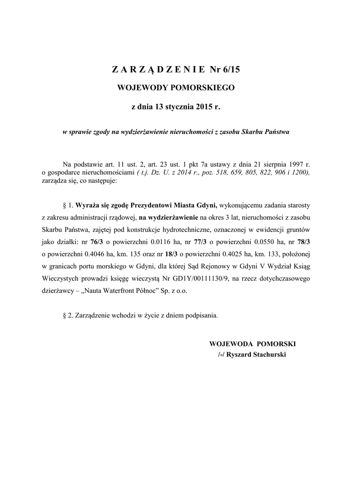 Z A R Z Ą D Z E N I E Nr 6/15 WOJEWODY POMORSKIEGO z dnia 13 stycznia 2015 r. w sprawie zgody na wydzierżawienie nieruchomości z zasobu Skarbu Państwa Na podstawie art. 11 ust. 2, art. 23 ust. 1 pkt 7a ustawy z dnia 21 sierpnia 1997 r. o gospodarce nieruchomościami ( t.j. Dz. U. z 2014 r., poz. 518, 659, 805, 822, 906 i 1200), zarządza się, co następuje: § 1. Wyraża się zgodę Prezydentowi Miasta Gdyni, wykonującemu zadania starosty z zakresu administracji rządowej, na wydzierżawienie na okres 3 lat, nieruchomości z zasobu Skarbu Państwa, zajętej pod konstrukcje hydrotechniczne, oznaczonej w ewidencji gruntów jako działki: nr 76/3 o powierzchni 0.0116 ha, nr 77/3 o powierzchni 0.0550 ha, nr 78/3 o powierzchni 0.4046 ha, km. 135 oraz nr 18/3 o powierzchni 0.4025 ha, km. 133, położonej w granicach portu morskiego w Gdyni, dla której Sąd Rejonowy w Gdyni V Wydział Ksiąg Wieczystych prowadzi księgę wieczystą Nr GD1Y/00111130/9, na rzecz dotychczasowego dzierżawcy – „Nauta Waterfront Północ” Sp. z o.o. § 2. Zarządzenie wchodzi w życie z dniem podpisania. WOJEWODA POMORSKI /-/ Ryszard Stachurski