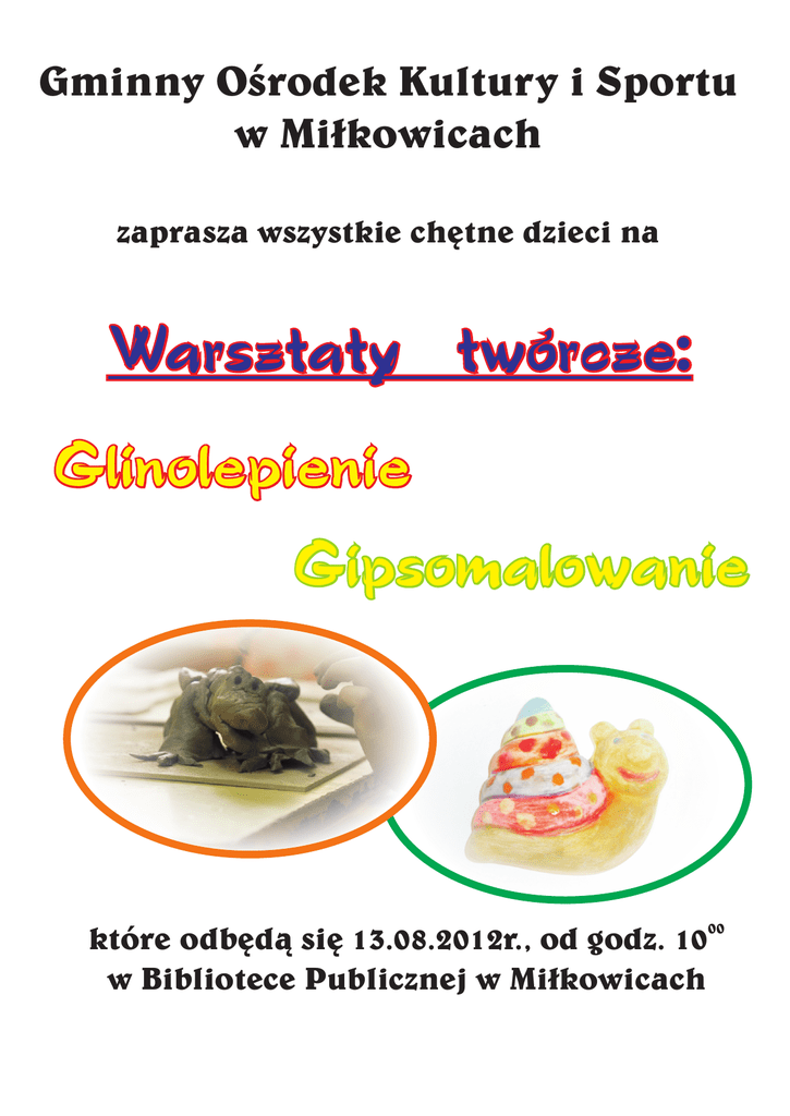 Gminny Oœrodek Kultury i Sportu w Mi³kowicach zaprasza wszystkie chêtne dzieci na Warsztaty twórcze: Glinolepienie Gipsomalowanie które odbêd¹ siê 13.08.2012r., od godz. 10 w Bibliotece Publicznej w Mi³kowicach 00