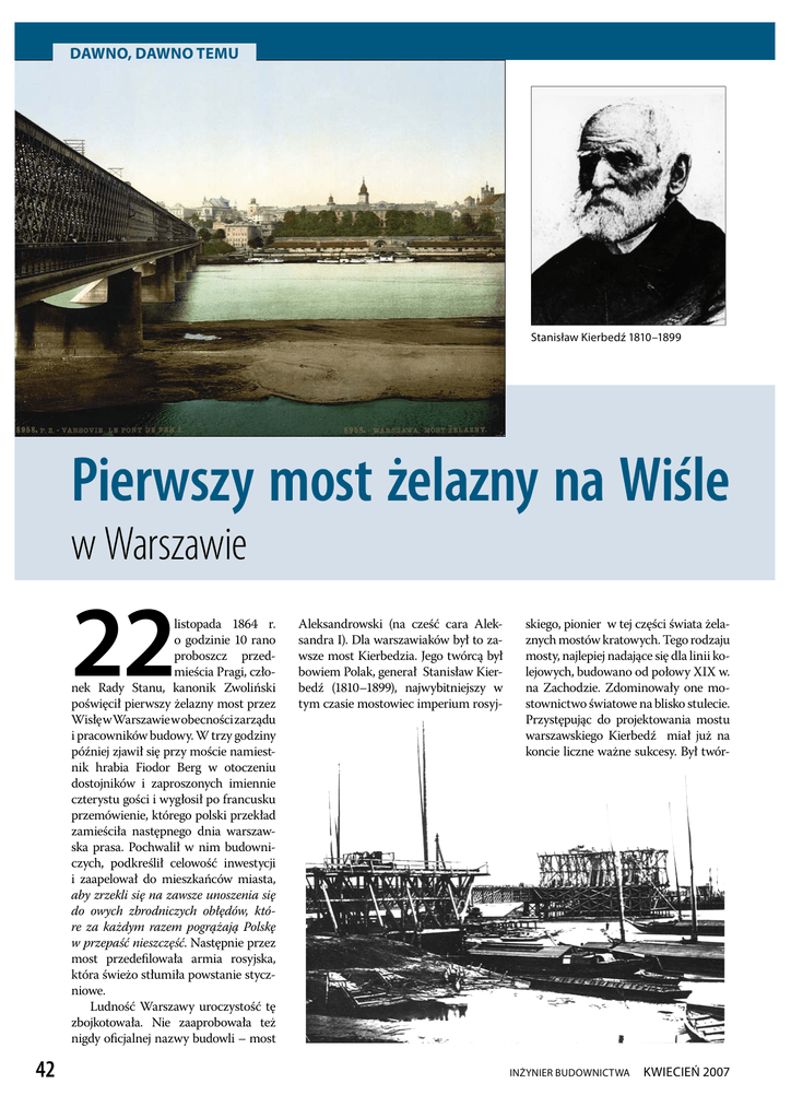 DAWNO, DAWNO TEMU Stanisław Kierbedź 1810–1899 Pierwszy most żelazny na Wiśle w Warszawie 22 listopada 1864 r. o godzinie 10 rano proboszcz przedmieścia Pragi, członek Rady Stanu, kanonik Zwoliński poświęcił pierwszy żelazny most przez Wisłę w Warszawie w obecności zarządu i pracowników budowy. W trzy godziny później zjawił się przy moście namiestnik hrabia Fiodor Berg w otoczeniu dostojników i zaproszonych imiennie czterystu gości i wygłosił po francusku przemówienie, którego polski przekład zamieściła następnego dnia warszawska prasa. Pochwalił w nim budowniczych, podkreślił celowość inwestycji i zaapelował do mieszkańców miasta, aby zrzekli się na zawsze unoszenia się do owych zbrodniczych obłędów, które za każdym razem pogrążają Polskę w przepaść nieszczęść. Następnie przez most przedefilowała armia rosyjska, która świeżo stłumiła powstanie styczniowe. Ludność Warszawy uroczystość tę zbojkotowała. Nie zaaprobowała też nigdy oficjalnej nazwy budowli – most 42 Aleksandrowski (na cześć cara Aleksandra I). Dla warszawiaków był to zawsze most Kierbedzia. Jego twórcą był bowiem Polak, generał Stanisław Kierbedź (1810–1899), najwybitniejszy w tym czasie mostowiec imperium rosyj- skiego, pionier w tej części świata żelaznych mostów kratowych. Tego rodzaju mosty, najlepiej nadające się dla linii kolejowych, budowano od połowy XIX w. na Zachodzie. Zdominowały one mostownictwo światowe na blisko stulecie. Przystępując do projektowania mostu warszawskiego Kierbedź miał już na koncie liczne ważne sukcesy. Był twór- INŻYNIER BUDOWNICTWA KWIECIEŃ 2007 DAWNO, DAWNO TEMU cą pierwszego stałego mostu na Newie w Petersburgu (1850) i pierwszych w Rosji żelaznych mostów kratowych na Łudze, Dźwinie i rzece Wielikaja (1853 –1857), profesorem Instytutu Inżynierów Komunikacji i wykładowcą kilku innych wyższych uczelni petersburskich, członkiemPetersburskiejAkademiiNauk i Rady Głównej Zarządu Komunikacji i Gmachów Publicznych. Zaprojektował w 1858 r. most warszawski jako sześcioprzęsłowy (każde przęsło miało 79 m rozpiętości), przeprowadził próbne wiercenia w korycie Wisły dla ustalenia jakości gruntów, doszedł też do wniosku, że otwory na nity lepiej wiercić, niż wybijać (co powszechnie wcześniej praktykowano). Do posadowienia podpór zastosował nową wówczas, używaną na Zachodzie od 1850 r., metodę kesonową. W 1859 r. przystąpiono do stawiania murowanych filarów, z których każdy oparty był na czterech żelaznych cylindrach (o średnicy 2,75 i 5,50 m), zagłębionych na kilkanaście metrów w dno rzeki. Dokonali tego robotnicy pracujący w kesonach wypełnionych sprężonym powietrzem, co zapobiegało wdzieraniu się wody do ich wnętrza. Ponad połowa z zatrudnionych w nich 350 ludzi cierpiała na dolegliwości związane z tzw. chorobą kesonową (rozpoznaną przez medycynę dopiero w końcu XIX w.), głównie z powodu zbyt szybkiego śluzowania (30 z nich ciężko chorowało, a 12 zmarło). Filary okazały się tak solidnie wykonane i trwałe, że w 1948 r. oparto na nich obecny most Śląsko-Dąbrowski. Następnym etapem budowy był montaż przęseł przy użyciu drewnianego kratowego pomostu roboczego systemu Towna. Cieśle wykonali go pod nadzorem Juliana Majewskiego, później długoletniego warszawskiego inżyniera gubernialnego, wedle sporządzonego przezeń własnoręcznie modelu. Inne prace prowadził na placu budowy inżynier Julian Surzycki. Całością robót kierował pułkownik inżynierii Seweryn Smolikowski, a jego zastępcą był kapitan Tadeusz Chrzanowski, budowniczy wielu innych mostów. Elementy stalowej konstrukcji dźwigarów dostarczyła francuska firma Gouin et Compagnie. Jednym z jej przedstawicieli na placu budowy był Stanisław Janicki, w przyszłości współpracownik Lessepsa przy budowie Kanału Sueskiego. KWIECIEŃ 2007 INŻYNIER BUDOWNICTWA Czuwał nad wszystkim Kierbedź, początkowo jako naczelny inżynier, a w latach 1863–1864 kierownik zarządu budowy, zwłaszcza w latach 1861–1863, kiedy był naczelnikiem VII (warszawskiego) okręgu komunikacji. Podczas pobytu w Warszawie był też członkiem Rady Stanu i Rady Administracyjnej Królestwa Polskiego. Nie mniej świetna była jego dalsza kariera. Od 1865 r. był członkiem Rady Technicznej rosyjskiego Ministerstwa Komunikacji, w 1874 r. uczestniczył w posiedzeniach rządu rosyjskiego, na których zajmowano się planowaniem budowy kolei transsyberyjskiej, w 1881 r. uzyskał rangę rzeczywistego radcy tajnego – najwyższą w rosyjskiej cywilnej hierarchii urzędniczej, w latach 1886–1887 parokrotnie kierował resortem komunikacji, choć nie dostąpił zaszczytu mianowania ministrem (zapewne z racji pochodzenia i wyznania). Zajmował się też na dużą skalę budownictwem wodnym, opracowywaniem przepisów technicznych i programów nauczania politechnicznego. W 1891 r. odszedł na emeryturę i zamieszkał w Warszawie, gdzie zajmował się pracą społeczną (był m.in. prezesem Towarzystwa Homeopatycznego) i działalnością charytatywną. Mimo kariery w służbie zaborcy nie zatracił poczucia tożsamości narodowej. Od 1841 r. należał do grupy osób finansujących budowę, a następnie funkcjonowanie polskiego kościoła św. Stanisława w Petersburgu, na krótko przed śmiercią swój bogaty fachowy księgozbiór ofiarował lwowskiej Szkole Politechnicznej, jedynej wówczas polskiej wyższej uczelni technicznej. Córka Kierbedzia, Eugenia, ufundowała w Warszawie gmachy Szkoły Sztuk Pięknych nad Wisłą i Biblioteki Publicznej przy ul. Koszykowej oraz szpitala psychiatrycznego w Drewnicy pod Warszawą. Most Kierbedzia przetrwał nienaruszony do sierpnia 1915 r. Wtedy wycofujące się wojska rosyjskie wysadziły dwa jego środkowe przęsła, odbudowane w latach 1916–1917 przez Niemców w postaci kratownic typu trójkątnego o górnym pasie parabolicznym (
