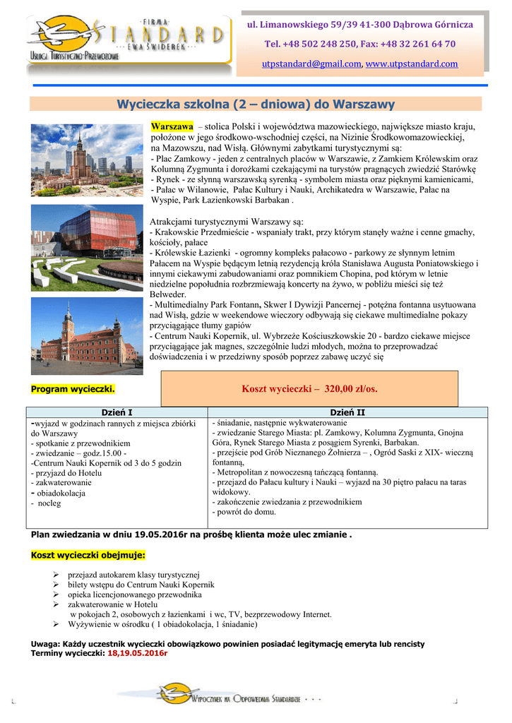 ul. Limanowskiego 59/39 41-300 Dąbrowa Górnicza Tel. +48 502 248 250, Fax: +48 32 261 64 70 [email protected], www.utpstandard.com Wycieczka szkolna (2 – dniowa) do Warszawy Warszawa – stolica Polski i województwa mazowieckiego, największe miasto kraju, położone w jego środkowo-wschodniej części, na Nizinie Środkowomazowieckiej, na Mazowszu, nad Wisłą. Głównymi zabytkami turystycznymi są: - Plac Zamkowy - jeden z centralnych placów w Warszawie, z Zamkiem Królewskim oraz Kolumną Zygmunta i dorożkami czekającymi na turystów pragnących zwiedzić Starówkę - Rynek - ze słynną warszawską syrenką - symbolem miasta oraz pięknymi kamienicami, - Pałac w Wilanowie, Pałac Kultury i Nauki, Archikatedra w Warszawie, Pałac na Wyspie, Park Łazienkowski Barbakan . Atrakcjami turystycznymi Warszawy są: - Krakowskie Przedmieście - wspaniały trakt, przy którym stanęły ważne i cenne gmachy, kościoły, pałace - Królewskie Łazienki - ogromny kompleks pałacowo - parkowy ze słynnym letnim Pałacem na Wyspie będącym letnią rezydencją króla Stanisława Augusta Poniatowskiego i innymi ciekawymi zabudowaniami oraz pomnikiem Chopina, pod którym w letnie niedzielne popołudnia rozbrzmiewają koncerty na żywo, w pobliżu mieści się też Belweder. - Multimedialny Park Fontann, Skwer I Dywizji Pancernej - potężna fontanna usytuowana nad Wisłą, gdzie w weekendowe wieczory odbywają się ciekawe multimedialne pokazy przyciągające tłumy gapiów - Centrum Nauki Kopernik, ul. Wybrzeże Kościuszkowskie 20 - bardzo ciekawe miejsce przyciągające jak magnes, szczególnie ludzi młodych, można to przeprowadzać doświadczenia i w przedziwny sposób poprzez zabawę uczyć się Program wycieczki. Dzień I -wyjazd w godzinach rannych z miejsca zbiórki do Warszawy - spotkanie z przewodnikiem - zwiedzanie – godz.15.00 -Centrum Nauki Kopernik od 3 do 5 godzin - przyjazd do Hotelu - zakwaterowanie - obiadokolacja - nocleg Koszt wycieczki – 320,00 zł/os. Dzień II - śniadanie, następnie wykwaterowanie - zwiedzanie Starego Miasta: pl. Zamkowy, Kolumna Zygmunta, Gnojna Góra, Rynek Starego Miasta z posągiem Syrenki, Barbakan. - przejście pod Grób Nieznanego Żołnierza – , Ogród Saski z XIX- wieczną fontanną, - Metropolitan z nowoczesną tańczącą fontanną. - przejazd do Pałacu kultury i Nauki – wyjazd na 30 piętro pałacu na taras widokowy. - zakończenie zwiedzania z przewodnikiem - powrót do domu. Plan zwiedzania w dniu 19.05.2016r na prośbę klienta może ulec zmianie . Koszt wycieczki obejmuje: przejazd autokarem klasy turystycznej bilety wstępu do Centrum Nauki Kopernik opieka licencjonowanego przewodnika zakwaterowanie w Hotelu w pokojach 2, osobowych z łazienkami i wc, TV, bezprzewodowy Internet. Wyżywienie w ośrodku ( 1 obiadokolacja, 1 śniadanie) Uwaga: Każdy uczestnik wycieczki obowiązkowo powinien posiadać legitymację emeryta lub rencisty Terminy wycieczki: 18,19.05.2016r