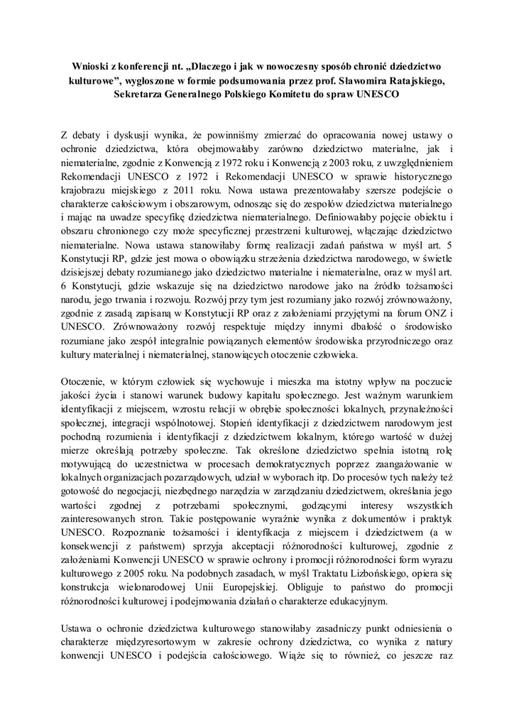 Wnioski z konferencji nt. „Dlaczego i jak w nowoczesny sposób chronić dziedzictwo kulturowe”, wygłos zone w formie podsumowania przez prof. Sławomira Ratajskiego, Sekretarza Generalnego Polskiego Komitetu do spraw UNESCO Z debaty i dyskusji wynika, Ŝe powinniśmy zmierzać do opracowania nowej ustawy o ochronie dziedzictwa, która obejmowałaby zarówno dziedzictwo materialne, jak i niematerialne, zgodnie z Konwencją z 1972 roku i Konwencją z 2003 roku, z uwzględnieniem Rekomendacji UNESCO z 1972 i Rekomendacji UNESCO w sprawie historycznego krajobrazu miejskiego z 2011 roku. Nowa ustawa prezentowałaby szersze podejście o charakterze całościowym i obszarowym, odnosząc się do zespołów dziedzictwa materialnego i mając na uwadze specyfikę dziedzictwa niematerialnego. Definiowałaby pojęcie obiektu i obszaru chronionego czy moŜe specyficznej przestrzeni kulturowej, włączając dziedzictwo niematerialne. Nowa ustawa stanowiłaby formę realizacji zadań państwa w myśl art. 5 Konstytucji RP, gdzie jest mowa o obowiązku strzeŜenia dziedzictwa narodowego, w świetle dzisiejszej debaty rozumianego jako dziedzictwo materialne i niematerialne, oraz w myśl art. 6 Konstytucji, gdzie wskazuje się na dziedzictwo narodowe jako na źródło toŜsamości narodu, jego trwania i rozwoju. Rozwój przy tym jest rozumiany jako rozwój zrównowaŜony, zgodnie z zasadą zapisaną w Konstytucji RP oraz z załoŜeniami przyjętymi na forum ONZ i UNESCO. ZrównowaŜony rozwój respektuje między innymi dbałość o środowisko rozumiane jako zespół integralnie powiązanych elementów środowiska przyrodniczego oraz kultury materialnej i niematerialnej, stanowiących otoczenie człowieka. Otoczenie, w którym człowiek się wychowuje i mieszka ma istotny wpływ na poczucie jakości Ŝycia i stanowi warunek budowy kapitału społecznego. Jest waŜnym warunkiem identyfikacji z miejscem, wzrostu relacji w obrębie społeczności lokalnych, przynaleŜności społecznej, integracji wspólnotowej. Stopień identyfikacji z dziedzictwem narodowym jest pochodną rozumienia i identyfikacji z dziedzictwem lokalnym, którego wartość w duŜej mierze określają potrzeby społeczne. Tak określone dziedzictwo spełnia istotną rolę motywującą do uczestnictwa w procesach demokratycznych poprzez zaangaŜowanie w lokalnych organizacjach pozarządowych, udział w wyborach itp. Do procesów tych naleŜy teŜ gotowość do negocjacji, niezbędnego narzędzia w zarządzaniu dziedzictwem, określania jego wartości zgodnej z potrzebami społecznymi, godzącymi interesy wszystkich zainteresowanych stron. Takie postępowanie wyraźnie wynika z dokumentów i praktyk UNESCO. Rozpoznanie toŜsamości i identyfikacja z miejscem i dziedzictwem (a w konsekwencji z państwem) sprzyja akceptacji róŜnorodności kulturowej, zgodnie z załoŜeniami Konwencji UNESCO w sprawie ochrony i promocji róŜnorodności form wyrazu kulturowego z 2005 roku. Na podobnych zasadach, w myśl Traktatu Lizbońskiego, opiera się konstrukcja wielonarodowej Unii Europejskiej. Obliguje to państwo do promocji róŜnorodności kulturowej i podejmowania działań o charakterze edukacyjnym. Ustawa o ochronie dziedzictwa kulturowego stanowiłaby zasadniczy punkt odniesienia o charakterze międzyresortowym w zakresie ochrony dziedzictwa, co wynika z natury konwencji UNESCO i podejścia całościowego. WiąŜe się to równieŜ, co jeszcze raz podkreślam, z postulowanym odejściem od pojęcia zabytku do pojęcia dziedzictwa i podejściem obszarowym, krajobrazowym zgodnie z wymienioną juŜ Rekomendacją z 2011 roku oraz przywoływaną podczas dyskusji Europejską Konwencją Krajobrazową. Oznaczałoby to zmianę determinującą konieczność opracowania nowych, odpowiednich legislacyjnych instrumentów. Braki obecnego systemu ochrony ujawniły wystąpienia w pierwszej i drugiej części naszej konferencji, a z kolei wypowiedzi panelistów w jej ostatniej części pozwalają na wskazanie nowych moŜliwości rozwiązań. Nowa Ustawa byłaby osią omawianej dziedziny w odniesieniu do regulacji zawartych w: prawie budowlanym, ustawie o planowaniu i zagospodarowaniu przestrzennym, prawie ochrony ś rodowiska, ustawie o ochronie przyrody oraz ustawie o gospodarce nie ruchomościami. Mamy nadzieję, Ŝe to nowe, szersze i bardziej elastyczne podejście do ochrony dziedzictwa kulturowego, które wynika z konwencji i innych dokumentów UNESCO, przyczyni się do zniwelowania dychotomii między ochroną dziedzictwa przyrodniczego i kulturalnego, pozwoli na pogodzenie interesów wszystkich zainteresowanych stron z wybitnym udziałem społeczności lokalnej, świadomej swojego dziedzictwa, a zastosowanie nowych, sprawniejszych narzędzi legislacyjnych i praktyk w działaniu umoŜliwi nowe perspektywy harmonijnego rozwoju cywilizacyjnego i podniesienia jakości Ŝycia.