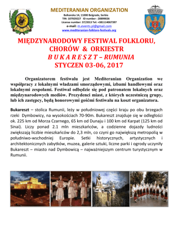 MEDITERANIAN ORGANIZATION Balkanska 14, 11000 Belgrade, Serbia TIN: 107929227 ID number : 20899026 License number: 37/2013 Tel: +381114067397 e-mail: [email protected] www.mediteranian-folklore-festivals.org MIĘDZYNARODOWY FESTIWAL FOLKLORU, CHORÓW & ORKIESTR B U K A R E S Z T – RUMUNIA STYCZEN 03-06, 2017 Organizatorem festiwalu jest Mediteranian Organization we współpracy z lokalnymi władzami smorządowymi, izbami handlowymi oraz lokalnymi zespołami. Festiwal odbędzie się pod patronatem lokalnych oraz międzynarodowych mediów. Prezydenci miast, z których uczestniczą grupy, lub ich zastępcy, będą honorowymi gośćmi festiwalu na koszt organizatora. Bukareszt – stolica Rumunii, leży w południowej części kraju po obu brzegach rzeki Dymbowicy, na wysokościach 70-90m. Bukareszt znajduje się w odległości ok. 225 km od Morza Czarnego, 65 km od Dunaju i 100 km od Karpat (125 km od Sinai). Liczy ponad 2.1 mln mieszkańców, a codzienne dojazdy ludności zwiększają liczbie mieszkańców do 2,3 mln, co czyni go największą metropolią w południwo-wschodniej Europie. Setki historycznych, artystycznych i architektonicznych zabytków, muzea, galerie sztuki, liczne parki i ogrody uczyniły Bukareszt – miasto nad Dymbowicą – najważniejszym centrum turystycznym w Rumunii. PROGRAM 1. dzień – Lipiec 26 Przyjazd do Bukaresztu. Zakwaterowanie w wybranym obiekcie. Czas wolny do własnej aranżacji albo fakultatywna wycieczka do Pałacu Peles i zamku w Branie (siedziba Drakuli) lub rejs łodzią na wyspę Snagov. Kolacja. Nocleg. 2. dzień – Lipiec 27 Śniadanie. Spotkanie informacyjne w hotelu. Faklultatywne zwiedzanie miasta (Pałac Królewski, Ateneum, Cerkiew Kretzulescu, Muzeum Historyczne, Łuk Triumfalny). Pakiet lunchowy. Ceremonia otwarcia. Występy zespołów.Kolacja. Możliwość zorganizowania wyjścia do jednej z popularnych dyskotek w Bukareszcie. Nocleg. 3. dzień – Lipiec 28 Śniadanie. Fakultatywne zwiedzanie miasta - spacer do Placu Wiktorii, Parlamentu, Rumuńskiej Cerkwy Prawosławnej, Muzeum Miejskiego, Teatru Narodowego, itd. Pakiet lunchowy. Występy zespołów. Ceremonia zakończenia festiwalu. Kolacja. Możliwość zorganizowania wyjścia do rumuńskiej tawerny z muzyką na żywo. Nocleg. 4. dzień – Lipiec 29 Śniadanie. Czas wolny do własnej aranżacji. Pakiet lunchowy. Opcjonalnie: spotkanie wszystkich grup I wieczorowe wyjście. Kolacja. Nocleg. 5. dzień – Lipiec 30 Śniadanie. Wykwaterowanie. Wyjazd. *Wycieczka do Bukaresztu: https://www.youtube.com/watch?v=yyoqQo-9YjU Cena za osobe 159€ RIN Central Hotel**** central.rinhotels.ro extra dzien 40€ 139€ Razvan Hotel *** hotelrazvan.com extra dzien 35€ 99€ Litovoy Hotel ** Triumf Hotel ** www.hotel-litovoicentral.ro extra dzien 25€ 89€ Green frog Hostel Puzzle Hostel www.puzzlehostel.ro extra dzien 22€ *Adnotacja: Grupy które uczestniczyły wcześniej w festiwalach organizowanych przez Mediteranian Organization otrzymają 10% zniżki Cena zawiera Zakwaterowanie w wybranym obiekcie w pokojach dwu, trzy lub czteroosobowych z wyżywieniem HB (śniadanie i kolacja, + pakiet lunchowy) Uczestnictwo w festiwalu Opiekę podczas trwania festiwalu Dyplomy, tablice pamiątkowe, materiały foto i video Cena nie obejmuje Wycieczki fakultatywne Wydatki indywidualne i wszelkie koszta, których nie pokrywa organizator festiwalu Ceny opcionalne Bilety na wszystkie wycieczki, atrakcje i zwiedzanie Przewodnik (cena uzależniona od wybranego języka) Transfer z/na lotnisko Rejs statkiem na wyspę Snagov Kolacja w restauracji (w cenę wliczona jest kolacja i jeden drink) Całodniowa wycieczka do Pałacu Peles i zamku w Branie (siedziba Drakuli) Dyskoteka Wstępy do muzeów Uwaga Dopata do pokoju dwuosobowego wynosi 5€ os./dzień Dopłata do pokoju jednoosobwego (os./dzień) wynosi: Hotel **** 23€ Hotel *** 21€ Dokładna nazwa hotelu/hostelu będzie podana na 5 dni przed rozpoczęciem festiwalu, jeśli nie była wcześniej wymieniona w programie. Organizator zastrzega sobie prawo do zmiany zasad i warunków realizacji wycieczek i poszczególnych pozycji z programu ze względu na obiektywnie uzasadnione okoliczności. MEDITERANIAN ORGANIZATION www.mediteranian-folklore-festivals.org [email protected] Kostas Leivadiotis: +381655588026 +381114067397 +381628754729