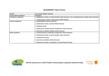 08.KONSPEKT Pablo Picasso Temat: Czas trwania szkolenia: Cel główny szkolenia: „Inny obraz świata- Picasso” 4 godziny - zwiększenie wiedzy na temat działań street artowych oraz zaprojektowanie działań street artowych Cele szczegółowe inspirowanych życiem i twórczością Pabla Picassa - przedstawienie sztuki street artu; - zwiększenie wiedzy na temat Pabla Picassa; - integracja grupy; - zwiększenie zainteresowania działaniami street artowymi; Efekt szkolenia: - stworzenie projektów działań street artowych; - zainteresowanie uczestników działaniami street artowymi; - zwiększenie wiedzy na temat działań street artowych; - zintegrowanie grupy; - stworzenie projektów street artowych; - zwiększenie wiedzy uczestników na temat Pabla Picassa; Materiał wytworzony w ramach Projektu zrealizowanego w programie Akademia Orange PRZEBIEG: Etapy Wprowadzenie 20 min Przebieg Materiały Przywitanie. Flipchart, mazaki Zapoznanie – każdy z uczestników przedstawia się i podaję kolor na pierwszą literę swojego imienia. Kolejne osoby powtarzają imiona i kolor. Każdy z uczestników kreuję swój własny portret. Badania potrzeb - po co tu jesteśmy? Na czym będą polegać dzisiejsze zajęcia? Czego oczekujemy? Kontrakt – wpisanie ważnych dla prowadzącego i uczestników zasad obowiązujących podczas zajęć. Street art co to takiego? Prezentacja multimedialna reprezentująca wybrane projektor multimedialny, prezentacja multimedialna, 20 min przykłady działań street artowych (większość wybranych laptop przykładów są to proste i kreatywne działania, które każdy jest w stanie wykonać) . Omówienie wybranych przykładów – pomysł i kreatywność ważniejsze niż umiejętności. Pablo Picasso Trener przybliża postać Pabla Picassa oraz tematykę 15 min jednego z jego obrazów: ,,Guernice” oraz tłumaczy fenomen kubizmu. Przerwa 15 min Ćwiczenie – kubizm Uczestnicy zainspirowani stylem Picassa tworzą pracę Mazaki, kredki, kartki, sepia rysunkowa, węgiel Materiał wytworzony w ramach Projektu zrealizowanego w programie Akademia Orange 15 min przedstawiające otaczający ich świat z samych figur geometrycznych. Następnie trener i uczestnicy omawiają powstałe pracę. Uczestnicy bez wcześniejszego zobaczenia Guernici Pabla Picasso otrzymują duży wydruk pocięty na kawałki czyli puzzle i muszą poskładać go w całość. Trener dzieli uczestników na grupy w których tworzą duże kolaże na pleksi, łącząc zdjęcia zwierząt ludzi i rzeczy. Następnie trener zachęca uczestników do wypowiedzenia się na temat swoich prac. rysunkowy, farby akrylowe/temperowe/emulsyjne, wałki malarskie, pędzle, tacki i kubki plastikowe Przerwa 15 min Projektowanie propozycji działań street artowych 50 min Po zobaczeniu prezentacji multimedialnych -uczniowie mieli okazje zobaczyć dzieła znanych i nieznanych artystów oraz zrozumieć czym tak naprawdę jest sztuka ulicy- projektują własne projekty street-art’owe. Papier techniczny/akwarelowy, farby akrylowe/temperowe, pędzle, wałki, folia malarska, mazaki, kredki, pastele, tacki i kubki plastikowe, węgiel rysunkowy, sepia rysunkowa Podsumowanie i zakończenie 10 min Trener zbiera powstałe projekty street artowe, podsumowuje zajęcia. Ćwiczenie – puzzle Guernica, 30 min Ćwiczenia kolaż 50 min Pocięte duże zdjęcie obrazu Pabla Picassa: Guernica (120x80) cztery pleksi (50x70), gazety, zdjęcia, kartki kolorowe, kleje, taśmy klejące, nożyczki, mazaki, wydruki Materiał wytworzony w ramach Projektu zrealizowanego w programie Akademia Orange