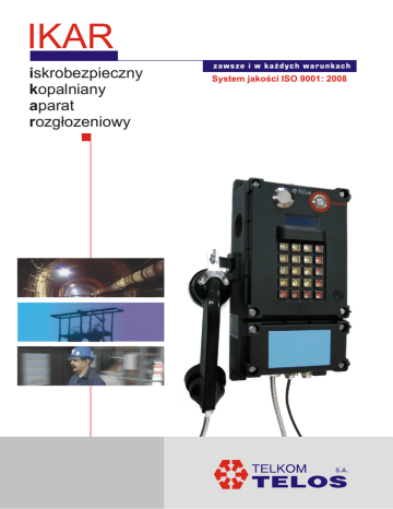 IKAR iskrobezpieczny kopalniany aparat rozgłozeniowy IKAR Iskrobezpieczny kopalniany aparat rozgłoszeniowy IKAR przeznaczony jest do pracy w podziemnych zakładach górniczych w szczególności w pomieszczeniach zagrożonych wybuchem metanu lub pyłu węglowego - I grupa wybuchowości, kategoria M1. Aparat IKAR jest abonenckim urządzeniem końcowym systemu telefonii iskrobezpiecznej ZEUS. Konstrukcja aparatu zapewnia pracę w trudnych warunkach eksploatacyjnych (hałas, narażenia mechaniczne, zapylenie, duża wilgotność, zagrożenie wybuchowe). Wysoki poziom głośności sygnału wywołania i bardzo intensywny sygnalizator optyczny widoczny z dużej odległości zapewniają skuteczność przywołania nawet w miejscach o wysokim poziomie hałasu i wysokim stopniu zapylenia. Aparat IKAR posiada certyfikat europejskiego laboratorium notyfikowanego FTZU 12ATEX 0105 nadający cechę I M1 Ex ia I Ma. Aparat przeznaczony jest do współpracy z cyfrową automatyczną centralą telefoniczną SLICAN za pośrednictwem Abonenckiego Układu Iskrobezpiecznego typu AUI-3 produkcji TELKOM-TELOS (tzw. bariery iskrobezpiecznej). Aparat IKAR spełnia wymagane funkcje dołowego urządzenia końcowego ogólnokopalnianej iskrobezpiecznej łączności telefonicznej alarmowo-rozgłoszeniowej. Aparaty IKAR mogą współpracować z centralą telefoniczną bez pośrednictwa układów AUI3- w takich miejscach gdzie nie wymagane jest iskrobezpieczeństwo dołowych urządzeń abonenckich Aparat przystosowany jest do pracy w zakresie temperatur – 200C do + 400C. Aparat realizuje następujące funkcje: • prowadzenie rozmów telefonicznych w ruchu automatycznym za pomocą mikrotelefonu oraz w trybie głośnomówiącym w systemie duplexowym • odbiór sygnału przywołania z głośnością min 95dB oraz z sygnalizacją optyczną, • wybieranie numerów w systemie wieloczęstotliwościowym DTMF • bezpośrednie wywołanie telefonistki – przyciskiem A (Awizo) • bezpośrednie wywołanie dyspozytora zakładu w trybie zwykłym – przyciskiem D • bezpośrednie wywołanie dyspozytora zakładu w trybie pilnym – przyciskiem ALARM • powtórzenie ostatnio wybranego numeru za pomocą przycisku R, • automatyczne przełączanie abonenta do awiza centrali, jeśli po podniesieniu mikrotelefonu w ciągu 10 sekund nie nastąpi wybranie jakiegokolwiek numeru. • „ skrócone wybieranie” 10 numerów zakodowanych w pamięci pośredniej pod klawiszami 0-9 klawiatury • programowe ustawianie w pamięci aparatu 4 numerów pod klawiszami: A, D, F, ALARM i 10 numerów pod klawiszami 0-9 klawiatury wybierczej dokonywane ze stanowiska dyspozytorskiego • zwiększanie poziomu głośności odbioru przyciskiem „+”, regulacja jest 5 stopniowa, każdorazowe naciśnięcie przycisku „+” zwiększa poziom o 2dB (w sumie o 10 dB), po osiągnięciu maximum kolejne naciśnięcie powoduje powrót do poziomu początkowego • możliwość prowadzenia rozmów w trybie głośnomówiącym w systemie simplexowym, ze sterowaniem przechodzenia pomiędzy trybem nadawania i odbioru przez dyspozytora • odbiór i rozgłaszanie przez głośniki z głośnością min 95 dB - 4 różnych sygnałów nadawanych przez dyspozytora: alarmowego, przywołania dyspozytorskiego przywołania zwykłego oraz komunikatu • sygnalizacja poprawnej komunikacji aparatu z pozostałymi składnikami systemu i ciągłości linii telefonicznej do centrali realizowana przez pojawiające się co 30 sekund zaświecenie diody LED w kolorze niebieskim - sygnalizacja ta dodatkowo ułatwia lokalizacje aparatu • nasłuch otoczenia aparatu prowadzony przez dyspozytora, uaktywnienie tej funkcji sygnalizowane jest świeceniem diody LED na aparacie w kolorze zielonym • wyświetlanie na wyświetlaczu LCD: aktualnego czasu, numeru wywołującego (clip), wybieranych cyfr, lokalizacji zabudowy aparatu • autodiagnostykę , w tym co najmniej: sygnalizacje otwarcia pokryw aparatu, ciągłość obwodu słuchawki, napięcia akumulatora • możliwość zdalnego „odłożenia’ mikrotelefonu ze stanowiska dyspozytorskiego • rozpoznawanie sygnałów na 4 wejściach dwustanowych, możliwość zbierania danych z urządzeń zewnętrznych • uruchamianie 4 wyjść dwustanowych • emisję komunikatów rozgłoszeniowych prowadzonych przez dyspozytora, uaktywnienie tej funkcji sygnalizowane jest świeceniem diody LED na aparacie w kolorze niebieskim abonenta PARAMETRY TECHNICZNE • • • • • • • Zasilanie: dla aparatów w wykonaniu iskrobezpiecznym z zespołów separacji iskrobezpiecznej AUI-3, dla aparatów w wykonaniu nieiskrobezpiecznym (montowanych w strefach nie zagrożonych wybuchem) bezpośrednio z centrali telefonicznej poziom sygnału wywołania: min 95dB z odległości 1m głośność sygnałów alarmowych i rozgłoszeniowych: min 95dB z odległości 1m stopień ochrony obudowy: IP 65 zakres temperatur pracy: -200C - + 400C wybieranie tonowe (DTMF) cecha iskrobezpieczeństwa : I M1 Ex ia I Ma • • • • • • • • • rezystancja wejściowa aparatu - 800Ω +/- 25% impedancja wejściowa aparatu - 600 Ω+/- 25% pasmo przenoszenia – 300Hz- 3400Hz tłumienność odniesienia na nadawanie- -4dB - +4dB tłumienność odniesienia na odbiór- -8dB- +0dB kryterium sygnału wywołania – odwrócenie polaryzacji zasilania z linii i sygnalizacja FSK wytrzymałość elektryczna izolacji – wg p.6.4.12 normy EN 50020 wymiary aparatu – max 375 x 195 (z mikrotelefonem 260) x 120mm masa – 2,5kg SYSTEM JAKOŚCI ISO 9001:2008 AQAP 2110:2009 30-015 Kraków, ul. Cieszyńska 9 Dział Sprzedaży: tel. (4812) 631 06 30, (4812) 633 02 00 fax. (4812) 631 06 31 e-mail:[email protected] www.telos.com.pl