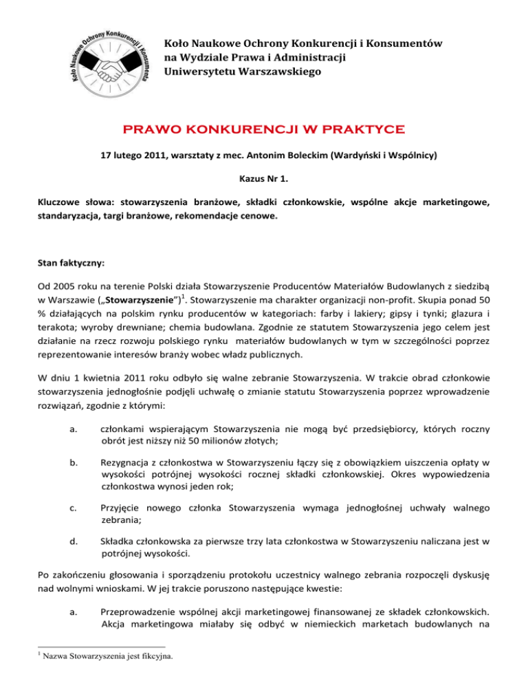 Koło Naukowe Ochrony Konkurencji i Konsumentów na Wydziale Prawa i Administracji Uniwersytetu Warszawskiego prawo konkurencji w praktyce 17 lutego 2011, warsztaty z mec. Antonim Boleckim (Wardyoski i Wspólnicy) Kazus Nr 1. Kluczowe słowa: stowarzyszenia branżowe, składki członkowskie, wspólne akcje marketingowe, standaryzacja, targi branżowe, rekomendacje cenowe. Stan faktyczny: Od 2005 roku na terenie Polski działa Stowarzyszenie Producentów Materiałów Budowlanych z siedzibą w Warszawie („Stowarzyszenie”)1. Stowarzyszenie ma charakter organizacji non-profit. Skupia ponad 50 % działających na polskim rynku producentów w kategoriach: farby i lakiery; gipsy i tynki; glazura i terakota; wyroby drewniane; chemia budowlana. Zgodnie ze statutem Stowarzyszenia jego celem jest działanie na rzecz rozwoju polskiego rynku materiałów budowlanych w tym w szczególności poprzez reprezentowanie interesów branży wobec władz publicznych. W dniu 1 kwietnia 2011 roku odbyło się walne zebranie Stowarzyszenia. W trakcie obrad członkowie stowarzyszenia jednogłośnie podjęli uchwałę o zmianie statutu Stowarzyszenia poprzez wprowadzenie rozwiązao, zgodnie z którymi: a. członkami wspierającym Stowarzyszenia nie mogą byd przedsiębiorcy, których roczny obrót jest niższy niż 50 milionów złotych; b. Rezygnacja z członkostwa w Stowarzyszeniu łączy się z obowiązkiem uiszczenia opłaty w wysokości potrójnej wysokości rocznej składki członkowskiej. Okres wypowiedzenia członkostwa wynosi jeden rok; c. Przyjęcie nowego członka Stowarzyszenia wymaga jednogłośnej uchwały walnego zebrania; d. Składka członkowska za pierwsze trzy lata członkostwa w Stowarzyszeniu naliczana jest w potrójnej wysokości. Po zakooczeniu głosowania i sporządzeniu protokołu uczestnicy walnego zebrania rozpoczęli dyskusję nad wolnymi wnioskami. W jej trakcie poruszono następujące kwestie: a. 1 Przeprowadzenie wspólnej akcji marketingowej finansowanej ze składek członkowskich. Akcja marketingowa miałaby się odbyd w niemieckich marketach budowlanych na Nazwa Stowarzyszenia jest fikcyjna. terenach przygranicznych. Hasło przewodnie akcji to: „Dobra jakośd, niska cena. Kupuj polskie produkty budowlane”. Cel akcji to intensyfikacja sprzedaży materiałów budowlanych poprzez zwiększenie ich rozpoznawalności wśród niemieckich klientów marketów budowlanych. Zaproponowano, aby w okresie prowadzenia ww. akcji marketingowej, członkowie Stowarzyszenia zrezygnowali z prowadzania indywidualnych kampanii reklamowych na terenach objętych wspólną akcją. Po przeprowadzonej dyskusji wszyscy obecni uznali, że jest to dobry pomysł. Zlecono Zarządowi Stowarzyszenia opracowanie szczegółów akcji marketingowej we współpracy z niemiecką agencją reklamową. b. Zorganizowanie targów branżowych we Wrocławiu w okresie zima 2011/2012. Uczestnictwo w targach byłoby bezpłatne. Koszty ich organizacji pokryte zostałby ze składek członkowskich. Wobec powyższego uczestnictwo firm nie będących członkami Stowarzyszenia nie byłoby możliwe. Ponadto członkowie Stowarzyszenia zobowiązaliby się, że w ww. okresie nie będą uczestniczyd w konkurencyjnych targach organizowanych na południu Polski. Pomysł ten również został zaakceptowany. Zlecono Zarządowi Stowarzyszenia przygotowanie projektów stosownych umów. Po ich podpisaniu, od sierpnia 2011 roku Zarząd miał przystąpid do organizacji targów. W związku z opieszałością Zarządu Stowarzyszenia nie udało się dochowad ww. terminu, wobec czego targi nie odbyły się. c. Przedstawiciele sześciu producentów farb i lakierów zaproponowali, aby utworzyd komitet ds. standaryzacji zawartości lotnych związków organicznych w farbach i lakierach. Prace komitetu miałyby charakter poufny. Uczestniczyd w nich mogłoby tylko sześciu ww. członków Stowarzyszenia. Przyjęcie wspólnych standardów stałoby się skuteczne dla wszystkich uczestników, jeśli opowiedziałoby się za nimi co najmniej czterech producentów farb i lakierów. d. Przedstawiciele producentów glazury i terakoty oświadczyli, że przyjęli niewiążące wytyczne, zawierające rekomendowane detaliczne ceny sprzedaży produktów z określonych kategorii. Wytyczne są odpowiedzią na działania firm chioskich, które w ocenie polskich producentów znacznie zaniżają ceny. Zaproponowano, aby analogiczne wytyczne przyjęli również pozostali członkowie Stowarzyszenia.