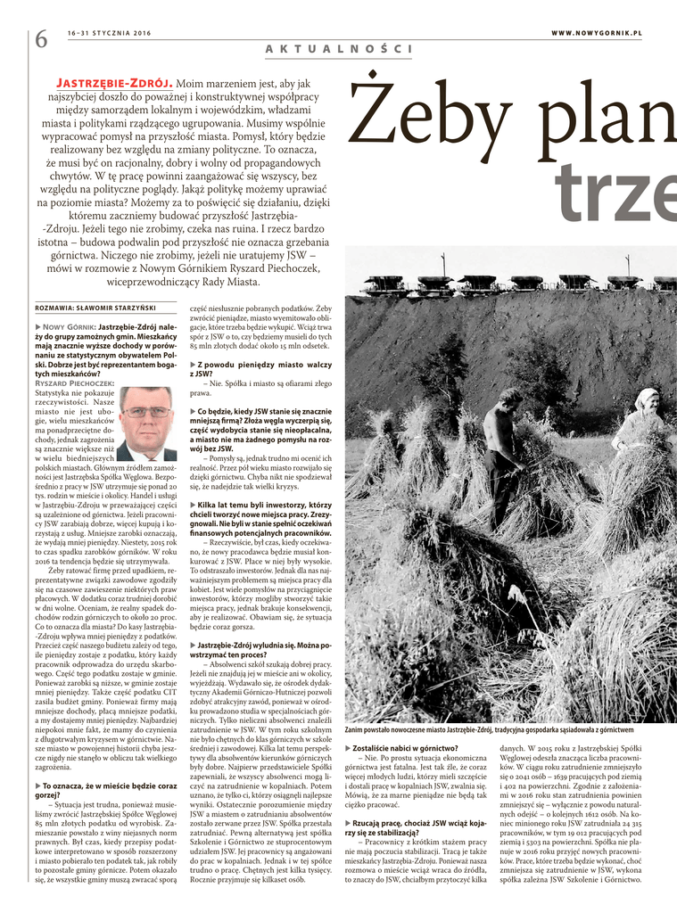6 W W W.NOW YGORNIK.PL 16 –31 S T YC Z N I A 2016 A K T U A L N O Ś C I J astrzębie -Z drój . Moim marzeniem jest, aby jak najszybciej doszło do poważnej i konstruktywnej współpracy między samorządem lokalnym i wojewódzkim, władzami miasta i politykami rządzącego ugrupowania. Musimy wspólnie wypracować pomysł na przyszłość miasta. Pomysł, który będzie realizowany bez względu na zmiany polityczne. To oznacza, że musi być on racjonalny, dobry i wolny od propagandowych chwytów. W tę pracę powinni zaangażować się wszyscy, bez względu na polityczne poglądy. Jakąż politykę możemy uprawiać na poziomie miasta? Możemy za to poświęcić się działaniu, dzięki któremu zaczniemy budować przyszłość Jastrzębia-Zdroju. Jeżeli tego nie zrobimy, czeka nas ruina. I rzecz bardzo istotna – budowa podwalin pod przyszłość nie oznacza grzebania górnictwa. Niczego nie zrobimy, jeżeli nie uratujemy JSW – mówi w rozmowie z Nowym Górnikiem Ryszard Piechoczek, wiceprzewodniczący Rady Miasta. ROZMAWIA: SŁAWOMIR STARZYŃSKI XXNowy Górnik: Jastrzębie-Zdrój należy do grupy zamożnych gmin. Mieszkańcy mają znacznie wyższe dochody w porównaniu ze statystycznym obywatelem Polski. Dobrze jest być reprezentantem bogatych mieszkańców? Ryszard Piechoczek: Statystyka nie pokazuje rzeczywistości. Nasze miasto nie jest ubogie, wielu mieszkańców ma ponadprzeciętne dochody, jednak zagrożenia są znacznie większe niż w wielu biedniejszych polskich miastach. Głównym źródłem zamożności jest Jastrzębska Spółka Węglowa. Bezpośrednio z pracy w JSW utrzymuje się ponad 20 tys. rodzin w mieście i okolicy. Handel i usługi w Jastrzębiu-Zdroju w przeważającej części są uzależnione od górnictwa. Jeżeli pracownicy JSW zarabiają dobrze, więcej kupują i korzystają z usług. Mniejsze zarobki oznaczają, że wydają mniej pieniędzy. Niestety, 2015 rok to czas spadku zarobków górników. W roku 2016 ta tendencja będzie się utrzymywała. Żeby ratować firmę przed upadkiem, reprezentatywne związki zawodowe zgodziły się na czasowe zawieszenie niektórych praw płacowych. W dodatku coraz trudniej dorobić w dni wolne. Oceniam, że realny spadek dochodów rodzin górniczych to około 20 proc. Co to oznacza dla miasta? Do kasy Jastrzębia-Zdroju wpływa mniej pieniędzy z podatków. Przecież część naszego budżetu zależy od tego, ile pieniędzy zostaje z podatku, który każdy pracownik odprowadza do urzędu skarbowego. Część tego podatku zostaje w gminie. Ponieważ zarobki są niższe, w gminie zostaje mniej pieniędzy. Także część podatku CIT zasila budżet gminy. Ponieważ firmy mają mniejsze dochody, płacą mniejsze podatki, a my dostajemy mniej pieniędzy. Najbardziej niepokoi mnie fakt, że mamy do czynienia z długotrwałym kryzysem w górnictwie. Nasze miasto w powojennej historii chyba jeszcze nigdy nie stanęło w obliczu tak wielkiego zagrożenia. XXTo oznacza, że w mieście będzie coraz gorzej? – Sytuacja jest trudna, ponieważ musieliśmy zwrócić Jastrzębskiej Spółce Węglowej 85 mln złotych podatku od wyrobisk. Zamieszanie powstało z winy niejasnych norm prawnych. Był czas, kiedy przepisy podatkowe interpretowano w sposób rozszerzony i miasto pobierało ten podatek tak, jak robiły to pozostałe gminy górnicze. Potem okazało się, że wszystkie gminy muszą zwracać sporą Żeby plan trze część niesłusznie pobranych podatków. Żeby zwrócić pieniądze, miasto wyemitowało obligacje, które trzeba będzie wykupić. Wciąż trwa spór z JSW o to, czy będziemy musieli do tych 85 mln złotych dodać około 15 mln odsetek. XXZ powodu pieniędzy miasto walczy z JSW? – Nie. Spółka i miasto są ofiarami złego prawa. XXCo będzie, kiedy JSW stanie się znacznie mniejszą firmą? Złoża węgla wyczerpią się, część wydobycia stanie się nieopłacalna, a miasto nie ma żadnego pomysłu na rozwój bez JSW. – Pomysły są, jednak trudno mi ocenić ich realność. Przez pół wieku miasto rozwijało się dzięki górnictwu. Chyba nikt nie spodziewał się, że nadejdzie tak wielki kryzys. XXKilka lat temu byli inwestorzy, którzy chcieli tworzyć nowe miejsca pracy. Zrezygnowali. Nie byli w stanie spełnić oczekiwań finansowych potencjalnych pracowników. – Rzeczywiście, był czas, kiedy oczekiwano, że nowy pracodawca będzie musiał konkurować z JSW. Płace w niej były wysokie. To odstraszało inwestorów. Jednak dla nas najważniejszym problemem są miejsca pracy dla kobiet. Jest wiele pomysłów na przyciągnięcie inwestorów, którzy mogliby stworzyć takie miejsca pracy, jednak brakuje konsekwencji, aby je realizować. Obawiam się, że sytuacja będzie coraz gorsza. XXJastrzębie-Zdrój wyludnia się. Można powstrzymać ten proces? – Absolwenci szkół szukają dobrej pracy. Jeżeli nie znajdują jej w mieście ani w okolicy, wyjeżdżają. Wydawało się, że ośrodek dydaktyczny Akademii Górniczo-Hutniczej pozwoli zdobyć atrakcyjny zawód, ponieważ w ośrodku prowadzono studia w specjalnościach górniczych. Tylko nieliczni absolwenci znaleźli zatrudnienie w JSW. W tym roku szkolnym nie było chętnych do klas górniczych w szkole średniej i zawodowej. Kilka lat temu perspektywy dla absolwentów kierunków górniczych były dobre. Najpierw przedstawiciele Spółki zapewniali, że wszyscy absolwenci mogą liczyć na zatrudnienie w kopalniach. Potem uznano, że tylko ci, którzy osiągnęli najlepsze wyniki. Ostatecznie porozumienie między JSW a miastem o zatrudnianiu absolwentów zostało zerwane przez JSW. Spółka przestała zatrudniać. Pewną alternatywą jest spółka Szkolenie i Górnictwo ze stuprocentowym udziałem JSW. Jej pracownicy są angażowani do prac w kopalniach. Jednak i w tej spółce trudno o pracę. Chętnych jest kilka tysięcy. Rocznie przyjmuje się kilkaset osób. Zanim powstało nowoczesne miasto Jastrzębie-Zdrój, tradycyjna gospodarka są