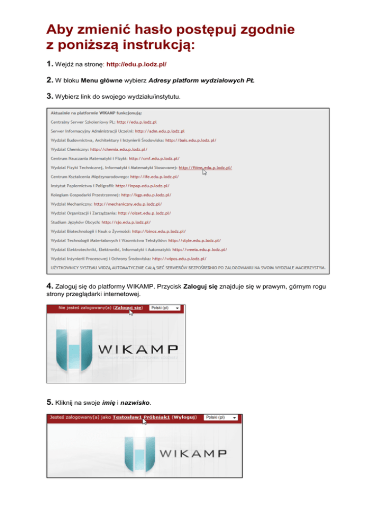 Aby zmienić hasło postępuj zgodnie z poniższą instrukcją: 1. Wejdż na stronę: http://edu.p.lodz.pl/ 2. W bloku Menu główne wybierz Adresy platform wydziałowych PŁ 3. Wybierz link do swojego wydziału/instytutu. 4. Zaloguj się do platformy WIKAMP. Przycisk Zaloguj się znajduje się w prawym, górnym rogu strony przeglądarki internetowej. 5. Kliknij na swoje imię i nazwisko. 6. Następnie z bloku Ustawienia wybierz Ustawienia mojego profilu - Zmień hasło 7. Wypełnij parametry zmiany hasła: Bieżące hasło - wpisz hasło, którego obecnie używasz do zalogowania się. Nowe hasło - wpisz nowe hasło. Pamiętaj, że nie powinno ono zawierać polskich liter i musi składać się z co najmniej ośmiu znaków (w tym: minimum jedna cyfra, minimum jedna mała litera, minimum jedna duża litera, minimum jeden znak nie będący literą ani cyfrą). Nowe hasło (ponownie) - dla potwierdzenia wpisz jeszcze raz swoje nowe hasło. 8. Zatwierdź wprowadzone zmiany, klikając Zapisz zmiany.