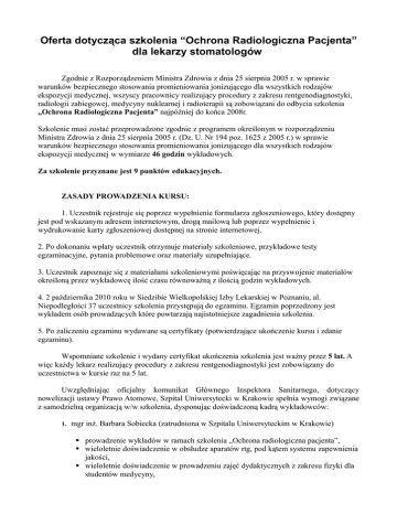 Oferta dotycząca szkolenia “Ochrona Radiologiczna Pacjenta” dla lekarzy stomatologów Zgodnie z Rozporządzeniem Ministra Zdrowia z dnia 25 sierpnia 2005 r. w sprawie warunków bezpiecznego stosowania promieniowania jonizującego dla wszystkich rodzajów ekspozycji medycznej, wszyscy pracownicy realizujący procedury z zakresu rentgenodiagnostyki, radiologii zabiegowej, medycyny nuklearnej i radioterapii są zobowiązani do odbycia szkolenia „Ochrona Radiologiczna Pacjenta” najpóźniej do końca 2008r. Szkolenie musi zostać przeprowadzone zgodnie z programem określonym w rozporządzeniu Ministra Zdrowia z dnia 25 sierpnia 2005 r. (Dz. U. Nr 194 poz. 1625 z 2005 r.) w sprawie warunków bezpiecznego stosowania promieniowania jonizującego dla wszystkich rodzajów ekspozycji medycznej w wymiarze 46 godzin wykładowych. Za szkolenie przyznane jest 9 punktów edukacyjnych. ZASADY PROWADZENIA KURSU: 1. Uczestnik rejestruje się poprzez wypełnienie formularza zgłoszeniowego, który dostępny jest pod wskazanym adresem internetowym, drogą mailową lub poprzez wypełnienie i wydrukowanie karty zgłoszeniowej dostępnej na stronie internetowej. 2. Po dokonaniu wpłaty uczestnik otrzymuje materiały szkoleniowe, przykładowe testy egzaminacyjne, pytania problemowe oraz materiały uzupełniające. 3. Uczestnik zapoznaje się z materiałami szkoleniowymi poświęcając na przyswojenie materiałów określoną przez wykładowcę ilość czasu równoważną z ilością godzin wykładowych. 4. 2 października 2010 roku w Siedzibie Wielkopolskiej Izby Lekarskiej w Poznaniu, al. Niepodległości 37 uczestnicy szkolenia przystępują do egzaminu. Egzamin poprzedzony jest wykładem osób prowadzących które powtarzają najistotniejsze zagadnienia szkolenia. 5. Po zaliczeniu egzaminu wydawane są certyfikaty (potwierdzające ukończenie kursu i zdanie egzaminu). Wspomniane szkolenie i wydany certyfikat ukończenia szkolenia jest ważny przez 5 lat. A więc każdy lekarz realizujący procedury z zakresu rentgenodiagnostyki jest zobowiązany do uczestnictwa w kursie raz na 5 lat. Uwzględniając oficjalny komunikat Głównego Inspektora Sanitarnego, dotyczący nowelizacji ustawy Prawo Atomowe, Szpital Uniwersytecki w Krakowie spełnia wymogi związane z samodzielną organizacją w/w szkolenia, dysponując doświadczoną kadrą wykładowców: 1. mgr inż. Barbara Sobiecka (zatrudniona w Szpitalu Uniwersyteckim w Krakowie) prowadzenie wykładów w ramach szkolenia „Ochrona radiologiczna pacjenta”, wieloletnie doświadczenie w obsłudze aparatów rtg, pod kątem systemu zapewnienia jakości, wieloletnie doświadczenie w prowadzeniu zajęć dydaktycznych z zakresu fizyki dla studentów medycyny, znajomość podstaw prawnych, dotyczących pracowni rtg, radiologii zabiegowej, medycyny nuklearnej i radioterapii, nadzorowanie pracy inspektorów ochrony radiologicznej SU w Krakowie 2. mgr inż. Dominik Medoń (zatrudniony w Szpitalu Uniwersyteckim w Krakowie) prowadzenie wykładów w ramach szkolenia „Ochrona radiologiczna pacjenta”, wieloletnie doświadczenie w obsłudze aparatów rtg, pod kątem systemu zapewnienia jakości, wykonywanie testów podstawowych i specjalistycznych znajomość podstaw prawnych, dotyczących pracowni rtg, radiologii zabiegowej, medycyny nuklearnej i radioterapii, inspektor ochrony radiologicznej typu R 3. mgr Franciszka Araszkiewicz (zatrudniona w WSSE w Krakowie Oddział Higieny Radiacyjnej) prowadzenie wykładów w ramach szkolenia „Ochrona radiologiczna pacjenta”, wieloletnie doświadczenie w zakresie ochrony radiologicznej znajomość podstaw prawnych, dotyczących pracowni rtg, radiologii zabiegowej, medycyny nuklearnej i radioterapii, specjalista analityki sanitarnej inspektor ochrony radiologicznej typu R 4. mgr Monika Jędrzejewska (zatrudniona w Amika Konsorcjum Medyczne Sp. z o.o.) prowadzenie wykładów w ramach szkolenia „Ochrona radiologiczna pacjenta”, wieloletnie doświadczenie w obsłudze aparatów rtg, pod kątem systemu zapewnienia jakości, wykonywanie testów podstawowych i specjalistycznych znajomość podstaw prawnych, dotyczących pracowni rtg, radiologii zabiegowej, medycyny nuklearnej i radioterapii, inspektor ochrony radiologicznej typu R Dane szczegółowe dotyczące organizowanych szkoleń: Kurs przeznaczony jest dla wszystkich osób wykonujących i nadzorujących wykonywanie badań i zabiegów leczniczych z wykorzystaniem promieniowania jonizującego, w tym dla lekarzy stomatologów. Kurs zakończony jest egzaminem i otrzymaniem certyfikatu ważnego przez 5 lat. Program szkolenia (w załączeniu), obejmuje cześć ogólną i szczegółową przeznaczoną dla specjalności: rentgenodiagnostyka z uwzględnieniem stomatologii Proponowany termin szkolenia: 2 października 2010r. Zajęcia odbywają się od godziny 9.00 do 18.00. W trakcie szkolenia przewidziana jest 30 minutowa przerwa. Po zakończeniu zajęć przewidziany jest egzamin. Miejsce szkolenia: Siedziba Wielkopolskiej Izby Lekarskiej w Poznaniu al. Niepodległości 37 Koszt: 350 złotych + 50 złotych (egzamin) imię i nazwisko wykładowcy mgr inż. Barbara Sobiecka mgr inż. Dominik Medoń mgr Franciszka Araszkiewicz mgr Monika Jędrzejewska liczba godzin wykładów/samokształcenia 14 6 8 18 46 Egzamin Zajęcia kończą się egzaminem testowym. Po jego zaliczeniu uczestnicy otrzymują certyfikat, upoważniający do prowadzenia procedur z wykorzystaniem promieniowania jonizującego w pracowniach rentgenodiagnostyki, radiologii zabiegowej, medycyny nuklearnej i radioterapii. Uczestnictwo w egzaminie jest OBOWIĄZKOWE. Pracownik, który nie zda egzaminu i nie otrzyma certyfikatu, od 1 stycznia 2009r. nie może przystąpić do pracy, zgodnie z Rozporządzeniem Ministra Zdrowia z dnia 25 sierpnia 2005 r. w sprawie warunków bezpiecznego stosowania promieniowania jonizującego dla wszystkich rodzajów ekspozycji medycznej oraz ustawą Prawo Atomowe z dnia 29 listopada 2000r (Dz.