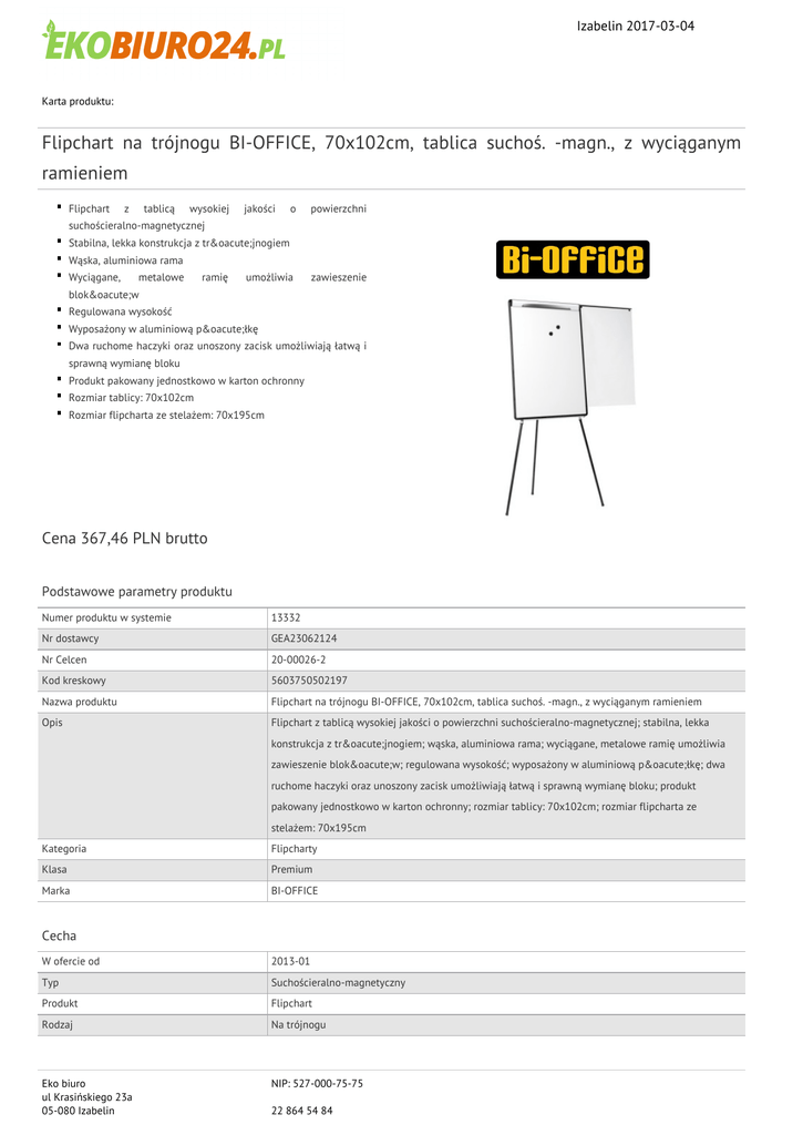 Izabelin 2017-03-04 Karta produktu: Flipchart na trójnogu BI-OFFICE, 70x102cm, tablica suchoś. -magn., z wyciąganym ramieniem Flipchart z tablicą wysokiej jakości o powierzchni umożliwia zawieszenie suchościeralno-magnetycznej Stabilna, lekka konstrukcja z trójnogiem Wąska, aluminiowa rama Wyciągane, metalowe ramię bloków Regulowana wysokość Wyposażony w aluminiową półkę Dwa ruchome haczyki oraz unoszony zacisk umożliwiają łatwą i sprawną wymianę bloku Produkt pakowany jednostkowo w karton ochronny Rozmiar tablicy: 70x102cm Rozmiar flipcharta ze stelażem: 70x195cm Cena 367,46 PLN brutto Podstawowe parametry produktu Numer produktu w systemie 13332 Nr dostawcy GEA23062124 Nr Celcen 20-00026-2 Kod kreskowy 5603750502197 Nazwa produktu Flipchart na trójnogu BI-OFFICE, 70x102cm, tablica suchoś. -magn., z wyciąganym ramieniem Opis Flipchart z tablicą wysokiej jakości o powierzchni suchościeralno-magnetycznej; stabilna, lekka konstrukcja z trójnogiem; wąska, aluminiowa rama; wyciągane, metalowe ramię umożliwia zawieszenie bloków; regulowana wysokość; wyposażony w aluminiową półkę; dwa ruchome haczyki oraz unoszony zacisk umożliwiają łatwą i sprawną wymianę bloku; produkt pakowany jednostkowo w karton ochronny; rozmiar tablicy: 70x102cm; rozmiar flipcharta ze stelażem: 70x195cm Kategoria Flipcharty Klasa Premium Marka BI-OFFICE Cecha W ofercie od 2013-01 Typ Suchościeralno-magnetyczny Produkt Flipchart Rodzaj Na trójnogu Eko biuro ul Krasińskiego 23a 05-080 Izabelin NIP: 527-000-75-75 22 864 54 84 Izabelin 2017-03-04 Karta katalogowa produktu cd. Flipchart na trójnogu BI-OFFICE, 70x102cm, tablica suchoś. -magn., z wyciąganym ramieniem Materiał Aluminium Wymiary Rozmiar Regulowany Wymiary (mm) 700x1020 Wspólny słownik zamówień CPV 30195913-5 Sztalugi flipchart Certyfikaty Nowy produkt w ofercie Standard Hit Standard Kolor Kolor Biały Serdecznie zapraszamy do współpracy Eko biuro zespół. Eko biuro ul Krasińskiego 23a 05-080 Izabelin NIP: 527-000-75-75 22 864 54 84