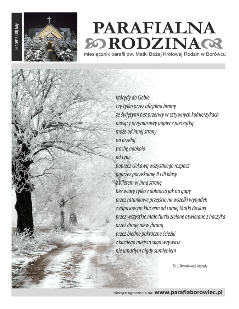 nr 1/2014 (58) luty PARAFIALNA RODZINA miesięcznik parafii pw. Matki Bożej Królowej Rodzin w Borówcu którędy do Ciebie czy tylko przez oficjalna bramę ze świętymi bez przerwy w sztywnych kołnierzykach niosący przymusowy papier z pieczątką może od innej strony na przełaj trochę naokoło od tyłu poprzez ciekawą wszystkiego rozpacz poprzez poczekalnię II i III klasy z biletem w inną stronę bez wiary tylko z dobrocią jak na gapę przez ratunkowe przejście na wszelki wypadek z zapasowym kluczem od samej Matki Boskiej przez wszystkie małe furtki zielone otwierane z haczyka przez drogę niewybraną przez biedne pokraczne ścieżki z każdego miejsca skąd wzywasz nie umarłym nigdy sumieniem Ks. J. Twardowski, Którędy bieżące ogłoszenia na: www.parafiaborowiec.pl POCHYL SIĘ I DAJ NADZIEJĘ Światowy Dzień Chorego. 11 lutego obchodzić będziemy Światowy Dzień Chorego obchodzony jest 11 lutego. W tym roku przypada we wtorek. Główne obchody tego dnia po raz pierwszy odbyły się w 1993 roku w Lourdes. Udział w nich wziął papież Jan Paweł II, który w 1992 roku ten dzień ustanowił w rocznicę objawień fatimskich. Jan Paweł II w swoich Orędziach na Światowy Dzień Chorego pocieszał cierpiących, wspierał ich, dodawał otuchy, przywracał nadzieję, pokazywał jak nie dać się złamać cierpieniu. Oto kilka wybranych fragmentów wypowiedzi Ojca Świętego na Światowy Dzień Chorego. W 1994 roku: ,,Chciałbym stanąć obok was, by ukoić wasze udręki, umacniać odwagę, ożywiać nadzieję, aby każdy z was umiał złożyć samego siebie w darze Chrystusowi dla dobra Kościoła i świata. Jak Maryja u stóp krzyża, pragnę stanąć na kalwarii tak wielu braci i sióstr, udręczonych, złożonych niemocą w szpitalach i okrytych żałobą po śmierci swoich bliskich.” W 1998 roku: ,, Drodzy ludzie chorzy, zajmujecie szczególne miejsce we wspólnocie Kościoła. Cierpienie, którego doznajecie i pragnienie odzyskania zdrowia kształtują w was szczególną wrażliwość na wartość nadziei. Wstawiennictwu Maryi powierzam wasze pragnienie zdrowia cielesnego i duchowego, zachęcając was, byście rozjaśnili je i wzbogacili teologalną cnotą nadziei, która jest darem Chrystusa.” Na spotkaniu z chorymi w 2002: ,,Walka z chorobą jest słuszna, ponieważ zdrowie jest darem Bożym. Lecz zarazem ważne jest, by umieć odczytać plan Boga, kiedy cierpienie puka do drzwi naszego życia. Dla nas wierzących, kluczem do odczytania tej tajemnicy jest krzyż Chrystusa. Słowo Wcielone nie odgrodziło się od naszych ludzkich ograniczeń, przyjęło je całkowicie na siebie na Golgocie. Odtąd cierpienie nabrało sensu, który czyni je szczególnie cennym. Od tego momentu cierpienie, każdy jego przejaw, nabiera nowego i specyficznego znaczenia, gdyż staje się uczestnictwem w zbawczym dziele Odkupiciela. Nasze cierpienia nabierają wartości i pełnego znaczenia jedynie wtedy, gdy są włączone w Jego mękę. Przeżywane w świetle wiary, stają się źródłem nadziei i zbawienia.” Opr. HD "Dzień Chorego”. Rozmowy na temat opieki nad chorymi przeprowadziła Jolanta Czechowicz. Dziecko urodziło się zdrowe. Nikt z nas nie przypuszczał, że po szczęściu, które trwało kilka miesięcy przyjdzie czas na rozpacz. Jestem ojcem dziecka ze sporym upośledzeniem umysłowym i fizycznym. Lekarzy od początku niepokoiły pewne objawy chorobowe, których my - rodzice nie chcieliśmy widzieć i tak na prawdę ich nie zauważaliśmy. Nie dopuszczaliśmy myśli, że z naszym synkiem może być coś nie tak. Upośledzenie umysłowe!!! Bzdura jakaś. To nie wchodziło w grę. Badania specjalistyczne, powtórki tych badań na nasze życzenie i ten potworny cios - a jednak to prawda. Świat zawalił się. Byliśmy zdruzgotani... tu nie ma słów. Łzy lały się dzień i noc. Przecież to niemożliwe. My wykształceni ludzie... a nasze dziecko nigdy nie skończy szkoły? Nigdy nie nauczy się czytać? Nigdy nie kupię mu książki? To jakiś absurd!!! To koniec świata! Czyja w tym wina? Kara Boża? Dlaczego my? Cokolwiek to było - nic nie mogliśmy zrobić. Żeby dalej żyć trzeba było zaakceptować chorobę synka. Opieka - na okrągło, cały czas. Przecież zdrowe dzieci też płaczą, też budzą się w nocy, też łapią infekcje - to pocieszające... tak samo jak nasze dziecko. Czasami nie potrafiłem zachować się stosownie tak jakbym wstydził się swojego dziecka /przed kolegami z pracy/. Ludzie bywają okrutni - nie są w stanie zrozumieć innego zachowania, odbiegającego od normy. Te spojrzenia, te uśmieszki, te uwagi o rozwoju /czy też niedorozwoju/ synka itp. Z czasem przestałem się tym przejmować, przestałem ze smutną miną informować, że mam upośledzone dziecko. Zrozumiałem, że muszę pochylić się i dać nadzieję temu dziecku. Akceptacja i miłość /tak trudna na początku dla nas obojga/. Uśmiech. I w końcu radość - radość, że kopnął piłkę, radość, że klasnął w rączki, radość z każdego najdrobniejszego nawet osiągnięcia. Syn jest naszym największym szczęściem i cudem. Nie jest karą Boga... Bóg nie jest zły... I tylko czasami drżę o jego dalsze życie, kiedy nas zabraknie... Ojciec Mój mąż już odszedł... siedem lat chorował na raka prostaty i w końcu choroba go pokonała. Ktoś powie - mieliśmy czas żeby się przygotować na jego odejście. Tak - mieliśmy sporo czasu, ale i tak za mało... zawsze jest za mało... Ludzie czasami mówią, że chcieli by umrzeć szybko i bez bólu. Nam było dane powolne gaśnięcie życia z dużymi dolegliwościami bólowymi. To był bardzo trudny czas dla całej naszej rodziny. Kiedy mąż był już bardzo słaby bałam się o każdy dzień, o każdą godzinę jego życia. Lekarz, pielęgniarka zapewniali opiekę i leczenie, ale to my rodzina - byliśmy z nim cały czas - dzień i noc. Gotowi zrobić wszystko aby cierpienie było mniejsze. Zmęczeni, ale 