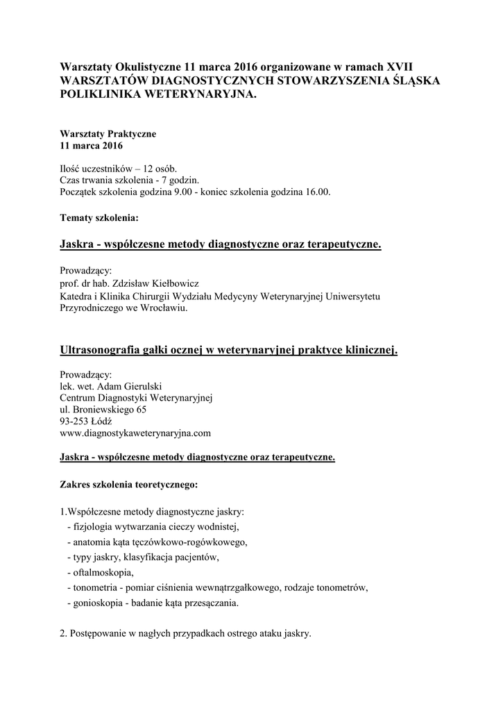 Warsztaty Okulistyczne 11 marca 2016 organizowane w ramach XVII WARSZTATÓW DIAGNOSTYCZNYCH STOWARZYSZENIA ŚLĄSKA POLIKLINIKA WETERYNARYJNA. Warsztaty Praktyczne 11 marca 2016 Ilość uczestników – 12 osób. Czas trwania szkolenia - 7 godzin. Początek szkolenia godzina 9.00 - koniec szkolenia godzina 16.00. Tematy szkolenia: Jaskra - współczesne metody diagnostyczne oraz terapeutyczne. Prowadzący: prof. dr hab. Zdzisław Kiełbowicz Katedra i Klinika Chirurgii Wydziału Medycyny Weterynaryjnej Uniwersytetu Przyrodniczego we Wrocławiu. Ultrasonografia gałki ocznej w weterynaryjnej praktyce klinicznej. Prowadzący: lek. wet. Adam Gierulski Centrum Diagnostyki Weterynaryjnej ul. Broniewskiego 65 93-253 Łódź www.diagnostykaweterynaryjna.com Jaskra - współczesne metody diagnostyczne oraz terapeutyczne. Zakres szkolenia teoretycznego: 1.Współczesne metody diagnostyczne jaskry: - fizjologia wytwarzania cieczy wodnistej, - anatomia kąta tęczówkowo-rogówkowego, - typy jaskry, klasyfikacja pacjentów, - oftalmoskopia, - tonometria - pomiar ciśnienia wewnątrzgałkowego, rodzaje tonometrów, - gonioskopia - badanie kąta przesączania. 2. Postępowanie w nagłych przypadkach ostrego ataku jaskry. 3. Zwichnięcie soczewki u pacjentów z jaskrą; - pierwotne zwichnięcie soczewki, - wtórne zwichnięcie soczewki, - metody diagnostyczne, - postępowanie chirurgiczne w przypadku zwichnięcia soczewki. 4. Wylew krwi do komory przedniej u pacjentów z jaskrą: - patogeneza krwistka komory przedniej, - postępowanie farmakologiczne, - postępowanie chirurgiczne – metody usunięcie krwistka. 6. Terapia farmakologiczna. 7. Zabiegi cyklodestrukcyjne stosowane w operacyjnej terapii jaskry: - cyklokrioterpia - kriodestrukcja pasa twardówki na granicy z ciałem rzęskowym, - cyklodiatermia - anemizacja naczyń krwionośnych ciała rzęskowego pod płatkiem twardówki za pomocą cienkiej elektrody, - ablacja iniekcyjna z zastosowaniem środka farmakologicznego aplikowanego do komory ciała szklistego. Zakres szkolenia praktycznego: 1.Cykloablacja termiczna : - cyklokrioterpia - kriodestrukcja pasa twardówki na granicy z ciałem rzęskowym z wykorzystaniem aparatu do krioterapii, - cyklodiatermia - przeztwardówkowa anemizacja naczyń krwionośnych ciała rzęskowego za pomocą cienkiej elektrody z wykorzystaniem diatermii. 2. Ablacja farmakologiczna - procedura iniekcji środka farmakologicznego do komory ciała szklistego. 3. Zwichnięcie soczewki u pacjentów z jaskrą. - postępowanie chirurgiczne w przypadku zwichnięcia soczewki. Zajęcia praktyczne na spreparowanych świńskich gałkach ocznych prowadzone na dwóch stanowiskach wyposażonych w okulistyczne mikroskopy operacyjne, diatermię, aparat do krioterapii (2 grupy 3-osobowe). W trakcie w/w zajęć każdy z uczestników kursu indywidualnie pod kontrolą prowadzącego szkolenie wykona procedurę operacyjną na stanowisku z mikroskopem. Ultrasonografia gałki ocznej w weterynaryjnej praktyce klinicznej. Wykład teoretyczny i prezentacja multimedialna: 1. Ultrasonografia gałki ocznej w weterynaryjnej praktyce klinicznej. 2. Biometria gałki ocznej ze szczególnym uwzględnieniem jaskry. Zakres szkolenia praktycznego: USG gałki ocznej: 1.Indywidualne praktyczne ćwiczenia z zakresu ultrasonografii gałki ocznej na świńskich gałkach ocznych na 2 stanowiskach z wykorzystaniem aparatów USG. 2. Ocena wartości kąta przesączania (rogówkowo-tęczówkowego). 3.Unaczynienie i przepływy w obrębie gałki ocznej i oczodołu. 4.Ultrasonograficzne badania nerwu wzrokowego. Ilość miejsc ograniczona: 12 osób. Miejsce szkolenia: Gabinet Weterynaryjny 40-144 Katowice ul. Józefowska 40B. www.klinwetsilesiacenter.pl Z uwagi na wysokospecjalistyczny charakter zajęć w celu uczestnictwa niezbędne wcześniejsze zgłoszenie: dr n. wet. Marek Kostrzewski, kom. 501 955 017, [email protected] Warsztaty Okulistyczne dnia 11.03.2016 godz. 09.00-16.00 Miejsce szkolenia : Gabinet Weterynaryjny 40-144 Katowice ul. Józefowska 40B Wyposażenie techniczne dzięki zaangażowaniu w projekt wiodących na rynku firm medycznych: Aparaty ultrasonograficzne - www.sensomedical.pl Kruuse Polska Sp. z o.o - www.kruuse.com/pl Seliga Microscopes Sp. z o.o. - www.seliga.pl Abj-Vision sp. z o.o. - www.abj-vision.pl