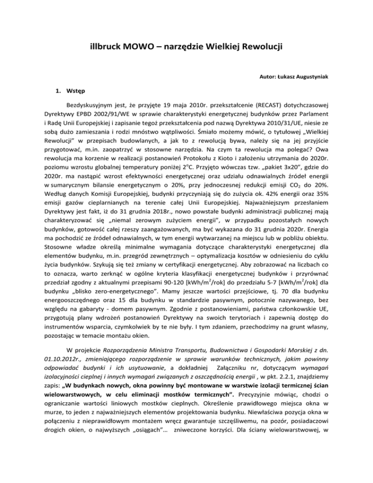 illbruck MOWO – narzędzie Wielkiej Rewolucji Autor: Łukasz Augustyniak 1. Wstęp Bezdyskusyjnym jest, że przyjęte 19 maja 2010r. przekształcenie (RECAST) dotychczasowej Dyrektywy EPBD 2002/91/WE w sprawie charakterystyki energetycznej budynków przez Parlament i Radę Unii Europejskiej i zapisanie tegoż przekształcenia pod nazwą Dyrektywa 2010/31/UE, niesie ze sobą dużo zamieszania i rodzi mnóstwo wątpliwości. Śmiało możemy mówić, o tytułowej „Wielkiej Rewolucji” w przepisach budowlanych, a jak to z rewolucją bywa, należy się na jej przyjście przygotować, m.in. zaopatrzyć w stosowne narzędzia. Na czym ta rewolucja ma polegać? Owa rewolucja ma korzenie w realizacji postanowień Protokołu z Kioto i założeniu utrzymania do 2020r. poziomu wzrostu globalnej temperatury poniżej 2oC. Przyjęto wówczas tzw. „pakiet 3x20”, gdzie do 2020r. ma nastąpić wzrost efektywności energetycznej oraz udziału odnawialnych źródeł energii w sumarycznym bilansie energetycznym o 20%, przy jednoczesnej redukcji emisji CO2 do 20%. Według danych Komisji Europejskiej, budynki przyczyniają się do zużycia ok. 42% energii oraz 35% emisji gazów cieplarnianych na terenie całej Unii Europejskiej. Najważniejszym przesłaniem Dyrektywy jest fakt, iż do 31 grudnia 2018r., nowo powstałe budynki administracji publicznej mają charakteryzować się „niemal zerowym zużyciem energii”, w przypadku pozostałych nowych budynków, gotowość całej rzeszy zaangażowanych, ma być wykazana do 31 grudnia 2020r. Energia ma pochodzić ze źródeł odnawialnych, w tym energii wytwarzanej na miejscu lub w pobliżu obiektu. Stosowne władze określą minimalne wymagania dotyczące charakterystyki energetycznej dla elementów budynku, m.in. przegród zewnętrznych – optymalizacja kosztów w odniesieniu do cyklu życia budynków. Szykują się też zmiany w certyfikacji energetycznej. Aby zobrazować na liczbach co to oznacza, warto zerknąć w ogólne kryteria klasyfikacji energetycznej budynków i przyrównać przedział zgodny z aktualnymi przepisami 90-120 [kWh/m2/rok] do przedziału 5-7 [kWh/m2/rok] dla budynku „blisko zero-energetycznego”. Mamy jeszcze wartości przejściowe, tj. 70 dla budynku energooszczędnego oraz 15 dla budynku w standardzie pasywnym, potocznie nazywanego, bez względu na gabaryty - domem pasywnym. Zgodnie z postanowieniami, państwa członkowskie UE, przygotują plany wdrożeń postanowień Dyrektywy na swoich terytoriach i zapewnią dostęp do instrumentów wsparcia, czymkolwiek by te nie były. I tym zdaniem, przechodzimy na grunt własny, pozostając w temacie montażu okien. W projekcie Rozporządzenia Ministra Transportu, Budownictwa i Gospodarki Morskiej z dn. 01.10.2012r., zmieniającego rozporządzenie w sprawie warunków technicznych, jakim powinny odpowiadać budynki i ich usytuowanie, a dokładniej Załączniku nr, dotyczącym wymagań izolacyjności cieplnej i innych wymagań związanych z oszczędnością energii , w pkt. 2.2.1, znajdziemy zapis: „W budynkach nowych, okna powinny być montowane w warstwie izolacji termicznej ścian wielowarstwowych, w celu eliminacji mostków termicznych”. Precyzyjnie mówiąc, chodzi o ograniczanie wartości liniowych mostków cieplnych. Określenie prawidłowego miejsca okna w murze, to jeden z najważniejszych elementów projektowania budynku. Niewłaściwa pozycja okna w połączeniu z nieprawidłowym montażem wręcz gwarantuje szczęśliwemu, na pozór, posiadaczowi drogich okien, o najwyższych „osiągach”… zniweczone korzyści. Dla ściany wielowarstwowej, w szczególności trójwarstwowej, prawidłowy przebieg izoterm rejestrowany jest przy wysunięciu okna w warstwę ocieplenia. Kwestii montażu, a konkretnie uszczelnienia złącza okiennego, dotyczy także pkt. 2.3.2, który brzmi „W budynku mieszkalnym, zamieszkania zbiorowego i budynku użyteczności publicznej, współczynnik infiltracji powietrza dla otwieranych okien i drzwi balkonowych, powinien wynosić nie więcej niż 0,3 [m3/m*h*daPa2/3], z zaleceniem, aby po skończeniu budowy, budynek został poddany próbie szczelności przeprowadzonej zgodnie z Polską Normą (pkt. 2.3.4 załącznika nr 2 do Rosporządzenia). 2. Potrzeba matką wynalazków Idea systemu illbruck MOWO (skrót – Montaż okna w ociepleniu), zrodziła się w Niemczech, gdzie grupa inżynierów firmy Tremco illbruck, w ramach analizy projektów w Europie, odnotowała absolutny brak standardów uszczelnienia złącza okiennego w strefie izolacji termicznej (Fot. 1). W zasadzie ile budów na których realizowany był montaż w ociepleniu, tyle wariacji na jego temat i nikt nie dałby sobie przysłowiowej ręki uciąć gwarantując za jego poprawność tym samym. Najczęściej montaż taki realizowany był przy pomocy specjalnych konsol w połączeniu z foliami (membranami używanymi jak dotąd w montażu trójwarstwowym - zwanym popularnie ciepłym montażem). O ile na etapie koncepcji sprawa wydawała się „zjadliwa”, o tyle na etapie wykonawczym nie jeden monter ze swoim szefem zachodzili w głowę, post factum, jak podejść do tematu na budowie. Straszono ich bowiem od początku, że ich praca będzie poddana ocenie termowizyjnej i niedbalstwo czy brak wiedzy w tym co robią zostanie im przedłożone kolorowo na białym. Jedni wywiązali się z zadania jako tako, ocierając pot z czoła, drudzy główkowali jak naprawić błędy najmniejszym kosztem. Inwestor zapłacił przecież niemałe pieniądze, oczekując usługi na równie wysokim poziomie jak parametry okna pasywnego, które zakupił i przekazał do montażu fachowcom. (Fot. 1 Brak standardów) Firma Tremco illbruck, również w Polsce odnotowała znaczny wzrost liczby zapytań o taki sposób montażu ze strony architektów i projektantów, co wskazuje że i nasz rynek przygotowuje się merytorycznie do Wielkiej Rewolucji. Firma zdecydowała we wrześniu br. o wdrożeniu systemu illbruck 
