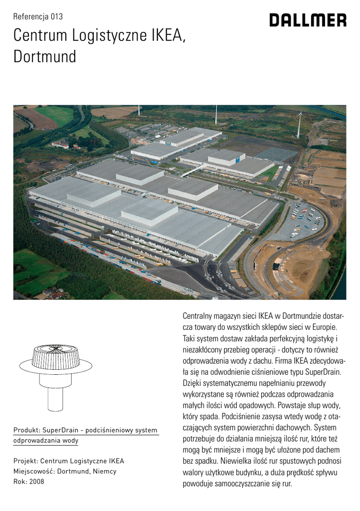 Referencja 013 Centrum Logistyczne IKEA, Dortmund Produkt: SuperDrain - podciśnieniowy system odprowadzania wody Projekt: Centrum Logistyczne IKEA Miejscowość: Dortmund, Niemcy Rok: 2008 Centralny magazyn sieci IKEA w Dortmundzie dostarcza towary do wszystkich sklepów sieci w Europie. Taki system dostaw zakłada perfekcyjną logistykę i niezakłócony przebieg operacji - dotyczy to również odprowadzenia wody z dachu. Firma Ikea zdecydowała się na odwodnienie ciśnieniowe typu SuperDrain. Dzięki systematycznemu napełnianiu przewody wykorzystane są również podczas odprowadzania małych ilości wód opadowych. Powstaje słup wody, który spada. Podciśnienie zasysa wtedy wodę z otaczających system powierzchni dachowych. System potrzebuje do działania mniejszą ilość rur, które też mogą być mniejsze i mogą być ułożone pod dachem bez spadku. Niewielka ilość rur spustowych podnosi walory użytkowe budynku, a duża prędkość spływu powoduje samooczyszczanie się rur. Fotografia Fotografia prasowa IKEA Deutschland