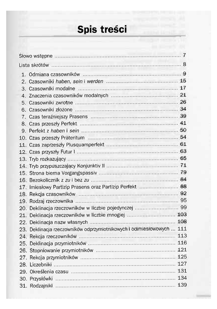 Spis treści Słowo wstępne 7 Lista skrótów 8 1. 2. 3. 4. 5. 6. 7. 8. 9. 10. 11. 12. 13. 14. 15. 16. 17. 18. 19. 20. 21. 22. 23. 24. 25. 26. 27. 28. 29. 30. 31. Odmiana czasowników 9 Czasowniki haben, sein i werden 15 Czasowniki modalne 17 Znaczenia czasowników modalnych 21 Czasowniki zwrotne 26 Czasowniki złożone 34 Czas teraźniejszy Prasens 39 Czas przeszły Perfekt 41 Perfekt z haben i sein 50 Czas przeszły Prateritum 54 Czas zaprzeszły Plusquamperfekt 61 Czas przyszły Futur I 63 Tryb rozkazujący 65 Tryb przypuszczający Konjunktiv II 71 Strona bierna Vorgangspassiv 79 Bezokolicznik z zu i bez zu 84 Imiesłowy Partizip Prasens oraz Partizip Perfekt 88 Rekcja czasowników 92 Rodzaj rzeczownika 95 Deklinacja rzeczowników w liczbie pojedynczej 99 Deklinacja rzeczowników w liczbie mnogiej 103 Deklinacja nazw własnych 108 Deklinacja rzeczowników odprzymiotnikowych i odimiesłowowych ... 111 Rekcja rzeczowników 113 Deklinacja przymiotników 116 Stopniowanie przymiotników 121 Rekcja przymiotników 125 Liczebniki 127 Określenia czasu 131 Przysłówki 134 Rodzajniki 139 32. Zaimki osobowe 33. Zaimki dzierżawcze 34. Zaimki wskazujące 35. Zaimki nieokreślone 36. Zaimki pytajne 37. Zaimki względne 38. Zaimek es 39. Przyimki z biernikiem 40. Przyimki z celownikiem 41. Przyimki z biernikiem lub celownikiem 42. Przyimki z dopełniaczem 43. Przyimki czasu 44. Przyimki miejsca i kierunku 45. Przyimki przyczyny 46. Przeczenia nein, nicht i kein 47. Zdania pojedyncze 48. Zdania złożone współrzędnie 49. Zdania złożone podrzędnie 50. Zdania okolicznikowe przyczyny 51. Zdania okolicznikowe czasu 52. Zdania okolicznikowe przyzwolenia 53. Zdania okolicznikowe celu 54. Zdania okolicznikowe warunku 55. Zdania dopełnieniowe 56. Zdania przydawkowe/względne 57. Słowotwórstwo 58. Wyrażenia rzeczownikowo-czasownikowe 144 149 154 156 164 167 169 171 174 177 181 183 188 197 199 202 207 212 215 219 224 226 228 230 237 240 245 Test sprawdzający znajomość gramatyki na poziomie Al-Bl 249 Tabele gramatyczne 257 Niemiecko-polski glosariusz pojęć gramatycznych 275 Polsko-niemiecki glosariusz pojęć gramatycznych 279 Rozwiązania 283