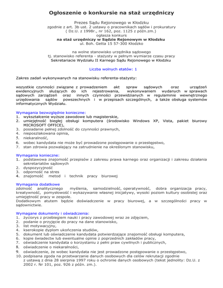 Ogłoszenie o konkursie na staż urzędniczy Prezes Sądu Rejonowego w Kłodzku zgodnie z art. 3b ust. 2 ustawy o pracownikach sądów i prokuratury ( Dz.U. z 1998r., nr 162, poz. 1125 z późn.zm.) ogłasza konkurs na staż urzędniczy w Sądzie Rejonowym w Kłodzku ul. Boh. Getta 15 57-300 Kłodzko na wolne stanowisko urzędnika sądowego tj. stanowisko referenta - stażysty w pełnym wymiarze czasu pracy Sekretariacie Wydziału II Karnego Sądu Rejonowego w Kłodzku Liczba wolnych etatów: 1 Zakres zadań wykonywanych na stanowisku referenta-stażysty: wszystkie czynności związane z prowadzeniem akt spraw sądowych oraz urządzeń ewidencyjnych służących do ich rejestrowania, wykonywaniem wydanych w sprawach sądowych zarządzeń oraz innych czynności przewidzianych w regulaminie wewnętrznego urzędowania sądów powszechnych i w przepisach szczególnych, a także obsługa systemów informatycznych Wydziału. Wymagania bezwzględnie konieczne: 1. wykształcenie wyższe zawodowe lub magisterskie, 2. umiejętność biegłej obsługi komputera (środowisko Windows XP, Vista, pakiet biurowy MICROSOFT OFFICE), 3. posiadanie pełnej zdolność do czynności prawnych, 4. nieposzlakowana opinia, 5. niekaralność, 6. wobec kandydata nie może być prowadzone postępowanie o przestępstwo, 7. stan zdrowia pozwalający na zatrudnienie na określonym stanowisku, Wymagania konieczne: 1. podstawowa znajomość przepisów z zakresu prawa karnego oraz organizacji i zakresu działania sekretariatów sądowych 2. dyspozycyjność 3. odporność na stres 4. znajomość metod i technik pracy biurowej Wymagania dodatkowe zdolność analitycznego myślenia, samodzielność, operatywność, dobra organizacja pracy, kreatywność, pomysłowość i wykazywanie własnej inicjatywy, wysoki poziom kultury osobistej oraz umiejętność pracy w zespole. Dodatkowym atutem będzie doświadczenie w pracy biurowej, a w szczególności pracy w sądownictwie. Wymagane dokumenty i oświadczenia: 1. życiorys z przebiegiem nauki i pracy zawodowej wraz ze zdjęciem, 2. podanie o przyjęcie do pracy na dane stanowisko, 3. list motywacyjny, 4. kserokopie dyplom ukończenia studiów, 5. dokument lub oświadczenie kandydata potwierdzające znajomość obsługi komputera, 6. kopie świadectw lub ewentualne opinie z poprzednich zakładów pracy, 7. oświadczenie kandydata o korzystaniu z pełni praw cywilnych i publicznych, 8. oświadczenie o niekaralności, 9. oświadczenie, że wobec kandydata nie jest prowadzone postępowanie o przestępstwo, 10. podpisana zgoda na przetwarzanie danych osobowych dla celów rekrutacji zgodnie z ustawą z dnia 28 sierpnia 1997 roku o ochronie danych osobowych (tekst jednolity: Dz.U. z 2002 r. Nr 101, poz. 926 z późn. zm.). Kandydaci poddani będą 2-etapowemu konkursowi: I etap – ocena formalna dokumentów złożonych przez kandydatów, II etap – rozmowa kwalifikacyjna oceniająca predyspozycje i zdolności ogólne kandydata Konkurs przeprowadzi Komisja Konkursowa powołana przez Prezesa Sądu Rejonowego w Kłodzku. Dokumenty należy do dnia 09 maja 2008 roku złożyć osobiście w siedzibie Sądu Rejonowego w Kłodzku przy ul. Boh. Getta 15 w Oddziale Kadr pokój nr 132 a. Lista osób zakwalifikowanych do II etapu konkursu zostanie umieszczona na stronie internetowej oraz tablicy informacyjnej Sądu w dniu 14 maja 2008r. Etap II odbędzie się w dniu 15 maja 2008r. w gmachu Sądu Rejonowego. Inne informacje: Oferty złożone po terminie nie będą rozpatrywane. Kandydaci dopuszczeni do konkursu zostaną powiadomieni o terminie i miejscu egzaminu poprzez umieszczenie listy kandydatów, na stronie internetowej oraz na tablicy informacyjnej Sądu. Oferty odrzucone będzie można odebrać w ciągu trzech dni od ukazania się komunikatu na stronie internetowej w Oddziale Kadr – 132a. Nieodebrane dokumenty w zakreślonym terminie zostaną komisyjnie zniszczone.