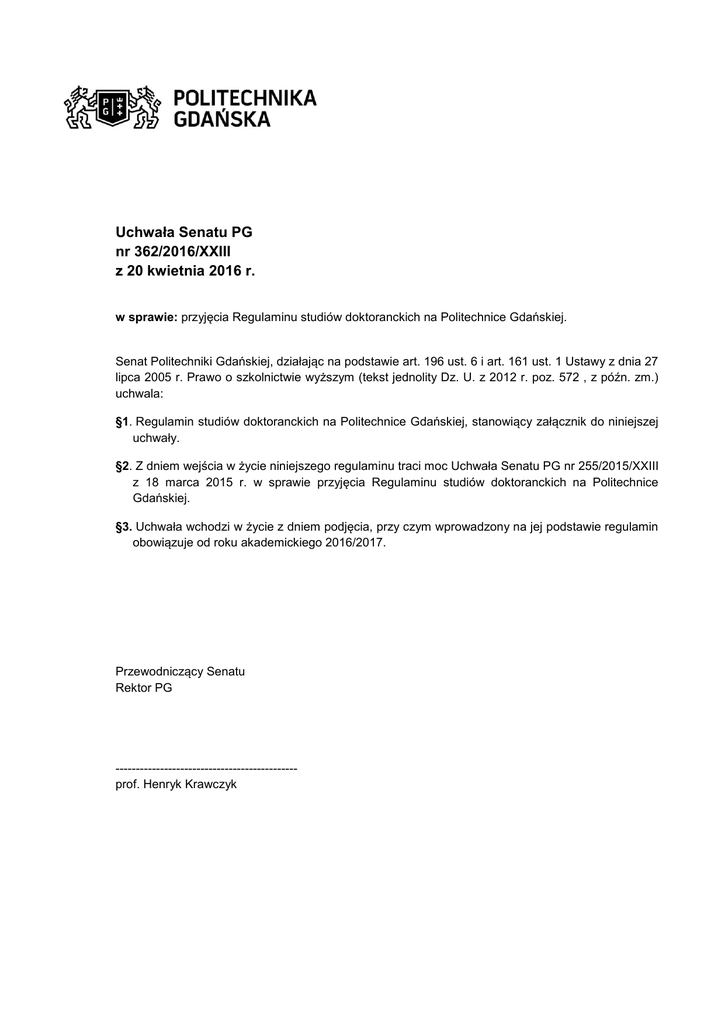 Uchwała Senatu PG nr 362/2016/XXIII z 20 kwietnia 2016 r. w sprawie: przyjęcia Regulaminu studiów doktoranckich na Politechnice Gdańskiej. Senat Politechniki Gdańskiej, działając na podstawie art. 196 ust. 6 i art. 161 ust. 1 Ustawy z dnia 27 lipca 2005 r. Prawo o szkolnictwie wyższym (tekst jednolity Dz. U. z 2012 r. poz. 572 , z późn. zm.) uchwala: §1. Regulamin studiów doktoranckich na Politechnice Gdańskiej, stanowiący załącznik do niniejszej uchwały. §2. Z dniem wejścia w życie niniejszego regulaminu traci moc Uchwała Senatu PG nr 255/2015/XXIII z 18 marca 2015 r. w sprawie przyjęcia Regulaminu studiów doktoranckich na Politechnice Gdańskiej. §3. Uchwała wchodzi w życie z dniem podjęcia, przy czym wprowadzony na jej podstawie regulamin obowiązuje od roku akademickiego 2016/2017. Przewodniczący Senatu Rektor PG --------------------------------------------prof. Henryk Krawczyk Załącznik do Uchwały Senatu PG nr 362/2016/XXIII z 20 kwietnia 2016 r. Regulamin studiów doktoranckich na Politechnice Gdańskiej §1. Regulamin studiów doktoranckich określa organizację i tok studiów doktoranckich oraz związane z nimi prawa i obowiązki doktoranta. §2. 1. Podstawy prawne Regulaminu studiów doktoranckich stanowią: 1) ustawa z dnia 27 lipca 2005 r. Prawo o szkolnictwie wyższym (tekst jednolity Dz.U. z 2012 r. poz. 572 ze zm.), zwana dalej „ustawą”, 2) ustawa z dnia 14 marca 2003 r. o stopniach naukowych i tytule naukowym oraz o stopniach i tytule w zakresie sztuki (tekst jednolity Dz. U. z 2014 r. poz. 1852 ze zm.), 3) rozporządzenie Ministra Nauki i Szkolnictwa Wyższego z dnia 1 września 2011 r. w sprawie kształcenia na studiach doktoranckich w uczelniach i jednostkach naukowych (Dz. U. z 2015 r., poz. 172), 4) rozporządzenie Ministra Nauki i Szkolnictwa Wyższego z dnia 24 października 2014 r. w sprawie studiów doktoranckich i stypendiów doktoranckich (Dz. U. z 2014 r., poz. 1480), 5) rozporządzenie Ministra Nauki i Szkolnictwa Wyższego z 12 października 2006 r. w sprawie podejmowania i odbywania przez cudzoziemców studiów i szkoleń oraz ich uczestnictwa w badaniach naukowych i pracach rozwojowych (Dz. U. z 2006 r. nr 190, poz. 1406 ze zm.), 6) Statut Politechniki Gdańskiej. 2. Użyte w niniejszym regulaminie pojęcia oznaczają: 1) doktorant – uczestnik studiów doktoranckich, 2) kierownik jednostki organizacyjnej – dziekan wydziału, 3) rada jednostki organizacyjnej – rada wydziału, 4) uczelnia – Politechnika Gdańska, 5) jednostka organizacyjna – wydział. I. Przepisy ogólne §3. 1. Studia doktoranckie mogą prowadzić jednostki organizacyjne uczelni, które mają uprawnienia do nadawania stopnia naukowego doktora habilitowanego albo co najmniej dwa uprawnienia do nadawania stopnia naukowego doktora w zakresie dyscyplin odpowiadających tym uprawnieniom. 2. Studia doktoranckie mogą być studiami środowiskowymi prowadzonymi przez jednostki, o których mowa w ust. 1. Szczegółowy podział zadań poszczególnych jednostek oraz sposób finansowania studiów doktoranckich określają umowy zawarte między tymi jednostkami. 3. Wykłady na Politechnice doktoranckich są otwarte. Gdańskiej prowadzone w ramach stacjonarnych studiów 4. Wykłady i zajęcia na studiach doktoranckich mogą być prowadzone: 1) w języku obcym, w zakresie wybranych przedmiotów określonych w programie studiów, z zachowaniem zasady, że egzaminy lub zaliczenia w zakresie tych przedmiotów również powinny być prowadzone w języku obcym, 2) z wykorzystaniem technik kształcenia na odległość. 5. Studia doktoranckie są tworzone przez rektora na wniosek rady jednostki organizacyjnej, o której mowa w ust. 1. §4. 1. Rektor, po zasięgnięciu opinii właściwej rady jednostki organizacyjnej i właściwego organu samorządu doktorantów, powołuje i odwołuje kierownika studiów doktoranckich. 2. Rektor określa regulamin przyznawania stypendiów doktoranckich i zwiększenia stypendium doktoranckiego z dotacji podmiotowej na sfinansowanie zadań projakościowych. 3. Właściwy organ samorządu doktorantów wyraża opinię, o której mowa w ust. 1, w terminie 14 dni od dnia otrzymania wniosku o jej wydanie, z tym, że wymóg zasięgnięcia opinii uważa się za spełniony również w przypadku bezskutecznego upływu tego terminu. 4. Kierownik studiów doktoranckich: 1) organizuje realizację programu studiów doktoranckich, 2) dokonuje oceny realizacji programu studiów doktoranckich, w tym prowadzenia badań naukowych przez doktorantów, w sposób określony przez radę jednostki organizacyjnej, 3) podejmuje decyzje w sprawie zaliczenia kolejnych lat studiów doktoranckich, 4) wyraża zgodę na przedłużenie okresu odbywania studiów doktoranckich, 5) przewodniczy komisji przyznającej stypendia, o których mowa w ust. 2, 6) zatwierdza indywidualne zajęcia doktorantów, 7) na wniosek doktoranta wyraża zgodę na przesunięcie terminu zaliczenia przedmiotu, nie dłużej jednak niż o rok. 5. Studia doktoranckie trwają 4 lata, z wyjątkiem przypadków wymienionych w ust. 6, 7 i 8 i kończą się zatwierdzeniem przez radę jednostki organizacyjnej uzyskania przez doktoranta stopnia doktora. 6. W przypadkach uzasadnionych koniecznością prowadzenia przez doktoranta długotrwałych badań naukowych, kierownik studiów doktoranckich może, po zasięgnięciu opinii promotora, przedłużyć o nie więcej niż 2 lata okres odbywania studiów doktoranckich, zwalniając jednocześnie doktoranta z obowiązku uczestniczenia w zajęciach w tym okresie. 7. W uzasadnionych przypadkach, kierownik studiów doktoranckich może przedłużyć, łącznie nie dłużej niż o jeden rok, okres odbywania studiów doktoranckich, zwalniając jednocześnie doktoranta z obowiązku uczestniczenia w zajęciach. Przypadkami tymi są w szczególności: 1) czasowa niezdolność do odbywania tych studiów spowodowana chorobą, 2) sprawowanie osobistej opieki na chorym człon