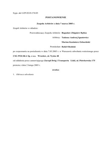 Sygn. akt UZP/ZO/0-376/05 POSTANOWIENIE Zespołu Arbitrów z dnia 7 marca 2005 r. Zespół Arbitrów w składzie: Przewodniczący Zespołu Arbitrów Bogusław Zbigniew Rębisz Arbitrzy: Tadeusz Andrzej Ignatowicz Marian Kazimierz Ochociński Protokolant Rafał Oksiński po rozpoznaniu na posiedzeniu w dniu 7.03.2005 r. w Warszawie odwołania wniesionego przez CSG POLSKA Sp. z o.o. Wrocław, ul. Nyska 48 od oddalenia przez zamawiającego Zarząd Dróg i Transportu Łódź, ul. Piotrkowska 175 protestu z dnia 2 lutego 2005 r. orzeka: 1. Odrzuca odwołanie. 2. Kosztami postępowania obciąża CSG POLSKA Sp. z o.o. Wrocław, ul. Nyska 48 i nakazuje: 1) zaliczyć na rzecz Urzędu Zamówień Publicznych koszty w wysokości 2 636 zł 78 gr (słownie: dwa tysiące sześćset trzydziesci sześć złotych siedemdziesiąt osiem groszy) z kwoty wpisu uiszczonego przez CSG POLSKA Sp. z o.o. Wrocław, ul. Nyska 48 2) dokonać wpłaty kwoty 0 zł 00 gr (słownie: xxx) przez xxx na rzecz xxx 3) dokonać wpłaty kwoty 0 zł 00 gr (słownie: xxx) przez xxx na rzecz Urzędu Zamówień Publicznych na rachunek środków specjalnych UZP 4) dokonać zwrotu kwoty 3 476 zł 22 gr (słownie: trzy tysiące czterysta siedemdziesiąt sześć złotych dwadzieścia dwa grosze) z rachunku środków specjalnych Urzędu Zamówień Publicznych na rzecz CSG POLSKA Sp. z o.o. Wrocław, ul. Nyska 48. 3. Uzasadnienie Zespół Arbitrów ustalił następujący stan faktyczny: CSG Polska Spółka z o.o. we Wrocławiu pismem z dnia 2 lutego 2005 roku wniosła protest w postępowaniu o udzielenie zamówienia publicznego na prowadzenie kontroli biletów w pojazdach lokalnego transportu zbiorowego na terenie miasta Łodzi. Protest ten do Zamawiającego – Zarządu Dróg i Transportu w Łodzi – został doręczony w dniu 3 lutego 2005 roku. W dniu 9 lutego 2005 roku faksem Protestujący otrzymał rozstrzygnięcie protestu i w dniu 14 lutego 2005 roku wniósł odwołanie do Prezesa Urzędu Zamówień Publicznych. Postanowieniem z dnia 23 lutego 2005 roku w sprawie UZP/ZO/0-320/05 Prezes Urzędu Strona 2 z 5 Zamówień Publicznych zwrócił odwołanie wobec nie uiszczenia wpisu. W dniu 14 lutego 2005 roku protestujący otrzymał pocztą pismo Zamawiającego zawierające rozstrzygnięcie protestu. W dniu 17 lutego 2005 roku CSG Polska Spółka z o.o. wniosła odwołanie do Prezesa Urzędu Zamówień Publicznych. Zespół Arbitrów zważył, co następuje: Zgodnie z art. 180 ust. 2 ustawy - Prawo zamówień publicznych protest uważa się za wniesiony z chwilą, gdy doszedł on do zamawiającego w taki sposób, że mógł zapoznać się z jego treścią. W niniejszym postępowaniu protest został, zatem wniesiony w dniu 3 lutego 2005 roku. Zgodnie z art. 183 ust. 1 ustawy - Prawo zamówień publicznych Zamawiający rozstrzyga protest nie później niż w terminie 5 dni od dnia jego wniesienia. Przez rozstrzygnięcie protestu należy rozumieć nie tylko sporządzenie w ustawowym terminie pisma zawierającego stanowisko Zamawiającego, ale również doręczenie w tym terminie rozstrzygnięcie protestującemu. Brak rozstrzygnięcia protestu (brak doręczenia rozstrzygnięcia) w tym terminie, uznaje się za jego oddalenie. W niniejszym postępowaniu w zgodzie w ustawowym terminem zamawiający mógł rozstrzygnąć protest do dnia 8 lutego 2005 roku, w tym dniu upływał termin do rozstrzygnięcia protestu. Rozstrzygnięcie protestu po upływie ustawowego 5 dniowego terminu należy traktować jako brak rozpatrzenia protestu. Na podstawie art. 184 ust. 2 ustawy - Prawo zamówień publicznych odwołanie (od oddalenia lub odrzucenia protestu) wnosi się do Prezesa Urzędu w terminie 5 dni od dnia doręczenia rozstrzygnięcia protestu lub upływu terminu do rozstrzygnięcia protestu. W przypadku braku rozstrzygnięcia protestu w terminie, odwołanie powinno być, zatem wniesione najpóźniej dziesiątego dnia następującego po wniesieniu protestu. W niniejszej sprawie odwołanie zostało wniesione w dniu 17 lutego 2005 roku. W ocenie Zespołu Arbitrów odwołanie zostało wniesione z uchybieniem terminu, bowiem zgodnie z wskazanymi wyżej przepisami ustawy termin na jego wniesienie należy liczyć od Strona 3 z 5 upływu terminu do rozstrzygnięcia protestu, czyli od dnia 8 lutego 2005 roku Termin na wniesienie odwołaniu upłynął, zatem w dniu 14 lutego 2005 roku a odwołanie wniesione w dniu 17 lutego 2005 roku jest spóźnione. Na podstawie art. 187 ust. 4 pkt 4 Zespół Arbitrów odrzuca odwołanie na posiedzeniu niejawnym, jeżeli stwierdzi, że protest lub odwołanie zostały wniesione z uchybieniem terminów określonych w ustawie i dlatego orzeczono jak na wstępie. Strona 4 z 5 Stosownie do art. 194 i 195 ustawy z dnia 29 stycznia 2004 r. – Prawo zamówień publicznych (Dz.U. Nr 19, poz. 177) na niniejszy wyrok – w terminie 7 dni od dnia jego doręczenia – przysługuje skarga za pośrednictwem Prezesa Urzędu Zamówień Publicznych do Sądu Okręgowego w ................................................1 Przewodniczący Zespołu Arbitrów: ................................................................... Arbitrzy: ................................................................... ................................................................... 1 Nie dotyczy postępowań wszczętych przed dniem 2 marca 2004 r. Strona 5 z 5