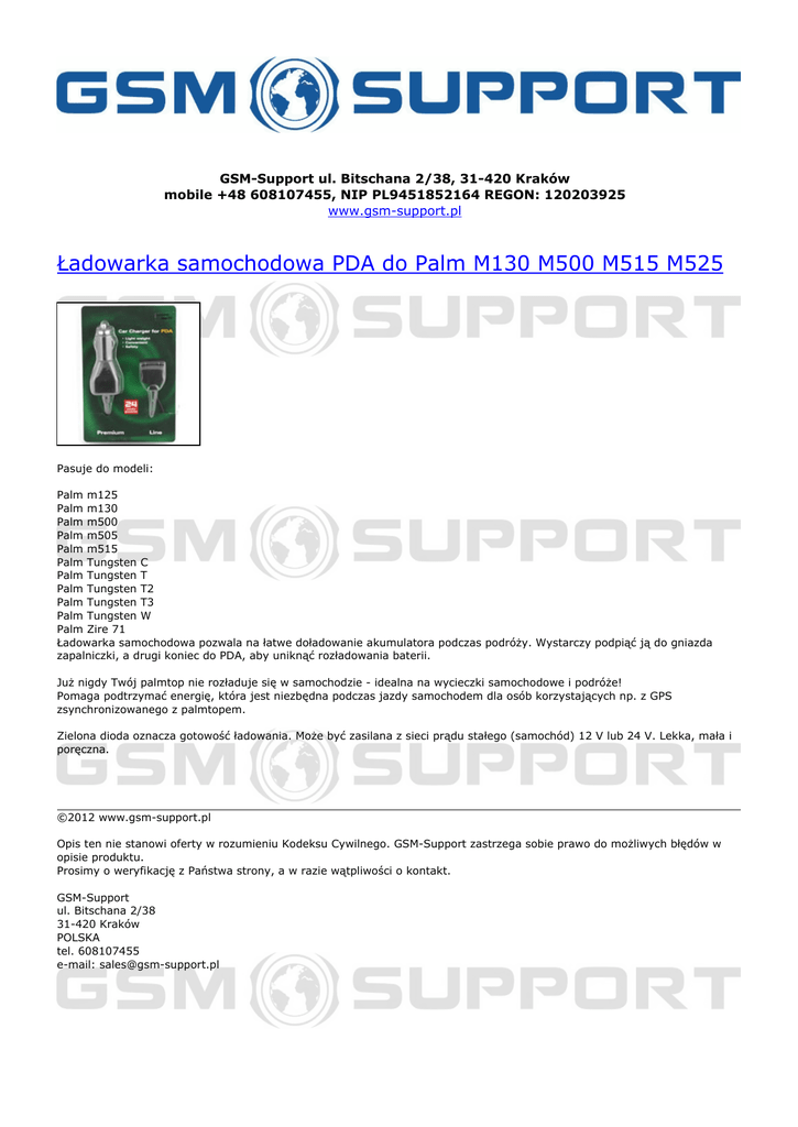 GSM-Support ul. Bitschana 2/38, 31-420 Kraków mobile +48 608107455, NIP PL9451852164 REGON: 120203925 www.gsm-support.pl Ładowarka samochodowa PDA do Palm M130 M500 M515 M525 Pasuje do modeli: Palm m125 Palm m130 Palm m500 Palm m505 Palm m515 Palm Tungsten C Palm Tungsten T Palm Tungsten T2 Palm Tungsten T3 Palm Tungsten W Palm Zire 71 Ładowarka samochodowa pozwala na łatwe doładowanie akumulatora podczas podróży. Wystarczy podpiąć ją do gniazda zapalniczki, a drugi koniec do PDA, aby uniknąć rozładowania baterii. Już nigdy Twój palmtop nie rozładuje się w samochodzie - idealna na wycieczki samochodowe i podróże! Pomaga podtrzymać energię, która jest niezbędna podczas jazdy samochodem dla osób korzystających np. z GPS zsynchronizowanego z palmtopem. Zielona dioda oznacza gotowość ładowania. Może być zasilana z sieci prądu stałego (samochód) 12 V lub 24 V. Lekka, mała i poręczna. ©2012 www.gsm-support.pl Opis ten nie stanowi oferty w rozumieniu Kodeksu Cywilnego. GSM-Support zastrzega sobie prawo do możliwych błędów w opisie produktu. Prosimy o weryfikację z Państwa strony, a w razie wątpliwości o kontakt. GSM-Support ul. Bitschana 2/38 31-420 Kraków POLSKA tel. 608107455 e-mail: [email protected] Powered by TCPDF (www.tcpdf.org)