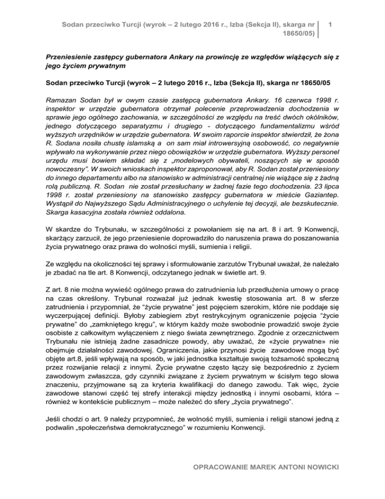 Sodan przeciwko Turcji (wyrok – 2 lutego 2016 r., Izba (Sekcja II), skarga nr 18650/05) 1 Przeniesienie zastępcy gubernatora Ankary na prowincję ze względów wiążących się z jego życiem prywatnym Sodan przeciwko Turcji (wyrok – 2 lutego 2016 r., Izba (Sekcja II), skarga nr 18650/05 Ramazan Sodan był w owym czasie zastępcą gubernatora Ankary. 16 czerwca 1998 r. inspektor w urzędzie gubernatora otrzymał polecenie przeprowadzenia dochodzenia w sprawie jego ogólnego zachowania, w szczególności ze względu na treść dwóch okólników, jednego dotyczącego separatyzmu i drugiego - dotyczącego fundamentalizmu wśród wyższych urzędników w urzędzie gubernatora. W swoim raporcie inspektor stwierdził, że żona R. Sodana nosiła chustę islamską a on sam miał introwersyjną osobowość, co negatywnie wpływało na wykonywanie przez niego obowiązków w urzędzie gubernatora. Wyższy personel urzędu musi bowiem składać się z „modelowych obywateli, noszących się w sposób nowoczesny”. W swoich wnioskach inspektor zaproponował, aby R. Sodan został przeniesiony do innego departamentu albo na stanowisko w administracji centralnej nie wiążące się z żadną rolą publiczną. R. Sodan nie został przesłuchany w żadnej fazie tego dochodzenia. 23 lipca 1998 r. został przeniesiony na stanowisko zastępcy gubernatora w mieście Gaziantep. Wystąpił do Najwyższego Sądu Administracyjnego o uchylenie tej decyzji, ale bezskutecznie. Skarga kasacyjna została również oddalona. W skardze do Trybunału, w szczególności z powołaniem się na art. 8 i art. 9 Konwencji, skarżący zarzucił, że jego przeniesienie doprowadziło do naruszenia prawa do poszanowania życia prywatnego oraz prawa do wolności myśli, sumienia i religii. Ze względu na okoliczności tej sprawy i sformułowanie zarzutów Trybunał uważał, że należało je zbadać na tle art. 8 Konwencji, odczytanego jednak w świetle art. 9. Z art. 8 nie można wywieść ogólnego prawa do zatrudnienia lub przedłużenia umowy o pracę na czas określony. Trybunał rozważał już jednak kwestię stosowania art. 8 w sferze zatrudnienia i przypomniał, że “życie prywatne” jest pojęciem szerokim, które nie poddaje się wyczerpującej definicji. Byłoby zabiegiem zbyt restrykcyjnym ograniczenie pojęcia “życie prywatne” do „zamkniętego kręgu”, w którym każdy może swobodnie prowadzić swoje życie osobiste z całkowitym wyłączeniem z niego świata zewnętrznego. Zgodnie z orzecznictwem Trybunału nie istnieją żadne zasadnicze powody, aby uważać, że «życie prywatne» nie obejmuje działalności zawodowej. Ograniczenia, jakie przynosi życie zawodowe mogą być objęte art.8, jeśli wpływają na sposób, w jaki jednostka kształtuje swoją tożsamość społeczną przez rozwijanie relacji z innymi. Życie prywatne często łączy się bezpośrednio z życiem zawodowym zwłaszcza, gdy czynniki związane z życiem prywatnym w ścisłym tego słowa znaczeniu, przyjmowane są za kryteria kwalifikacji do danego zawodu. Tak więc, życie zawodowe stanowi część tej strefy interakcji między jednostką i innymi osobami, która – również w kontekście publicznym – może należeć do sfery „życia prywatnego”. Jeśli chodzi o art. 9 należy przypomnieć, że wolność myśli, sumienia i religii stanowi jedną z podwalin „społeczeństwa demokratycznego” w rozumieniu Konwencji. OPRACOWANIE MAREK ANTONI NOWICKI 2 Sodan przeciwko Turcji (wyrok – 2 lutego 2016 r., Izba (Sekcja II), skarga nr 18650/05) Wolność religijna odnosi się przede wszystkim do sfery wewnętrznej, jednak wymaga ponadto, w szczególności wolności «manifestowania swojej religii», która na podstawie art.9 nie jest realizowana wyłącznie w sposób zbiorowy, «publicznie» i w kręgu osób, z którymi dzieli sie tę samą wiarę: może również przejawiać się «indywidualnie» i «prywatnie»; obejmuje także zasadniczo prawo do zabiegania o przekonanie innych np. w drodze «nauczania», bez czego reszta «wolności zmiany religii lub przekonania», której dotyczy art. 9, byłaby zagrożona ryzykiem pozostania martwą literą. Charakter fundamentalny praw, jakie gwarantuje art. 9 ust. 1 Konwencji jest również widoczny w sposobie sformułowania klauzuli odnoszącej się do ich ograniczeń. W odróżnieniu od ustępu drugiego art. 8, 10 i 11, odpowiedni ustęp art. 9 z praw wymienionych w jego ustępie pierwszym wskazuje wyłącznie «wolność uzewnętrzniania swojej religii lub przekonań». Stwierdza w ten sposób, że w społeczeństwie demokratycznym, w którym wśród ludności współistnieją rozmaite religie, konieczne może okazać się wprowadzenie ograniczeń tej wolności, aby móc w ten sposób pogodzić interesy rozmaitych grup i zapewnić poszanowanie przekonań każdej z nich. Równocześnie podkreślił kluczowe znaczenie prawa do wolności myśli, sumienia i religii oraz faktu, że państwo nie może dyktować jednostce, w co powinna wierzyć ani podejmować działań mających doprowadzić do przymusowej zmiany jej przekonań. Art. 9 wymienia rozmaite formy, jakie może przyjmować uzewnętrznianie religii lub przekonań, a więc kult, nauczanie, praktykowanie i czynności rytualne, nie chroni jednak każdego aktu motywowanego lub inspirowanego przez religię lub przekonanie. Nie gwarantuje w każdym przypadku prawa do zachowania się w sposób dyktowany przekonaniami religijnymi i nie przyznaje jednostkom działającym w taki sposób prawa do odmowy stosowania się do reguł uznawanych za usprawiedliwione. Trybunał uznał już wcześniej, że można nałożyć na osoby pełniące funkcje publiczne - ze względu na ich status - obowiązek powściągliwości (jeśli chodzi o art. 10 Konwencji) lub dyskrecji w publicznym wyrażaniu swoich przekonań religijnych (w przypadku art. 9). Zasady te mają zastosowanie również do art. 8 Konwencji. Obowiązki etyczne wysokiego fu