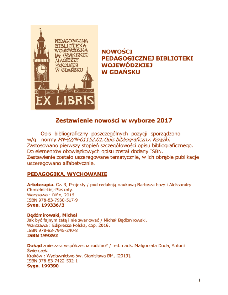NOWOŚCI PEDAGOGICZNEJ BIBLIOTEKI WOJEWÓDZKIEJ W GDAŃSKU Zestawienie nowości w wyborze 2017 Opis bibliograficzny poszczególnych pozycji sporządzono w/g normy PN-82/N-01152.01:Opis bibliograficzny. Książki. Zastosowano pierwszy stopień szczegółowości opisu bibliograficznego. Do elementów obowiązkowych opisu został dodany ISBN. Zestawienie zostało uszeregowane tematycznie, w ich obrębie publikacje uszeregowano alfabetycznie. PEDAGOGIKA, WYCHOWANIE Arteterapia. Cz. 3, Projekty / pod redakcją naukową Bartosza Łozy i Aleksandry Chmielnickiej-Plaskoty. Warszawa : Difin, 2016. ISBN 978-83-7930-517-9 Sygn. 199336/3 Będźmirowski, Michał Jak być fajnym tatą i nie zwariować / Michał Będźmirowski. Warszawa : Edipresse Polska, cop. 2016. ISBN 978-83-7945-240-8 ISBN 199392 Dokąd zmierzasz współczesna rodzino? / red. nauk. Małgorzata Duda, Antoni Świerczek. Kraków : Wydawnictwo św. Stanisława BM, [2013]. ISBN 978-83-7422-502-1 Sygn. 199390 1 Dydaktyka specjalna w przygotowaniu do kształcenia uczniów ze specjalnymi potrzebami edukacyjnymi : podręcznik akademicki / pod red. Joanny Głodkowskiej. Warszawa : Wydawnictwo Akademii Pedagogiki Specjalnej, 2012. ISBN 978-83-62828-07-4 Sygn. 199391 Furmanik-Celejewska, Adrianna Muzolandia przedszkolaka : scenariusze zajęć dla nauczycieli rytmiki i wychowania przedszkolnego / Adrianna Furmanik-Celejewska. Warszawa : Difin, 2016. ISBN 978-83-8085-167-2 Sgn. 199456 Janiak, Alicja Wychowanie dziecka w pedagogii Janusza Korczaka / Alicja Janiak. Lublin : Towarzystwo Naukowe Katolickiego Uniwersytetu Lubelskiego Jana Pawła II, cop. 2015. ISBN 978-83-7306-707-3 Sygn. 199191 Logopedia : wybrane aspekty historii, teorii i praktyki / red. nauk. Stanisław Milewski, Katarzyna Kaczorowska-Bray. Gdańsk : Harmonia Universalis, 2012. ISBN 978-83-7744-017-9 Sygn. 199445 Majewska, Kamila Tablica interaktywna w procesie nauczania wczesnoszkolnego / Kamila Majewska. Toruń : Wydawnictwo Naukowe Uniwersytetu Mikołaja Kopernika, 2015. ISBN 978-83-231-3541-8 Sygn. 199200 Minahan, Jessica Kod zachowania : przewodnik : strategie, narzędzia i interwencje wspierające uczniów przejawiających zachowania lękowe lub opozycyjne / Jessica Minahan. Warszawa : Fraszka Edukacyjna, 2016. ISBN 978-83-63766-13-9 Sygn. 199320 Mróz, Tadeusz Empiryczne prace dyplomowe na studiach pedagogicznych / Tadeusz Mróz, Małgorzata Siwińska. Głogów : Państwowa Wyższa Szkoła Zawodowa, 2014. ISBN 978-83-63349-04-2 Sygn. 199195 2 Nowakowska-Siuta, Renata Racjonalność procesu kształcenia. T. 1, Studium z polityki oświatowej i pedagogiki porównawczej / Renata Nowakowska-Siuta, Bogusław Śliwerski. Kraków : Oficyna Wydawnicza "Impuls", 2015. ISBN 978-83-7850-934-9 Sygn. 199371/1 Milerski, Bogusław Racjonalność procesu kształcenia. T. 2, Teoria i badanie / Bogusław Milerski, Maciej Karwowski. Kraków : Oficyna Wydawnicza "Impuls", 2016. ISBN 978-83-7850-934-9 Sygn. 199371/2 Pedagogika kultury popularnej : teorie, metody i obszary badań / pod redakcją naukową Witolda Jakubowskiego. Kraków : Oficyna Wydawnicza "Impuls", 2016. ISBN 978-83-8095-102-0 Sygn. 199366 Plichta, Piotr Wypalenie zawodowe i poczucie sensu życia pedagogów specjalnych / Piotr Plichta. Wrocław : Oficyna Wydawnicza Atut - Wrocławskie Wydawnictwo Oświatowe, 2015. ISBN 978-83-7977-114-1 Sygn. 199385 Pomoc psychologiczna chorym somatycznie : wybrane zagadnienia / redakcja naukowa Lidia Zabłocka-Żytka, Ewa Sokołowska. Warszawa : Difin, 2016. ISBN 978-83-8085-299-0 Sygn. 199472 Praca przedszkola : wybrane zagadnienia teoretyczne, praktyczne i organizacyjne / redakcja naukowa Zbigniew Ostrach. Kraków : Oficyna Wydawnicza "Impuls", 2016. ISBN 978-83-8095-045-0 Sygn. 199541 Schulz, Roman Szkice z pedagogiki ogólnej / Roman Schulz. Toruń : Wydawnictwo Adam Marszałek, 2016. ISBN 978-83-8019-400-7 Sygn. 199188 Socha, Mirosława Wspieranie dzieci w uczeniu się pozytywnych zachowań : interwencyjny, inkluzyjny program zabawowo-edukacyjny / Mirosława Socha, Mária Podhájecká, Nowy Sącz : Wydawnictwo Naukowe Państwowej Wyższej Szkoły Zawodowej, 2015. ISBN 978-83-63196-82-0 Sygn. 199990 3 Stecyk, Adam Doskonalenie jakości usług edukacyjnych w szkolnictwie wyższym : podejście metodyczne / Adam Stecyk Szczecin : Wydawnictwo Naukowe Uniwersytetu Szczecińskiego, 2016. ISBN 978-83-7972-057-6 Sygn. 199193 Szumiec, Magdalena System awansu zawodowego nauczycieli : ocena kluczowego elementu reformy edukacji / Magdalena Szumiec. Kraków : Oficyna Wydawnicza "Impuls", 2016. ISBN 978-83-8095-172-3 Sygn. 199382 Szurek, Michał Podróże matematyczne / Michał Szurek. Warszawa : Oficyna Edukacyjna Krzysztof Pazdro, 2016. ISBN 978-83-7594-138-8 Sygn. 199367 Szymanik, Anna Dziecko jako projekt rodzicielski? : przekonania matek na temat wychowania i ich perepcja zachowań dziecka / Anna Szymanik-Kostrzewska. Warszawa : Difin, 2016. ISBN 978-83-8085-278-5 Sygn. 199352 Wilde, Kate C. Logistyka autyzmu : przewodnik dla rodziców, którzy zmagają się z kładzeniem dziecka spać, treningiem toaletowym, napadami złości, biciem i innymi wyzwaniami życia codziennego / Kate Wilde. Gdańsk : Harmonia Universalis, cop. 2016. ISBN 978-83-7744-104-6 Sygn. 199197 PSYCHOLOGIA, PSYCHOTERAPIA Antologia studiów nad traumą / pod redakcją Tomasz Łysaka. Kraków : Towarzystwo Autorów i Wydawców Prac Naukowych Universitas, cop. 2015. ISBN 978-83-242-2677-1 Sygn. 199175 Arnwine, Bonnie Rozpoczynanie terapii integracji sensorycznej / Bonnie Arnwine. Gdańsk : Harmonia Universalis, 2016. ISBN 978-83-7744-115-2 Sygn. 199375 4 Attwood, Tony Zespół Aspergera : kompletny przewodnik / Tony Attwood. Gdańsk : Harmonia Universalis, 2015. ISBN 978-83-7744-030-8 Sygn. 199388 Czarnocka, Marzenna Pomoc psychologiczno-pedagogiczna w przedszkolu i szkole : zasady organizacji, przykłady praktycznych rozwiązań, pytania i odpowiedzi, narzędzia / Marzena Czarnocka. Warszawa : Wydawnictwo Wiedza i Praktyka, 2016. 