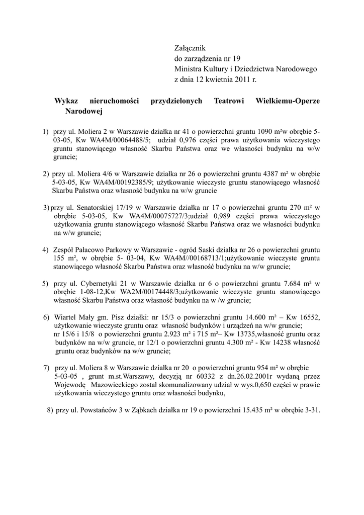 Załącznik do zarządzenia nr 19 Ministra Kultury i Dziedzictwa Narodowego z dnia 12 kwietnia 2011 r. Wykaz nieruchomości Narodowej przydzielonych Teatrowi Wielkiemu-Operze 1) przy ul. Moliera 2 w Warszawie działka nr 41 o powierzchni gruntu 1090 m²w obrębie 503-05, Kw WA4M/00064488/5; udział 0,976 części prawa uŜytkowania wieczystego gruntu stanowiącego własność Skarbu Państwa oraz we własności budynku na w/w gruncie; 2) przy ul. Moliera 4/6 w Warszawie działka nr 26 o powierzchni gruntu 4387 m² w obrębie 5-03-05, Kw WA4M/00192385/9; uŜytkowanie wieczyste gruntu stanowiącego własność Skarbu Państwa oraz własność budynku na w/w gruncie 3) przy ul. Senatorskiej 17/19 w Warszawie działka nr 17 o powierzchni gruntu 270 m² w obrębie 5-03-05, Kw WA4M/00075727/3;udział 0,989 części prawa wieczystego uŜytkowania gruntu stanowiącego własność Skarbu Państwa oraz we własności budynku na w/w gruncie; 4) Zespół Pałacowo Parkowy w Warszawie - ogród Saski działka nr 26 o powierzchni gruntu 155 m², w obrębie 5- 03-04, Kw WA4M//00168713/1;uŜytkowanie wieczyste gruntu stanowiącego własność Skarbu Państwa oraz własność budynku na w/w gruncie; 5) przy ul. Cybernetyki 21 w Warszawie działka nr 6 o powierzchni gruntu 7.684 m² w obrębie 1-08-12,Kw WA2M/00174448/3;uŜytkowanie wieczyste gruntu stanowiącego własność Skarbu Państwa oraz własność budynku na w /w gruncie; 6) Wiartel Mały gm. Pisz działki: nr 15/3 o powierzchni gruntu 14.600 m² – Kw 16552, uŜytkowanie wieczyste gruntu oraz własność budynków i urządzeń na w/w gruncie; nr 15/6 i 15/8 o powierzchni gruntu 2.923 m² i 715 m²– Kw 13735,własność gruntu oraz budynków na w/w gruncie, nr 12/1 o powierzchni gruntu 4.300 m² - Kw 14238 własność gruntu oraz budynków na w/w gruncie; 7) przy ul. Moliera 8 w Warszawie działka nr 20 o powierzchni gruntu 954 m² w obrębie 5-03-05 , grunt m.st.Warszawy, decyzją nr 60332 z dn.26.02.2001r wydaną przez Wojewodę Mazowieckiego został skomunalizowany udział w wys.0,650 części w prawie uŜytkowania wieczystego gruntu oraz własności budynku, 8) przy ul. Powstańców 3 w Ząbkach działka nr 19 o powierzchni 15.435 m² w obrębie 3-31.