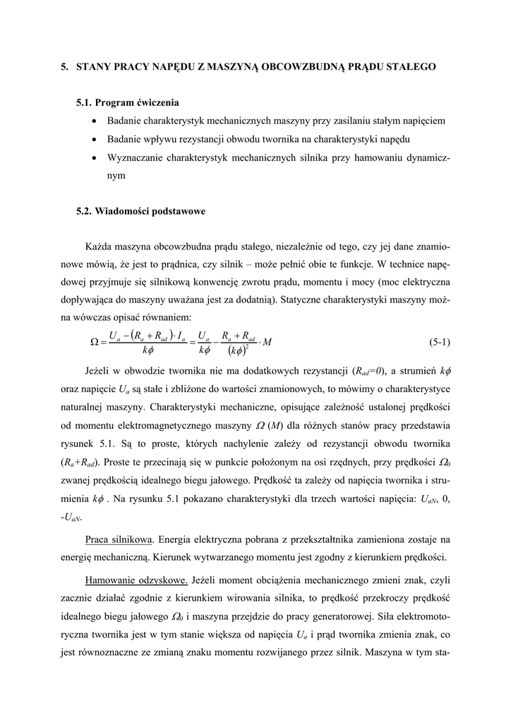 5. STANY PRACY NAPĘDU Z MASZYNĄ OBCOWZBUDNĄ PRĄDU STAŁEGO 5.1. Program ćwiczenia • Badanie charakterystyk mechanicznych maszyny przy zasilaniu stałym napięciem • Badanie wpływu rezystancji obwodu twornika na charakterystyki napędu • Wyznaczanie charakterystyk mechanicznych silnika przy hamowaniu dynamicznym 5.2. Wiadomości podstawowe Każda maszyna obcowzbudna prądu stałego, niezależnie od tego, czy jej dane znamionowe mówią, że jest to prądnica, czy silnik – może pełnić obie te funkcje. W technice napędowej przyjmuje się silnikową konwencję zwrotu prądu, momentu i mocy (moc elektryczna dopływająca do maszyny uważana jest za dodatnią). Statyczne charakterystyki maszyny można wówczas opisać równaniem: Ω= U a − (Ra + Rad ) ⋅ I a U a Ra + Rad = − ⋅M kφ kφ (kφ )2 (5-1) Jeżeli w obwodzie twornika nie ma dodatkowych rezystancji (Rad=0), a strumień kφ oraz napięcie Ua są stałe i zbliżone do wartości znamionowych, to mówimy o charakterystyce naturalnej maszyny. Charakterystyki mechaniczne, opisujące zależność ustalonej prędkości od momentu elektromagnetycznego maszyny Ω (M) dla różnych stanów pracy przedstawia rysunek 5.1. Są to proste, których nachylenie zależy od rezystancji obwodu twornika (Ra+Rad). Proste te przecinają się w punkcie położonym na osi rzędnych, przy prędkości Ω0 zwanej prędkością idealnego biegu jałowego. Prędkość ta zależy od napięcia twornika i strumienia kφ . Na rysunku 5.1 pokazano charakterystyki dla trzech wartości napięcia: UaN, 0, -UaN. Praca silnikowa. Energia elektryczna pobrana z przekształtnika zamieniona zostaje na energię mechaniczną. Kierunek wytwarzanego momentu jest zgodny z kierunkiem prędkości. Hamowanie odzyskowe. Jeżeli moment obciążenia mechanicznego zmieni znak, czyli zacznie działać zgodnie z kierunkiem wirowania silnika, to prędkość przekroczy prędkość idealnego biegu jałowego Ω0 i maszyna przejdzie do pracy generatorowej. Siła elektromotoryczna twornika jest w tym stanie większa od napięcia Ua i prąd twornika zmienia znak, co jest równoznaczne ze zmianą znaku momentu rozwijanego przez silnik. Maszyna w tym sta- nie pracy oddaje moc do źródła zasilania i wytwarza moment hamujący, przy prędkości |Ω | > |Ω0|. Hamowanie przeciwwłączeniem. Jest to rodzaj pracy, w czasie której prędkość ma znak przeciwny niż prędkość biegu jałowego Ω0. Moc dopływa do silnika tak od strony elektrycznej, jak i mechanicznej i jest tra- > cona w obwodzie twornika, w którym musi się znajdować rezy- 1a stancja dodatkowa Rad o znacznej wartości. Hamowanie prze- 5 4 1 ciwwłączeniem, jako stan nie- 1 Me 3 4 ustalony, było wykorzystywane do szybkiego zatrzymania napędu nie wyposażonego w regulo- 3a wane źródło napięcia. Polegało to na zmianie biegunowości napięcia z równoczesnym włączeniem dodatkowej rezystancji w obwód Rys.5.1 Charakterystyki mechaniczne maszyny prądu stałego: 1-praca silnikowa, 2-hamowanie odzyskowe, 3-hamowanie przeciwwłączeniem, 4-hamowanie dynamiczne obcowzbudne, 5-hamowanie dynamiczne samowzbudne, a-wpływ reakcji twornika twornika. Aby nie dopuścić do nawrotu silnika, należało odłączyć źródło napięcia i ewentual- nie zewrzeć obwód twornika (hamowanie dynamiczne) w chwili, gdy prędkość zbliżała się do zera. Ustalony stan hamowania przeciwwłączeniem może mieć miejsce przy czynnym momencie obciążenia, np. gdy jest on wytwarzany przez ciężar ładunku transportowanego pionowo. Stopniowe zwiększanie rezystancji w obwodzie twornika powoduje wówczas zmniejszanie prędkości, a w końcu zmianę jej znaku, czyli przejście od pracy silnikowej (podnoszenie ładunku) do hamowania przeciwwłączeniem (opuszczanie ładunku). Ten rodzaj hamowania przeciwwłączeniem nie wymaga przełączenia biegunowości napięcia zasilającego twornik. Hamowanie dynamiczne obcowzbudne. W stanie hamowania dynamicznego maszyna pracuje jako prądnica, bez zewnętrznego źródła napięcia w obwodzie twornika (Ua =0). Cała energia mechaniczna przekazywana na wał silnika jest tracona na rezystancjach obwodu twornika. Obwód wzbudzenia zasilany jest normalnie i strumień kφ ma stałą wartość. Prąd twornika i moment są proporcjonalne do prędkości kątowej. Hamowanie dynamiczne samowzbudne. Hamowanie to może być stosowane jako awaryjne, w przypadku braku napięcia zasilania obwodu wzbudzenia. W czasie tego hamowania maszyna pracuje jako prądnica samowzbudna obciążona rezystancją Rad. Samowzbudzanie się maszyny jest możliwe dzięki zjawisku histerezy, które powoduje, że przy braku prądu wzbudzenia if pozostaje w obwodzie pewien niewielki strumień magnetyczny, indukujący w wirującym tworniku niewielkie napięcie, tak zwane napięcie szczątkowe. Po doprowadzeniu napięcia twornika do uzwojenia wzbudzenia zaczyna płynąć w nim prąd wzbudzenia, zwiększający strumień, a zatem i napięcie ea indukowane w tworniku, to z kolei zwiększa prąd wzbudzenia itd. Ten mechanizm dodatniego sprzężenia zwrotnego może doprowadzić do saEa,IfR’f mowzbudzenia się maszyny, pozwalającego IfRf If(Rf+Rd2) uzyskać napięcia rzędu znamionowego. 3 2 Aby tak się stało muszą być spełnione Ea(If,> N) pewne warunki wirowania 6 1 7 Ea(If,0.5> N) dotyczące maszyny i prędkości rezystancji w obwodzie wzbudzenia. Na rys.5.2 pokazano przykładowe wykresy zależności sem Ea If 4,5 indukowanej w wirniku w funkcji prądu wzbudzenia (pętle histerezy) dla trzech 8 Ea(If,-0.5> N) -IfRf wartości prędkości wirnika. Na ich tle wykreślono charakterystyki napięciowoprądowe obwodu wzbudzenia dla trzech Rys.5.2. Warunki samowzbudzania się maszyny (1-8: punkty równowagi, opisane w tekście) wartości rezystancji tego obwodu. Jeżeli rezystancja jest zbyt duża lub/i prędkość zbyt mała, to samowzbudzenie nie udaje się; stan równowagi ustala się w punktach (1,4,5) położonych na początkowym odc