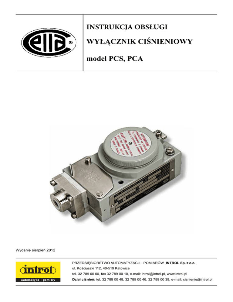 INSTRUKCJA OBSŁUGI WYŁĄCZNIK CIŚNIENIOWY model PCS, PCA Wydanie sierpień 2012 PRZEDSIĘBIORSTWO AUTOMATYZACJI I POMIARÓW INTROL Sp. z o.o. ul. Kościuszki 112, 40-519 Katowice tel. 32 789 00 00, fax 32 789 00 10, e-mail: [email protected], www.introl.pl Dział ciśnień: tel. 32 789 00 48, 32 789 00 46, 32 789 00 39, e-mail: [email protected] INTROL Sp. z o.o., ul. Kościuszki 112, 40-519 Katowice, tel.: 32 789 00 40, faks: 32 789 00 10, e-mail: [email protected], www.introl.pl SPIS TREŚCI 1. Informacje ogólne .........................................................................................................3 1.1 Wprowadzenie ............................................................................................................3 1.2 Dopuszczalne ograniczenia ciśnienia .........................................................................3 1.3 Temperatura ................................................................................................................3 2. Zasada działania ...........................................................................................................3 3. Regulacja wartości zadanej..........................................................................................3 4. Kalibracja wartości zadanej ........................................................................................5 4.1 Przygotowanie ............................................................................................................5 4.2 Obwód kalibrujący i operacje .....................................................................................6 4.3 Kalibracja z użyciem skali regulacji ..........................................................................7 4.4 Końcowe operacje ......................................................................................................7 5. Plombowanie przyrządu...............................................................................................7 6. Montaż i połączenia ......................................................................................................8 6.1 Montaż ........................................................................................................................8 6.2 Połączenia ciśnieniowe ...............................................................................................8 6.3 Połączenia elektryczne ...............................................................................................9 7. Uruchomienie ................................................................................................................9 8. Weryfikacja funkcjonalności .......................................................................................9 9. Diagnostyka .................................................................................................................10 10. Zatrzymanie i wymontowanie..................................................................................11 11. Złomowanie................................................................................................................12 2 INTROL Sp. z o.o., ul. Kościuszki 112, 40-519 Katowice, tel.: 32 789 00 40, faks: 32 789 00 10, e-mail: [email protected], www.introl.pl 1. Informacje ogólne 1.1 Wprowadzenie Błędny wybór serii lub modelu, jak również nieprawidłowa instalacja, doprowadzi do wadliwego działania lub skróci żywotność przyrządu. Nie przestrzeganie poniższych wskazówek, spowoduje uszkodzenie przyrządu, szkody środowiskowe i szkody cielesne. 1.2 Dopuszczalne ograniczenia ciśnienia Ciśnienie przekraczające zakres roboczy może być czasami tolerowane, pod warunkiem, że pozostanie wewnątrz limitów ustalonych w specyfikacjach przyrządu (ciśnienie próbne). Do wyłącznika ciśnieniowego można doprowadzić stałe ciśnienie przekraczające zakres pracy tylko wtedy, gdy jest to wyraźnie podane we własnościach instrumentu. Nie wolno przekraczać wartości prądu i napięcia i wartości znamionowych podanych w danych technicznych. Przejściowe przekroczenia wartości mogą spowodować uszkodzenie presostatu. 1.3 Temperatura Temperatura przyrządu może przekroczyć dopuszczalne limity (zwykle od –20° do +70°C) pod wpływem temperatury zarówno środowiska, jak i płynu procesowego. W takich przypadkach należy stosować środki zapobiegawcze skierowane na ograniczenie tej wartości. (ochrona przed promieniowaniem termicznym, separatory płynowe, wężownice chłodzące, szafy grzejne). 2. Zasada działania Mocno szczelna membrana (lub tłok z pierścieniem samouszczelniającym typu O) wywiera siłę na sztywny krążek. Siła jest wprost proporcjonalna do wartości ciśnienia a przeciwstawia się jej sprężyna śrubowa chroniona odpowiednią tuleją. Kiedy zostanie przekroczony punkt równowagi sił, krążek podnosi się i przy pomocy sztywnego drążka - uruchamia jeden lub dwa równocześnie wyzwalane elektryczne mikroprzełączniki. Mikroprzełączniki są typu migowego z automatycznym nastawianiem. Kiedy ciśnienie będzie odchodziło od wartości nastawionych powracając do wartości normalnych, przełącznik automatycznie zostanie resetowany. 3. Regulacja wartości zadanej 3.1 Naprężenie sprężyny śrubowej można regulować za pomocą tulei (dla nastawiania) w taki sposób, żeby przełącznik był wyzwalany wtedy, kiedy ciśnienie osiągnie (wzrastając lub zmniejszają się) wartości pożądane (wartość zadana). 3 INTROL Sp. z o.o., ul. Kościuszki 112, 40-519 Katowice, tel.: 32 789 00 40, faks: 32 789 00 10, e-mail: [email protected], www.introl.pl 3.2 Przyrząd zazwyczaj ma ustawione przełączniki na wartość z nastawionego zakresu, bliską zeru (kalibracja fabryczna). 3.3 Presostat posiada tabliczkę przylepną z wartością kalibracyjną sygnału zadającego. Z kalibracją fabryczną, wartości te nie są ujęte na tabliczce, gdyż są tym czasowe i będą modyfikowane sprecyzowanym