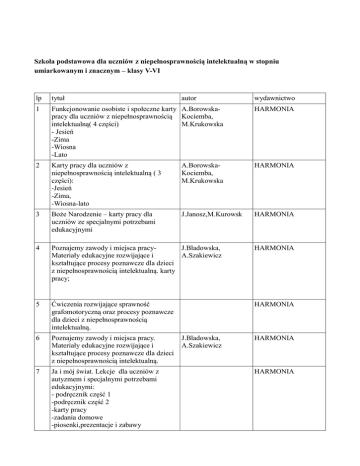 Szkoła podstawowa dla uczniów z niepełnosprawnością intelektualną w stopniu umiarkowanym i znacznym – klasy V-VI lp tytuł 1 Funkcjonowanie osobiste i społeczne karty A.Borowskapracy dla uczniów z niepełnosprawnością Kociemba, intelektualną( 4 części) M.Krukowska - Jesień -Zima -Wiosna -Lato HARMONIA 2 Karty pracy dla uczniów z niepełnosprawnością intelektualną ( 3 części): -Jesień -Zima, -Wiosna-lato A.BorowskaKociemba, M.Krukowska HARMONIA 3 Boże Narodzenie – karty pracy dla uczniów ze specjalnymi potrzebami edukacyjnymi J.Janosz,M.Kurowsk HARMONIA 4 Poznajemy zawody i miejsca pracyJ.Bladowska, Materiały edukacyjne rozwijające i A.Szakiewicz kształtujące procesy poznawcze dla dzieci z niepełnosprawnością intelektualną. karty pracy; HARMONIA 5 Ćwiczenia rozwijające sprawność grafomotoryczną oraz procesy poznawcze dla dzieci z niepełnosprawnością intelektualną. HARMONIA 6 Poznajemy zawody i miejsca pracy. Materiały edukacyjne rozwijające i kształtujące procesy poznawcze dla dzieci z niepełnosprawnością intelektualną. 7 Ja i mój świat. Lekcje dla uczniów z autyzmem i specjalnymi potrzebami edukacyjnymi: - podręcznik część 1 -podręcznik część 2 -karty pracy -zadania domowe -piosenki,prezentacje i zabawy autor J.Bladowska, A.Szakiewicz wydawnictwo HARMONIA HARMONIA 8 ABC mówienia, czytania i pisania. Umiem J.Łomża,I.Knapik mówić , czytać i pisać – zeszyt do rewalidacji dla dzieci z wadą słuchu oraz problemami w nauce mówienia, czytania i pisania: - część 1 -część 2 HARMONIA 9 Muzyka otwiera nam świat- program muzycznych zajęć edukacyjnych dla uczniów z upośledzeniem w stopniu umiarkowanym i znacznym oraz dzieci z autyzmem. HARMONIA 10 Pewny start. Świat wokół mnie. Pakiet materiałów ćwiczeniowych Ja i mój dom, Ja poza domem, Ja w bezpiecznym świecie. WSzPWN 11 Pewny start. Karty z emocjami. WSzPWN 12 Pewny start. Historyjki obrazkowe. WSzPWN 13 Pewny start. Ola,Adam i ich świat. Czytanki rozwijające kompetencje społeczne. WSzPWN 14 Pewny start. Świat wokół mnie. Wersja rozszerzona. Ćwiczenia interaktywne. WSzPWN 15 Pewny start. Cztery pory roku .Pakiet materiałów ćwiczeniowych Jesień, Zima,wiosna-lato WSzPWN 16 Pewny start. Cztery pory roku. Umiem to zrobić. Karty z ćwiczeniami manualnymi. WSzPWN 17 Trampolina do szkoły. Zabawy edukacyjne. WSzPWN 18 Czarodziejskie obrazki. Część 1 WSzPWN 19 Czarodziejskie obrazki. Część 2 WSzPWN 20 Czarodziejskie obrazki. Część 3 WSzPWN 21 Umiem więcej. Zanim pójdziesz do szkoły. WSzPWN 22 Karty z literami i Karty matematyczne. WSzPWN 23 Pewny start . Karty do nauki czytania. WSzPWN 24 Pewny stary. Karty matematyczne. WSzPWN 25 Pewny start. Karty z emocjami. WSzPWN 26 Pewny start. Historyjki obrazkowe. WSzPWN 27 Pewny start. Cztery pory roku. Wersja WSzPWN rozszerzona.