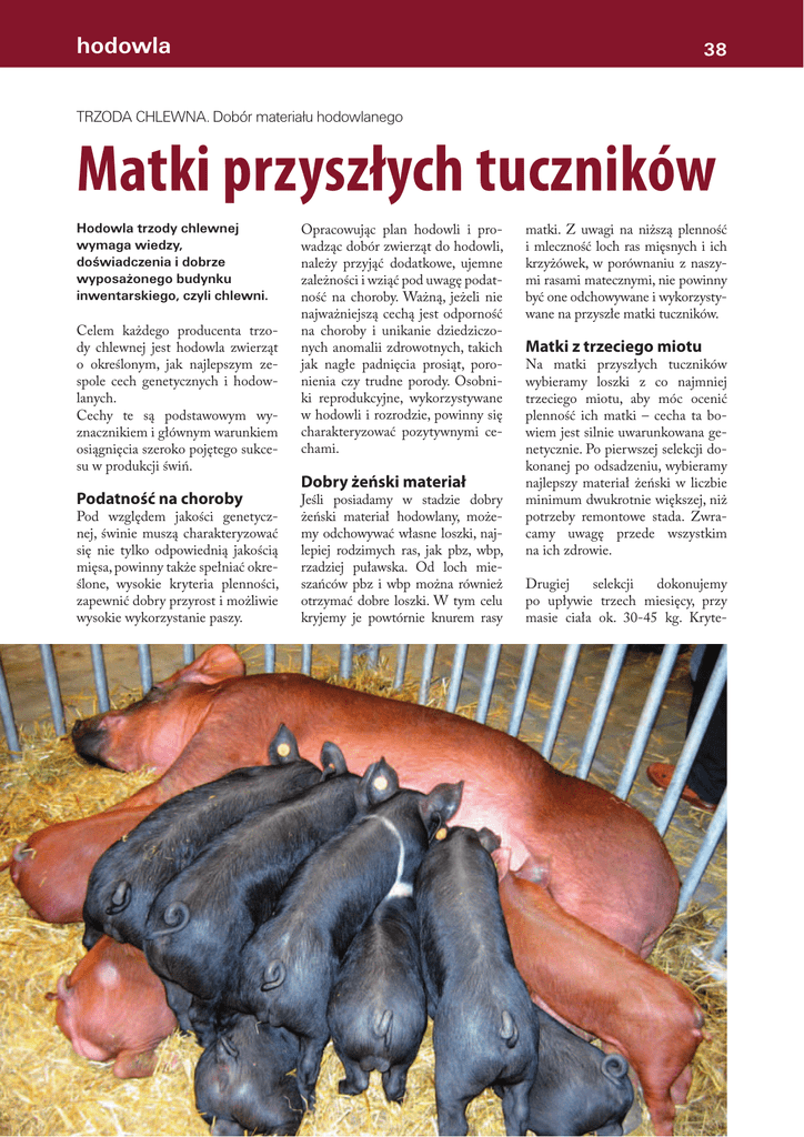 hodowla 38 TRZODA CHLEWNA. Dobór materiału hodowlanego Matki przyszłych tuczników Hodowla trzody chlewnej wymaga wiedzy, doświadczenia i dobrze wyposażonego budynku inwentarskiego, czyli chlewni. Celem każdego producenta trzody chlewnej jest hodowla zwierząt o określonym, jak najlepszym zespole cech genetycznych i hodowlanych. Cechy te są podstawowym wyznacznikiem i głównym warunkiem osiągnięcia szeroko pojętego sukcesu w produkcji świń. Opracowując plan hodowli i prowadząc dobór zwierząt do hodowli, należy przyjąć dodatkowe, ujemne zależności i wziąć pod uwagę podatność na choroby. Ważną, jeżeli nie najważniejszą cechą jest odporność na choroby i unikanie dziedziczonych anomalii zdrowotnych, takich jak nagłe padnięcia prosiąt, poronienia czy trudne porody. Osobniki reprodukcyjne, wykorzystywane w hodowli i rozrodzie, powinny się charakteryzować pozytywnymi cechami. Dobry żeński materiał Podatność na choroby Pod względem jakości genetycznej, świnie muszą charakteryzować się nie tylko odpowiednią jakością mięsa, powinny także spełniać określone, wysokie kryteria plenności, zapewnić dobry przyrost i możliwie wysokie wykorzystanie paszy. Jeśli posiadamy w stadzie dobry żeński materiał hodowlany, możemy odchowywać własne loszki, najlepiej rodzimych ras, jak pbz, wbp, rzadziej puławska. Od loch mieszańców pbz i wbp można również otrzymać dobre loszki. W tym celu kryjemy je powtórnie knurem rasy matki. Z uwagi na niższą plenność i mleczność loch ras mięsnych i ich krzyżówek, w porównaniu z naszymi rasami matecznymi, nie powinny być one odchowywane i wykorzystywane na przyszłe matki tuczników. Matki z trzeciego miotu Na matki przyszłych tuczników wybieramy loszki z co najmniej trzeciego miotu, aby móc ocenić plenność ich matki – cecha ta bowiem jest silnie uwarunkowana genetycznie. Po pierwszej selekcji dokonanej po odsadzeniu, wybieramy najlepszy materiał żeński w liczbie minimum dwukrotnie większej, niż potrzeby remontowe stada. Zwracamy uwagę przede wszystkim na ich zdrowie. Drugiej selekcji dokonujemy po upływie trzech miesięcy, przy masie ciała ok. 30-45 kg. Kryte- hodowla rium wyboru jest wtedy przede wszystkim harmonijna budowa ciała, zdrowie, żywotność i żerność. Wybór loszek mających dobry apetyt daje gwarancję, że w przyszłości będą one również dużo jadły i charakteryzowały się dobrą mlecznością. Ważnym elementem selekcji jest także wymię lochy. W drugiej selekcji bierzemy pod uwagę liczbę sutek (minimum 12, a najlepiej 14). W wieku 5-6 miesięcy określamy, czy sutki są dobrze wykształcone, symetrycznie i równomiernie rozmieszczone, ponownie oceniamy pokrój i zdrowie. Do hodowli nie należy przeznaczać loszek, które w okresie odchowu zapadały na choroby, szczególnie układu oddechowego. 39 Wymagania temperaturowe dla różnych grup trzody chlewnej kojce porodowe SURVLÔWDVVÆFH lochy ZDUFKODNLWXF]niki pomieszczenie, 1 W\G]LHì do 20 oC 7 kg do 25 0C krycie do 20 0C 20 kg do 20 0C 10 kg do 24 0C wczesny okres FLÆē\ do 20 0C 30 kg do 18 0C 15 kg do 22 0C þURGNRZ\RNUHV FLÆē\ do 18 0C 40 kg do 16 0C 20 kg do 20 0C NRìFRZ\RNUHV FLÆē\ do 16 0C 50 kg do 15 0C powierzchnia dla SURVLÆWSLHUZV]H dni do 30 0C 25 kg do 18 0C kracza dopuszczalne normy. Prowadzi to do zaburzeń zdrowotnych i produkcyjnych. Dochodowy budynek Duży wpływ na dochodowość produkcji trzody ma sam budynek, warunki klimatyczne w środku i wyposażenie. Warunki mikroklimatyczne w budynkach dla świń oddziaływają na zwierzęta fizycznie, chemicznie i biologicznie. Zależy od nich stan zdrowia oraz uzyskiwane wyniki produkcyjne. Do fizycznych czynników środowiskowych należą ‒ światło, temperatura, wilgotność, prędkość ruchu powietrza, ochładzanie, ciśnienie atmosferyczne, hałas i często pomijane zapylenie. Szkodliwe stężenie gazów Chemicznymi elementami kształtującymi mikroklimat w chlewni są przede wszystkim szkodliwe gazy zawarte w powietrzu, do których można zaliczyć dwutlenek węgla, amoniak oraz siarkowodór. Do ostatniej grupy, czyli czynników biologicznych zaliczamy drobnoustroje, pleśnie, grzyby oraz pasożyty. Do największych zagrożeń zdrowia zwierząt należy także koncentracja szkodliwych domieszek gazowych, a mianowicie dwutlenku węgla, amoniaku i siarkowodoru. Dwa ostanie mają szczególne znaczenia w przypadku utrzymania świń. W zamkniętych, źle wentylowanych pomieszczeniach, przy nadmiernej koncentracji zwierząt, stężenie domieszek gazowych znacznie prze- Temperatura i wilgotność powietrza Do normalnego przebiegu czynności fizjologicznych, niezależnie od wieku świń, konieczne jest zachowanie optymalnej temperatury i wilgotności powietrza, bez względu na porę roku. Nieodpowiednia temperatura czy wilgotność w chlewni, powoduje zaburzenia w równowadze fizjologicznej organizmu świń, co może być przyczyną słabszych przyrostów, gorszego wykorzystania paszy czy spadku odporności i większej podatności na choroby. Temperatura wewnątrz budynku dla trzody jest wypadkową następujących czynników: y izolacji termicznej ścian, y liczby i wieku zwierząt, y lokalnego ogrzewania (system na głębokiej ściółce) lub ogrzewania całej powierzchni, y ogrzewania bezpośredniego (podczerwień, nadmuch świeżego powietrza), y ogrzewania pośredniego (centralne ogrzewanie), y chłodzenia poprzez rozpylanie wody (praktykowane w gorętszym klimacie lub latem). bem dogrzewania budynku. Żaden z nośników energii nie jest bowiem tak drogi, jak sama pasza. Dlatego w pierwszej kolejności należy skoncentrować się na ociepleniu ścian chlewni. Jeśli posiadamy dobrze izolowaną i wyposażoną chlewnię oraz dobry materiał hodowlany, możemy liczyć na większy zysk w produkcji trzody chlewnej. Warunkiem osiągnięcia zadowalających wyników produkcyjnych jest dobór odpowiedniego systemu utrzymania. Podejm