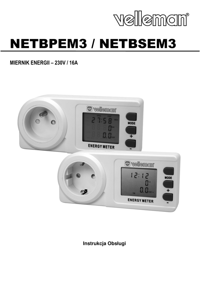 NETBPEM3 / NETBSEM3 MIERNIK ENERGII – 230V / 16A Instrukcja Obsługi NETBPEM / NETBSEM – MIERNIK ENERGII – 230V / 16A 1. Wstęp i cechy urządzenia Przeznaczona dla mieszkańców Unii Europejskiej. Ważne informacje dotyczące środowiska. Ten symbol umieszczony na urządzeniu bądź opakowaniu wskazuje, że wyrzucenie produktu może być szkodliwe dla środowiska. Nie wyrzucaj urządzenia lub baterii do zbiorczego śmietnika, tylko do specjalnie przeznaczonych do tego pojemników na urządzenia elektroniczne lub skontaktuj się z firmą zajmującą się recyklingiem. Urządzenie możesz oddać dystrybutorowi lub firmie zajmującej się recyklingiem. Postępuj zgodnie z zasadami bezpieczeństwa dotyczącymi środowiska. Jeśli masz wątpliwości skontaktuj się z firmą zajmującą się utylizacją odpadów. Dziękujemy za wybór produktu firmy Velleman! Niniejszy miernik energii pozwoli Ci obliczyć koszt prądu zużywanego przez Twoje urządzenia elektryczne. Prosimy o dokładne zapoznanie się z instrukcją obsługi przed użyciem. Jeśli urządzenie zostało uszkodzone podczas transportu prosimy o nie korzystanie z niego i skontaktowanie się ze sprzedawcą. Cechy: • Wyświetla aktualną godzinę, dzień tygodnia, zużycie prądu i koszt energii elektrycznej; • Wyświetla łączny czas zużywania energii, łącznie zużytą energię i skumulowany koszt energii; • Wyświetla łączny czas mierzenia, łączny czas zużywania energii oraz procentowy stosunek tych czasów; • Programowanie dwóch taryf kosztowych. 2. Instrukcje bezpieczeństwa Chroń to urządzenie przed deszczem i wilgocią. • Wszelkie szkody spowodowane użytkowaniem niezgodnym z niniejszą instrukcją nie są objęte gwarancją a sprzedawca nie ponosi odpowiedzialności za te szkody. • Urządzenie jest bezobsługowe. Wewnątrz nie ma części zapasowych, ani części nadających się do wymiany przez użytkownika. • Ten miernik jest zaprojektowany do mierzenia zużycia prądu o wartościach 5W ~ 3680W (maksymalny prąd 16A). Nie podłączaj urządzeń, które mogą przekroczyć ten limit, gdyż może to spowodować przeciążenie miernika a w efekcie poranienie osób znajdujących się w pobliżu. • Podłączaj miernik tylko do sieci o parametrach 230V / 50-60Hz. • Miernik został zaprojektowany wyłącznie do użytku wewnętrznego. Nie używaj go na zewnątrz. • Używaj miernika zgodnie z przeznaczeniem. Użytkowanie niezgodne z przeznaczeniem może spowodować zwarcie, pożar, porażenie prądem itp. Używanie niezgodne z przeznaczeniem powoduje utratę gwarancji. • Gwarancja nie obejmuje uszkodzeń spowodowanych nieuprawnioną ingerencją w urządzenie. • Miernik musi być uziemiony. • Używaj miernika przy temperaturze otoczenia pomiędzy +10°C a +40°C. Wyższe temperatury mogą spowodować przegrzanie miernika i uszkodzenie zarówno miernika jak i podłączonego urządzenia. • Nie używaj miernika w pobliżu łatwopalnych gazów, oparów i pyłów a także w dusznych i mokrych lokalizacjach. • Odłącz miernik od prądu na czas czyszczenia a także w czasie, gdy jest nieużywany. • Zapoznaj się z funkcjami miernika przed pierwszym użyciem. Nie zezwalaj na użytkowanie miernika osobom niewykwalifikowanym. Najczęstszą przyczyną wypadków jest użytkowanie urządzeń niezgodnie z instrukcją. • Gwarancja nie obejmuje uszkodzeń spowodowanych nieuprawnioną ingerencją w urządzenie. • Chroń przed dziećmi oraz użytkownikami nieautoryzowanymi. • Nie wkładaj do miernika żadnych obiektów za wyjątkiem wtyczek elektrycznych. • Nie używaj uszkodzonego, bądź zdeformowanego miernika. 3. Programowanie miernika Przed podłączeniem jakiegokolwiek urządzenia do miernika, podłącz miernik do prądu i nie wyjmuj go przez 12 godzin w celu pełnego naładowania kondensatorów znajdujących się w mierniku. Wyświetlacz LCD włączy się już po 5 minutach. Od tego momentu możesz rozpocząć programowanie swojego miernika. a. Ustawianie czasu i dnia tygodnia 1. Naciśnij i przytrzymaj równocześnie + i – przez ±5 sekund aby rozpocząć programowanie. 2. Wartość migającej pozycji zmieniaj wciskając + lub –. Aby wybrać kolejną pozycję wciśnij MODE. 3. Po ustawieniu godziny i dnia tygodnia, wciśnij MODE aby przejść do ustawiania taryfy kosztowej numer 1. b. Ustawianie taryfy kosztowej numer 1 1. 2. 3. 4. Wartość migającej pozycji zmieniaj tak jak opisano powyżej. Rozpocznij ustalając początek taryfy dziennej. Następnie wprowadź cenę kWh w taryfie dziennej. Wciśnij MODE aby ustawić taryfę kosztową numer 2. c. Ustawianie taryfy kosztowej numer 2 1. 2. 3. 4. Wartość migającej pozycji zmieniaj tak jak opisano powyżej. Rozpocznij ustalając początek taryfy nocnej. Następnie wprowadź cenę kWh w taryfie nocnej. Wciśnij MODE aby zatwierdzić wprowadzone dane. d. Resetowanie danych 1. Wciśnij i przytrzymaj MODE, + i – równocześnie przez ±5 sekund aby wykasować wprowadzone dane (za wyjątkiem godziny i dnia tygodnia). NETBPEM / NETBSEM -3- VELLEMAN 4. Opis ekranu a. Aktualny czas, Dzień tygodnia, Zużycie prądu i Aktualny koszt na godzinę Aktualna godzina Aktualne zużycie prądu Aktualny koszt zużycia prądu na godzinę Dzień tygodnia b. Łączny czas mierzenia, Łączne zużycie prądu i Skumulowany koszt zużytej energii elektrycznej Łączny czas mierzenia Łączne zużycie prądu Skumulowany koszt zużytej energii elektrycznej c. Łączny czas mierzenia, Łączny czas zużywania prądu i Stosunek procentowy Łączny czas mierzenia Czas, w jakim był zużywany prąd Stosunek procentowy w.w. 5. Czyszczenie i utrzymanie • Regularnie sprawdzaj czy miernik nie jest uszkodzony. • Przecieraj miernik regularnie suchą, delikatną szmatką. Nie używaj detergentów ani alkoholu do czyszczenia miernika. Nigdy nie zanurzaj miernika w wodzie. • Jakiekolwiek naprawy mogą być wykonywane wyłącznie przez wykwalifikowanego elektryka.