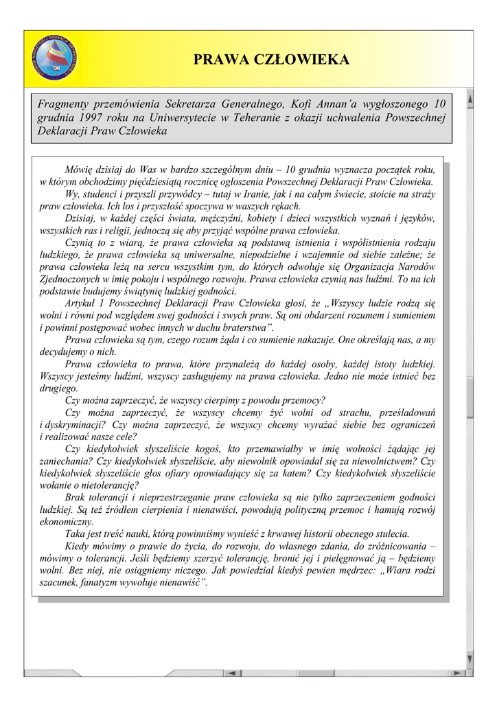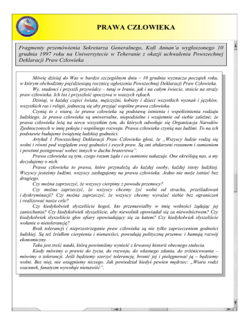 PRAWA CZŁOWIEKA Fragmenty przemówienia Sekretarza Generalnego, Kofi Annan’a wygłoszonego 10 grudnia 1997 roku na Uniwersytecie w Teheranie z okazji uchwalenia Powszechnej Deklaracji Praw Człowieka Mówię dzisiaj do Was w bardzo szczególnym dniu – 10 grudnia wyznacza początek roku, w którym obchodzimy pięćdziesiątą rocznicę ogłoszenia Powszechnej Deklaracji Praw Człowieka. Wy, studenci i przyszli przywódcy – tutaj w Iranie, jak i na całym świecie, stoicie na straży praw człowieka. Ich los i przyszłość spoczywa w waszych rękach. Dzisiaj, w każdej części świata, mężczyźni, kobiety i dzieci wszystkich wyznań i języków, wszystkich ras i religii, jednoczą się aby przyjąć wspólne prawa człowieka. Czynią to z wiarą, że prawa człowieka są podstawą istnienia i współistnienia rodzaju ludzkiego, że prawa człowieka są uniwersalne, niepodzielne i wzajemnie od siebie zależne; że prawa człowieka leżą na sercu wszystkim tym, do których odwołuje się Organizacja Narodów Zjednoczonych w imię pokoju i wspólnego rozwoju. Prawa człowieka czynią nas ludźmi. To na ich podstawie budujemy świątynię ludzkiej godności. Artykuł 1 Powszechnej Deklaracji Praw Człowieka głosi, że „Wszyscy ludzie rodzą się wolni i równi pod względem swej godności i swych praw. Są oni obdarzeni rozumem i sumieniem i powinni postępować wobec innych w duchu braterstwa”. Prawa człowieka są tym, czego rozum żąda i co sumienie nakazuje. One określają nas, a my decydujemy o nich. Prawa człowieka to prawa, które przynależą do każdej osoby, każdej istoty ludzkiej. Wszyscy jesteśmy ludźmi, wszyscy zasługujemy na prawa człowieka. Jedno nie może istnieć bez drugiego. Czy można zaprzeczyć, że wszyscy cierpimy z powodu przemocy? Czy można zaprzeczyć, że wszyscy chcemy żyć wolni od strachu, prześladowań i dyskryminacji? Czy można zaprzeczyć, że wszyscy chcemy wyrażać siebie bez ograniczeń i realizować nasze cele? Czy kiedykolwiek słyszeliście kogoś, kto przemawiałby w imię wolności żądając jej zaniechania? Czy kiedykolwiek słyszeliście, aby niewolnik opowiadał się za niewolnictwem? Czy kiedykolwiek słyszeliście głos ofiary opowiadający się za katem? Czy kiedykolwiek słyszeliście wołanie o nietolerancję? Brak tolerancji i nieprzestrzeganie praw człowieka są nie tylko zaprzeczeniem godności ludzkiej. Są też źródłem cierpienia i nienawiści, powodują polityczną przemoc i hamują rozwój ekonomiczny. Taka jest treść nauki, którą powinniśmy wynieść z krwawej historii obecnego stulecia. Kiedy mówimy o prawie do życia, do rozwoju, do własnego zdania, do zróżnicowania – mówimy o tolerancji. Jeśli będziemy szerzyć tolerancję, bronić jej i pielęgnować ją – będziemy wolni. Bez niej, nie osiągniemy niczego. Jak powiedział kiedyś pewien mędrzec: „Wiara rodzi szacunek, fanatyzm wywołuje nienawiść”. PRAWA CZŁOWIEKA Prawa człowieka są wyrazem tradycji tolerancji, obecnej we wszystkich kulturach, stoją u podstaw pokoju i rozwoju. Prawa człowieka, rozumiane właściwie i sprawiedliwie interpretowane, nie są obce żadnej kulturze, przynależą wszystkim narodom. Uniwersalność praw człowieka decyduje o ich sile, daje im moc przekraczania wszystkich granic, pokonywania wszelkich barier i zwalczania różnych form przemocy. Prawa człowieka są uniwersalne nie tylko ze względu na to, że ich korzenie istnieją we wszystkich kulturach i tradycjach. Ich aktualna uniwersalność jest poparta akceptacją 185 Członków Organizacji Narodów Zjednoczonych. Deklaracja jest rezultatem rozmów pomiędzy przedstawicielami grup naukowców, z których większość pochodziła z krajów spoza Europy Zachodniej. Wnieśli oni do tego historycznego przedsięwzięcia doświadczenia płynące z ostatniej wojny światowej i starożytnych nauk o powszechnym pokoju. Zasady ujęte w Powszechnej Deklaracji Praw Człowieka są głęboko zakorzenione w historii rodzaju ludzkiego. Można je znaleźć w naukach wszystkich tradycji kulturowych i religijnych. Imam Ali, czwarty kalif po Proroku Mahomecie, nauczał władcę Egiptu, aby ten rządził swoimi poddanymi z miłosierdziem i tolerancją: „... Pozwól, aby prawe władanie stało się twoim największym skarbem... Napełnij swoje serce miłosierdziem, miłością i dobrocią wobec wszystkich twoich poddanych. Nie bądź wobec nich nienasyconym zwierzęciem, nie traktuj ich jak łatwej zdobyczy, albowiem są oni twoimi braćmi w wierze, i równymi twojemu rodzajowi”. Sa’adi, wielki perski trzynastowieczny poeta, także głosił ideę tolerancji i równości między wszystkimi ludźmi i arodami: „Dzieci Adama są członkami jednego ciała, a ich stworzenie pochodzi z jednego. Kiedy świat krzywdzi jedno, inni nie zaznają spokoju. Ci, którzy nie cierpią z innymi, nie zasługują, by nazywać ich ludźmi”. Prawie 2000 lat wcześniej, Konfucjusz mówił o godności jednostki i o tolerancji Państwa wobec wolności słowa wszystkich jego obywateli: „Kiedy w Państwie rządzi dobro, mów śmiało i ziałaj śmiało, kiedy Państwo zbacza ze swej drogi – działaj śmiało, lecz mów ostrożnie”. Bliski naszym czasom Thomas Jefferson, stworzył podwaliny dla praw człowieka formułując powszechne prawo do wolności i godności w Amerykańskiej Deklaracji Niepodległości z 1776 roku. Napisał: „Zachowujemy te prawdy, aby wiedzieć, że wszyscy ludzie są równi, że zostali obdarzeni przez swego Stwórcę pewnymi niezbywalnymi prawami, wśród których jest prawo do życia, wolności i szczęścia”. Przytoczyłem te przykłady, pochodzące z różnych wieków i stron świata, ponieważ dają one świadectwo wiecznej i głęboko zakorzenionej prawdzie o ludzkości. Tolerancja i współczucie były zawsze i we wszystkich kulturach wytycznymi dla władzy i zachowania ludzkiego. Dziś, określamy te wartości mianem praw człowieka. O