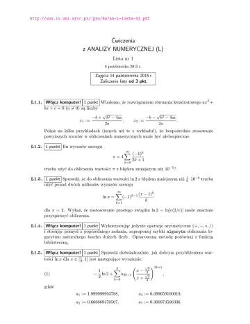 http://www.ii.uni.wroc.pl/~pwo/An/an-L-lista-01.pdf Ćwiczenia z ANALIZY NUMERYCZNEJ (L) Lista nr 1 8 paździenika 2015 r. Zajęcia 14 października 2015 r. Zaliczenie listy od 3 pkt. L1.1. Włącz komputer! 1 punkt Wiadomo, że rozwiązaniem równania kwadratowego ax2 + bx + c = 0 (a 6= 0) są liczby √ √ −b + b2 − 4ac −b − b2 − 4ac x1 := , x2 := . 2a 2a Pokaż na kilku przykładach (innych niż te z wykładu!), że bezpośrednie stosowanie powyższych wzorów w obliczeniach numerycznych może być niebezpieczne. L1.2. 1 punkt Ilu wyrazów szeregu π=4 ∞ X (−1)k 2k + 1 k=0 trzeba użyć do obliczenia wartości π z błędem mniejszym niż 10−5 ? L1.3. 1 punkt Sprawdź, że do obliczenia wartości ln 2 z błędem mniejszym niż użyć ponad dwóch milionów wyrazów szeregu 1 2 · 10−6 trzeba ∞ X (x − 1)k ln x = (−1)k−1 k k=1 dla x = 2. Wykaż, że zastosowanie prostego związku ln 2 = ln[e(2/e)] może znacznie przyspieszyć obliczenia. L1.4. Włącz komputer! 1 punkt Wykorzystując jedynie operacje arytmetyczne (+, −, ∗, /) i stosując pomysł z poprzedniego zadania, zaproponuj szybki algorytm obliczania logarytmu naturalnego bardzo dużych liczb. Opracowaną metodę porównaj z funkcją biblioteczną. L1.5. Włącz komputer! 1 punkt Sprawdź doświadczalnie, jak dobrym przybliżeniem wartości ln x dla x ∈ [ 12 , 1] jest następujące wyrażenie: 3 (1) X 1 − ln 2 + a2k+1 2 k=0 √ x− x+ 2 √2 2 2 !2k+1 , gdzie a1 := 1.999999993788, a3 := 0.399659100019, a5 := 0.666669470507, a7 := 0.300974506336. Następnie, wykorzystując wzór (1), zaproponuj efektywny algorytm obliczania z podobną dokładnością wartości ln x dla x > 0. Opracowaną metodę porównaj z funkcją biblioteczną. L1.6. 1 punkt W języku programowania PWO++ funkcja ACTan(x) oblicza z bardzo dużą dokładnością wartość arcctg(x), jednak tylko wtedy, gdy |x| ≤ 1. Wykorzystując funkcję ACTan, zaproponuj szkic algorytmu wyznaczającego w języku PWO++ wartości funkcji arcus cotangens z dużą dokładnością także dla |x| > 1. L1.7. Włącz komputer! 1 punkt Sprawdź, że całki Z 1 n x In := dx (n = 1, 2, . . .) 0 x+5 spełniają następującą zależność rekurencyjną: 6 1 (2) n = 1, 2, . . . ; I0 = ln . In + 5In−1 = n 5 Następnie wykorzystaj związek (2) do wyznaczenia wartości całek I1 , I2 , . . . , I20 wykonując obliczenia w arytmetyce pojedynczej precyzji (single). Czy wyniki są wiarygodne? Odpowiedź uzasadnij. L1.8. Włącz komputer! 2 punkty Na wykładzie pokazano, że użycie wzoru f (x + h) − f (x) (h – małe) h do przybliżenia wartości f 0 (x) nie jest dobrym pomysłem. Uzasadnij, że f (x + h) − f (x − h) , 2h a następnie zbadaj doświadczalnie przydatność wyrażenia f 0 (x) = lim h→0 f (x + h) − f (x − h) (h – małe) 2h do wyznaczania przybliżonej wartości pochodnej funkcji f w punkcie x. Czy stosowanie drugiego wzoru coś zmienia? Jak to wytłumaczyć? (–) Paweł Woźny – Czyli, że zasadniczo Pan się musi na tym rozeznać całkowicie żeby wiedzieć ile i gdzie. . . – Dotychczas tak było, ale teraz mamy komputer. Może Pan pisać co tylko Pan chce to nie ma żadnego znaczenia. – Komputer? – Eeee, on się i tak zawsze pomyli przy dodawaniu, proszę pana. Nie było miesiąca, żeby się nie pomylił. – Czyli, że teraz nie trzeba się tak znać na robocie? – A teraz już nie. Teraz jest dużo łatwiej, jest proszę pana. Miś, reż. S. Bareja, 1980. 2
