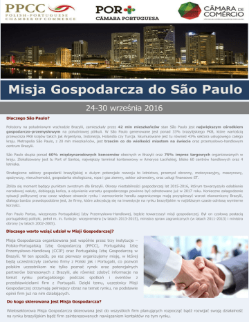 Misja Gospodarcza do São Paulo 24-30 września 2016 Dlaczego São Paulo? Położony na południowym wschodzie Brazylii, zamieszkały przez 42 mln mieszkańców stan São Paulo jest największym ośrodkiem gospodarczo-przemysłowym na południowej półkuli. W São Paulo generowane jest ponad 33% brazylijskiego PKB, które wartością przewyższa PKB krajów takich jak Argentyna, Indonezja, Holandia czy Turcja. Skumulowane jest tu również 43% sektora usługowego całego kraju. Metropolia São Paulo, z 20 mln mieszkańców, jest trzecim co do wielkości miastem na świecie oraz przemysłowo-handlowym centrum Brazylii. São Paulo skupia ponad 60% międzynarodowych koncernów obecnych w Brazylii oraz 75% imprez targowych organizowanych w kraju. Zlokalizowany jest tu Port of Santos, największy terminal kontenerowy w Ameryce Łacińskiej, blisko 60 centrów handlowych oraz 4 lotniska. Strategiczne sektory gospodarki brazylijskiej o dużym potencjale rozwoju to lotnictwo, przemysł obronny, motoryzacyjny, maszynowy, spożywczy, nieruchomości, gospodarka ekologiczna, ropa i gaz ziemny, sektor zdrowotny, oraz usługi finansowe iIT. Zbliża się moment będący punktem zwrotnym dla Brazylii. Okresy niestabilności gospodarczej lat 2015-2016, którym towarzyszyło osłabienie narodowej waluty, dobiegają końca, a ożywienie wzrostu gospodarczego powinno być odnotowane już w 2017 roku. Konieczne załagodzenie sytuacji politycznej oraz coraz większe otwarcie rynku i wzmocnienie handlu zagranicznego mają przyspieszyć wzrost ekonomiczny Brazylii, dlatego bardzo prawdopodobne jest, że firmy, które zdecydują się na inwestycje na rynku brazylijskim w najbliższym czasie odniosą wymierne korzyści. Pan Paulo Portas, wiceprezes Portugalskiej Izby Przemysłowo-Handlowej, będzie towarzyszył misji gospodarczej. Był on czołową postacią portugalskiej polityki, pełnił m. in. funkcje: wicepremiera (w latach 2013-2015), ministra spraw zagranicznych (w latach 2011-2013) i ministra obrony (w latach 2002-2005). Dlaczego warto wziąć udział w Misji Gospodarczej? Misja Gospodarcza organizowana jest wspólnie przez trzy instytucje – Polsko-Portugalską Izbę Gospodarczą (PPCC), Portugalską Izbę Przemysłowo-Handlową (CCIP) oraz Portugalską Izbę Gospodarczą w Brazylii. W ten sposób, po raz pierwszy organizujemy misję, w której będą uczestniczyły zarówno firmy z Polski jak i Portugalii, co pozwoli polskim uczestnikom nie tylko poznać rynek oraz potencjalnych partnerów biznesowych z Brazylii, ale również zdobyć informacje na temat rynku portugalskiego podczas spotkań i eventów z przedstawicielami firm z Portugalii. Dzięki temu, uczestnicy Misji Gospodarczej otrzymają pełniejszy obraz na temat rynku, na podstawie opinii firm już na nim działających. Do kogo skierowana jest Misja Gospodarcza? Wielosektorowa Misja Gospodarcza skierowana jest do wszystkich firm planujących rozpocząć bądź rozwijać swoją działalność na rynku brazylijskim bądź firm zainteresowanych nawiązaniem kontaktów na tym rynku. Jakie są cele Misji Gospodarczej? Celem Misji Gospodarczej jest zapoznanie uczestników z możliwościami biznesowymi rynku brazylijskiego oraz umożliwienie nawiązania kontaktów z ważnymi podmiotami sektora biznesowego: informacja na temat środowiska biznesowego Brazylii; spotkania B2B firmami oraz przedsiębiorcami w São Paulo, zgodnie z profilem każdego z uczestników; nawiązanie kontaktów z ważnymi partnerami lokalnymi; nawiązanie kontaktu z Portugalską Izbą Gospodarczą w Brazylii oraz Portugalską Izbą PrzemysłowoHandlową; nawiązanie kontaktów z lokalnymi instytucjami rządowymi, wspierającymi inwestycje zagraniczne w Brazylii; poznanie najważniejszych graczy na rynku, konkurencji oraz profilu konsumentów; nawiązanie kontaktów z przedstawicielami polskich firm na rynku brazylijskim; nawiązanie kontaktów z portugalskimi firmami uczestniczącymi w Misji Gospodarczej. Co zapewniamy? przelot w klasie ekonomicznej Warszawa/São Paulo/Warszawa; transfery lotnisko / hotel / lotnisko; pobyt w **** hotelu w São Paulo; ubezpieczenie podróżne; umówienie indywidualnych spotkań B2B z potencjalnymi partnerami biznesowymi i klientami; umówienie spotkań z lokalnymi instytucjami rządowymi; networking z lokalnym środowiskiem biznesowym oraz firmami portugalskimi; lokalne wsparcie przy spotkaniach B2B; wsparcie oraz obecność przedstawiciela PPCC podczas trwania misji; spersonalizowane wsparcie oraz follow-up. Agenda 24 września 06:00 Wylot z Warszawy 17:15 przylot do São Paulo || transfer do hotelu 25 września czas wolny 18:00 briefing na temat poszczególnych spotkań B2B 19:30 kolacja 26 września 09:00-17:00 spotkania indywidualne uczestników misji zgodnie z profilem poszczególnych firm 19:00 kolacja 27 września 09:00-17:00 spotkania indywidualne uczestników misji zgodnie z profilem poszczególnych firm 19:00 kolacja 28 września 09:00-17:00 spotkania indywidualne uczestników misji zgodnie z profilem poszczególnych firm 19:00 kolacja 29 września 12:30 transfer na lotnisko 15:45 odlot do Warszawy 30 września 11:55 przylot do Warszawy KOSZT UCZESTNICTWA Członek PPCC: 3.500€ + VAT Pozostałe firmy: 3.700€ + VAT Aby zgłosić firmę do udziału w misji, prosimy o wypełnienie formularza dostępnego pod tym linkiem do 31 lipca 2016 oraz o przesłanie prezentacji firmy w j. angielskim w formacie PDF lub PPT (max. 5 MB) do Pana Wojciecha Baczyńskiego, Sekretarza Generalnego PPCC, na adres: [email protected] Izba Gospodarcza zastrzega sobie prawo do odwołania misji w przypadku, w którym nie zostanie zebrana minimalna liczba firm. Aby dowiedzieć się więcej o Misji Gospodarczej, prosimy o kontakt z : Wojciech Baczyński, Sekretarz Generalny PPCC – [email protected], 696 760 925